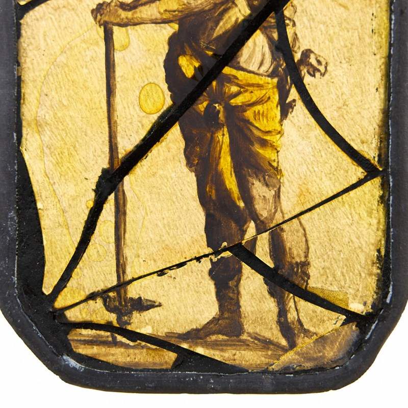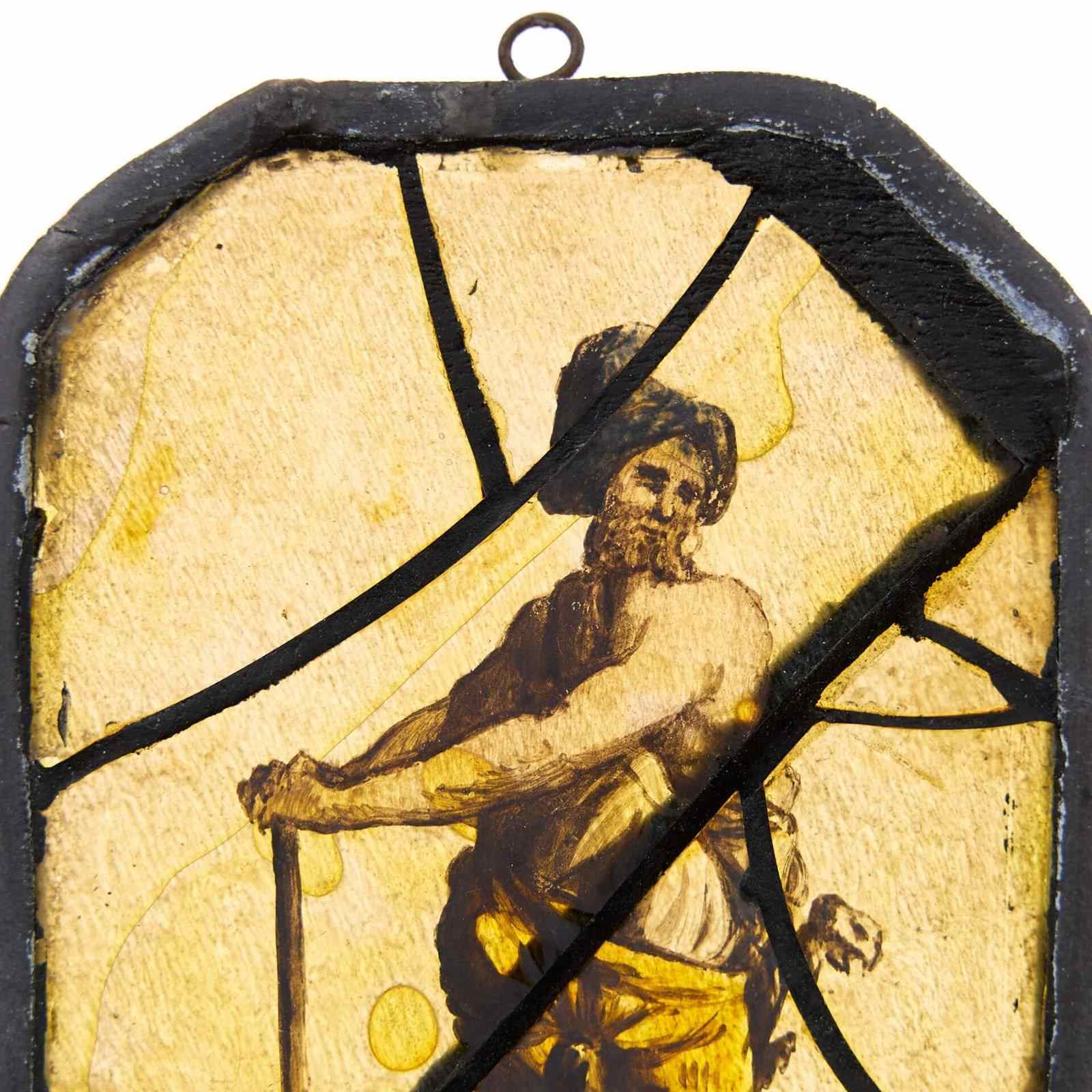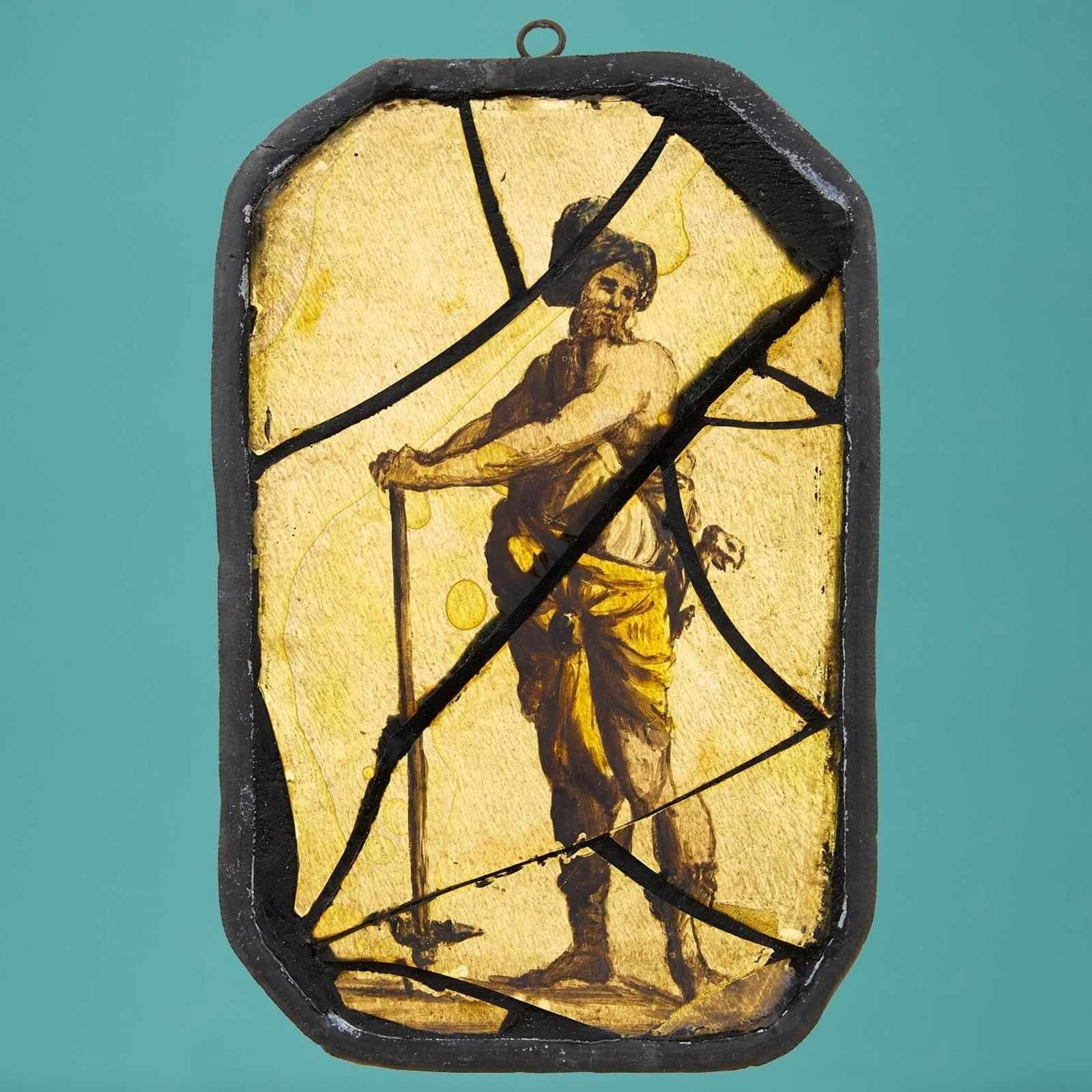 An antique stained glass panel of a neoclassical figure thought to be a tradesman with his tools. Dating to circa 1780, this stained glass panel has stood the test of time showcasing precision, detail and good quality craftsmanship.