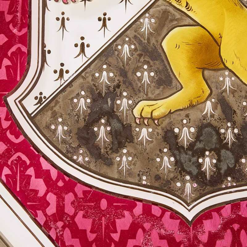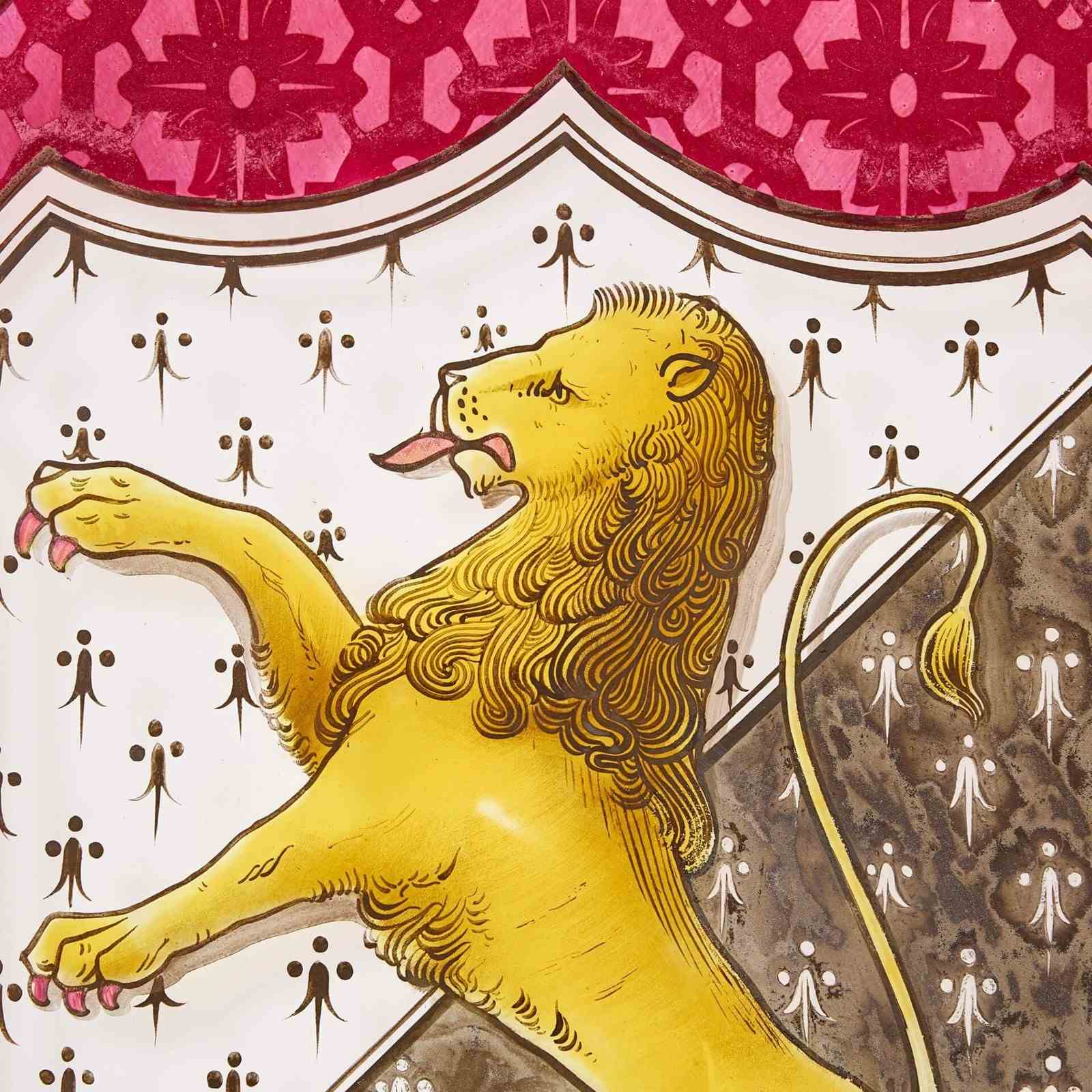 This diamond-shaped window is an impressive piece, steeped in heritage, featuring a central armorial crest. It depicts the coat of arms of the Tudor Trefor family within red stained glass and displays a lion with claws raised in a reared up rampant position.