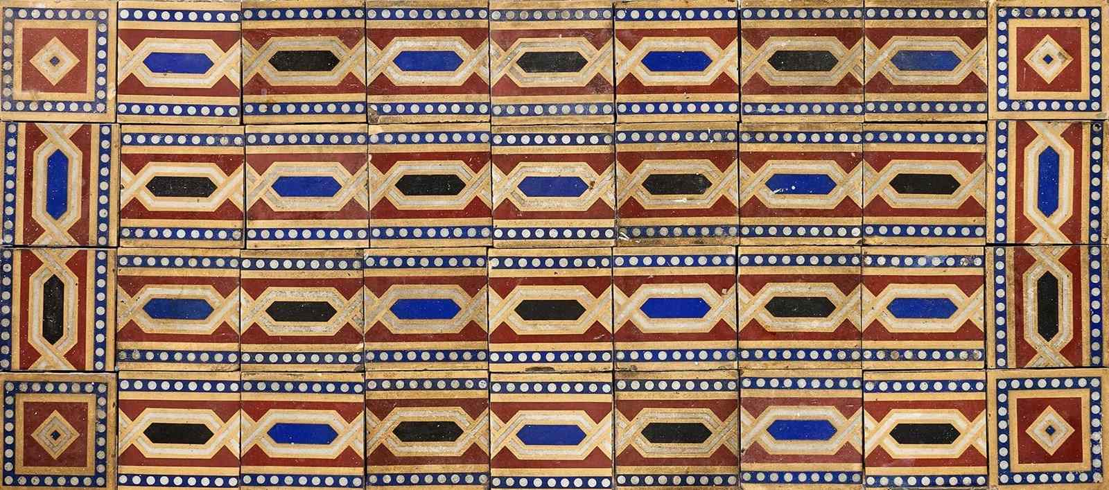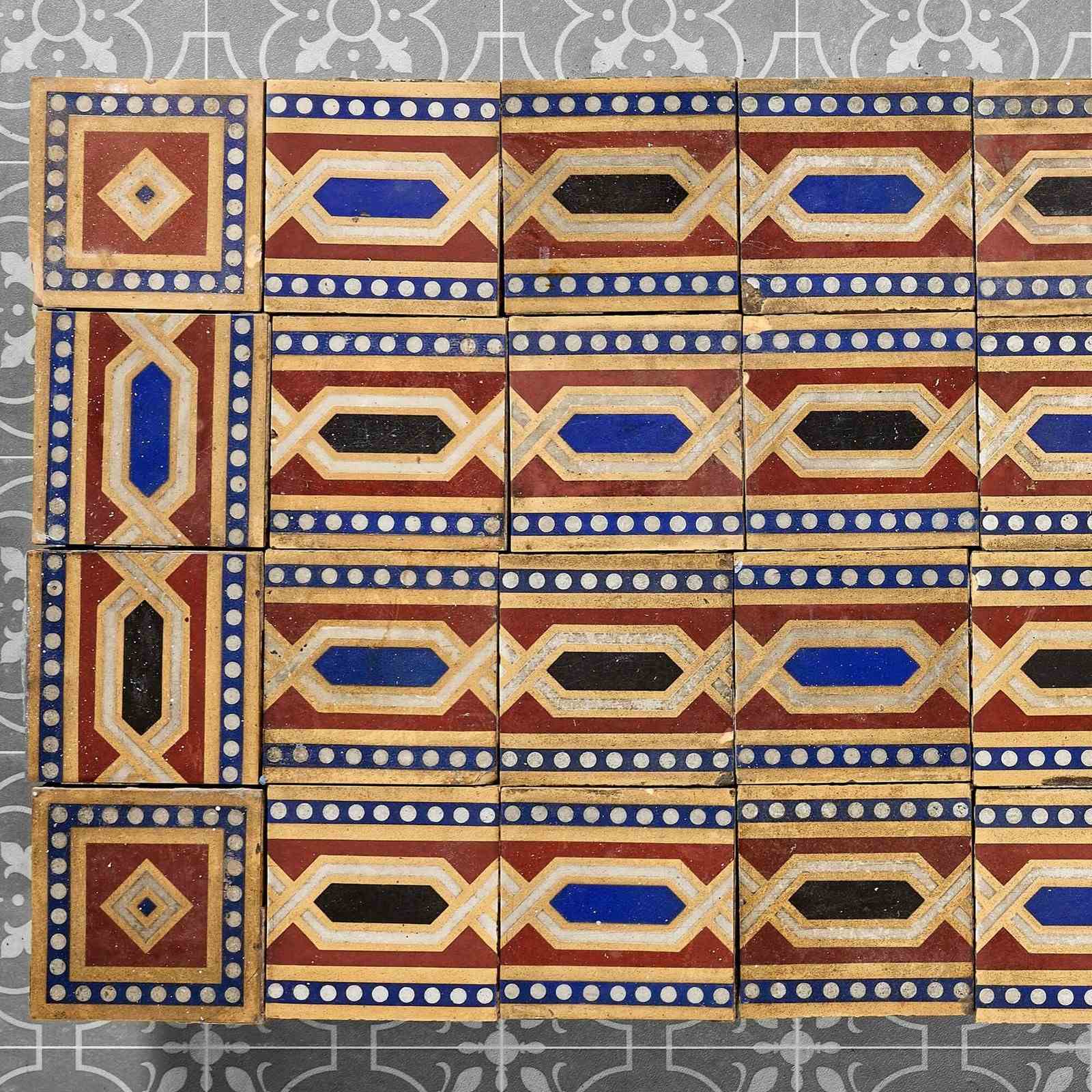 A 36-piece set of 6-inch tiles by W. Godwin of Lugwardine in Herefordshire, perfect for use as an antique tile splashback, porch floor or fireplace hearth. Dating from the 19th century, these antique tiles together form an eye-catching geometric pattern consisting of black, blue and red colours that bring life and interest to even the smallest of spaces. These reclaimed tiles are over 150 years old. As such, each has a characterful, timeworn look with scuffs and marks here and there that only enhances the beauty of these striking patterned tiles.