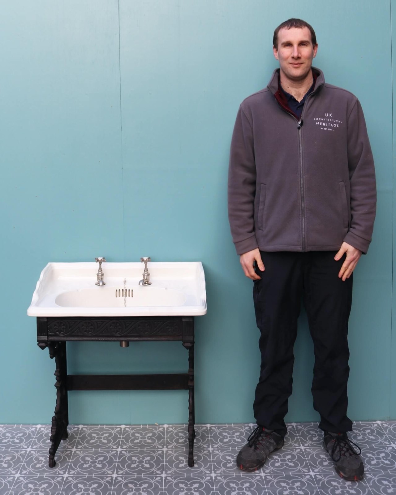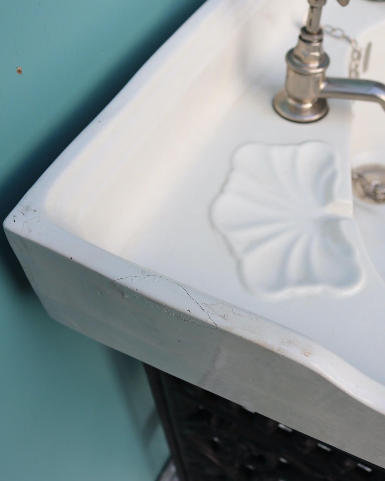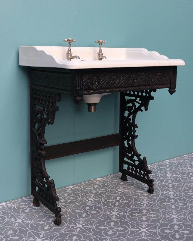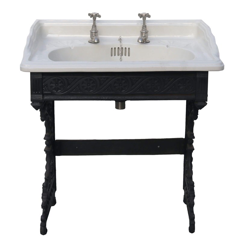 An antique Victorian porcelain sink on an ornate cast iron sink stand dating from the 1880s. This beautifully designed sink is perfect for an elegant cloakroom, Victorian style bathroom or vintage ensuite. It features a painted cast iron wash stand below a porcelain sink with a short splashback, replacement nickel-plated taps and integrated ginkgo leaf-shaped soap dishes to either side. This Victorian bathroom sink has stood the test of time for more than 140 years, becoming a beautiful timepiece of any period bathroom. There is a historic repair to top left of the sink (pictured).