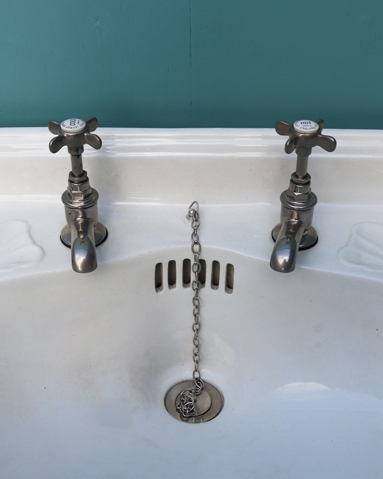 Good structural condition. Iron stand is in good condition. Sink has replacement taps, waste and chain. Taps turn but are not tested. Some minor discolouration and wear to the glaze. Chips and historic repair to the top left of the splash back.