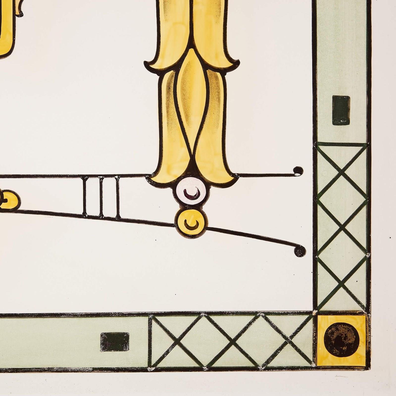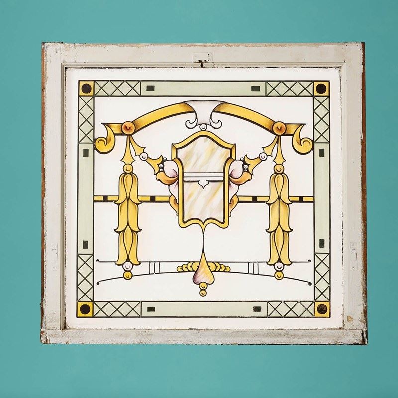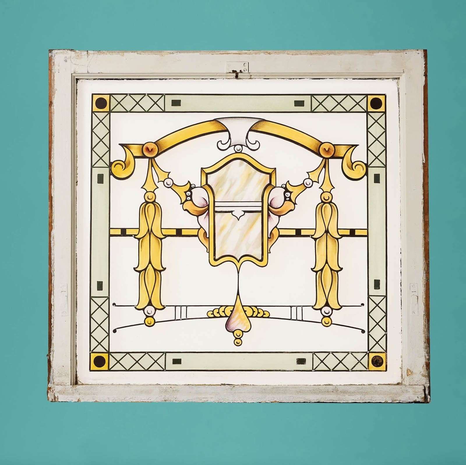 An early 20th century stained glass window, beautifully etched with Art Nouveau style details.