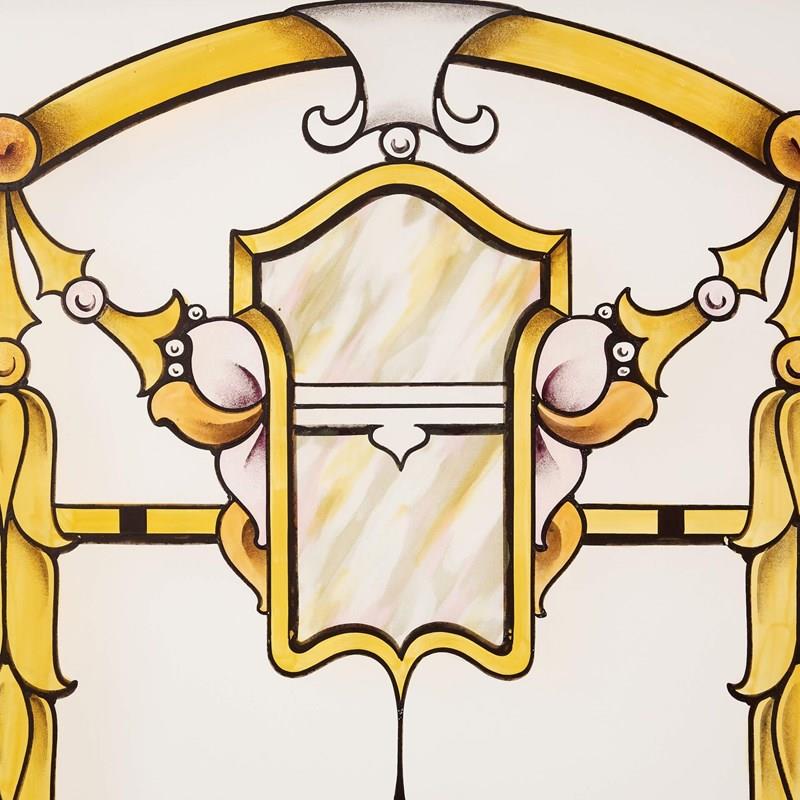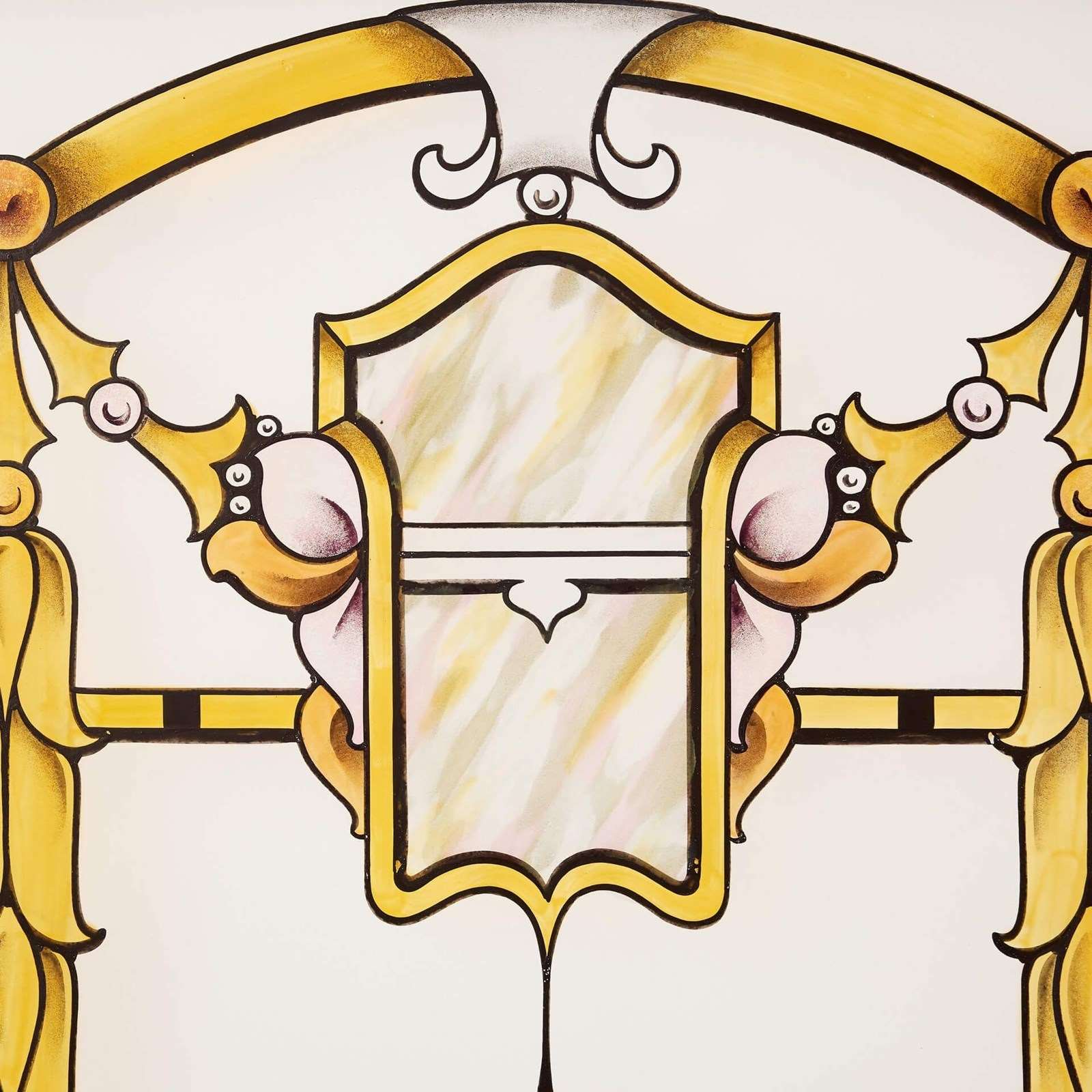The design is evocative of styling typical of the Art Nouveau period, stained with shades of pale green, pink and vibrant gold, and elegantly etched with intricate arched lines and organic stylised patterns.