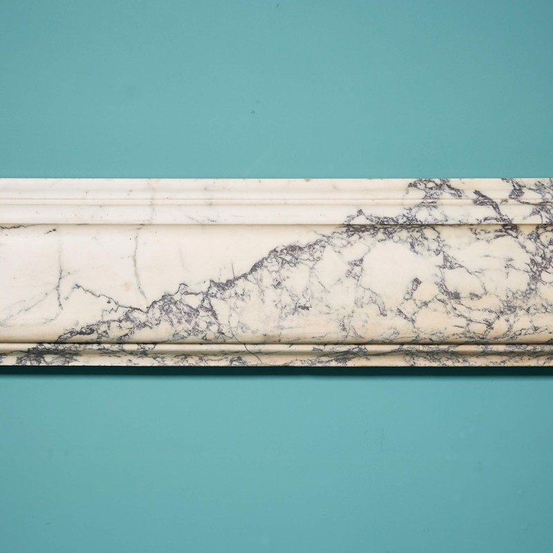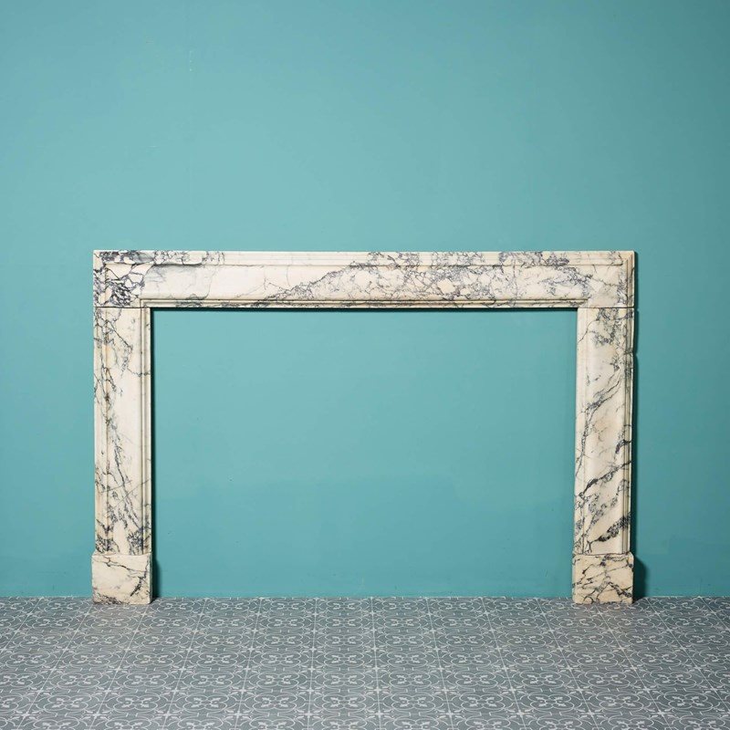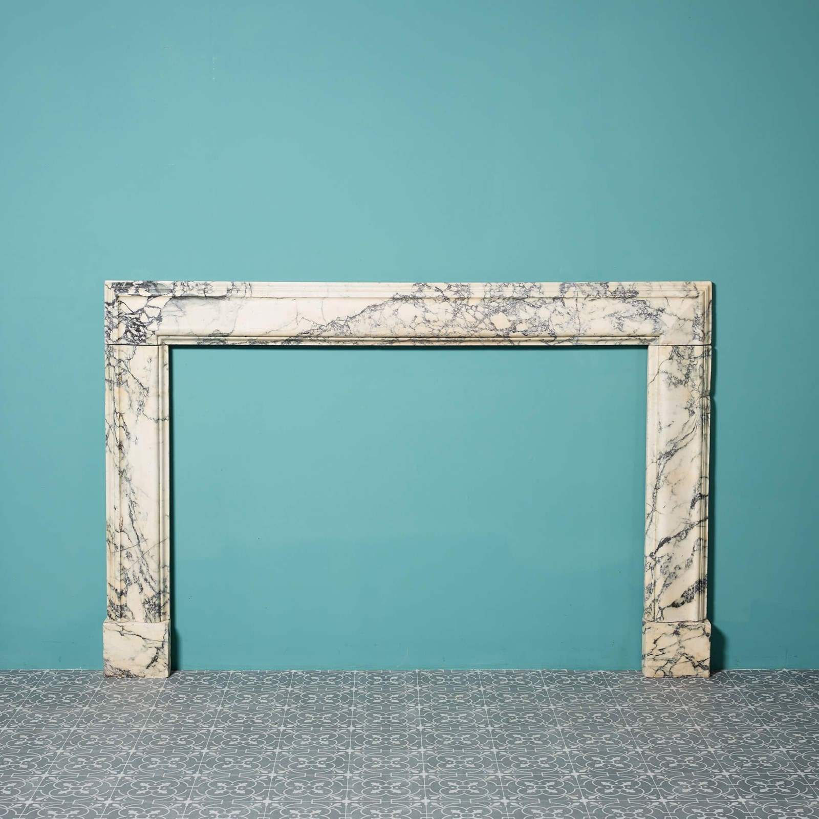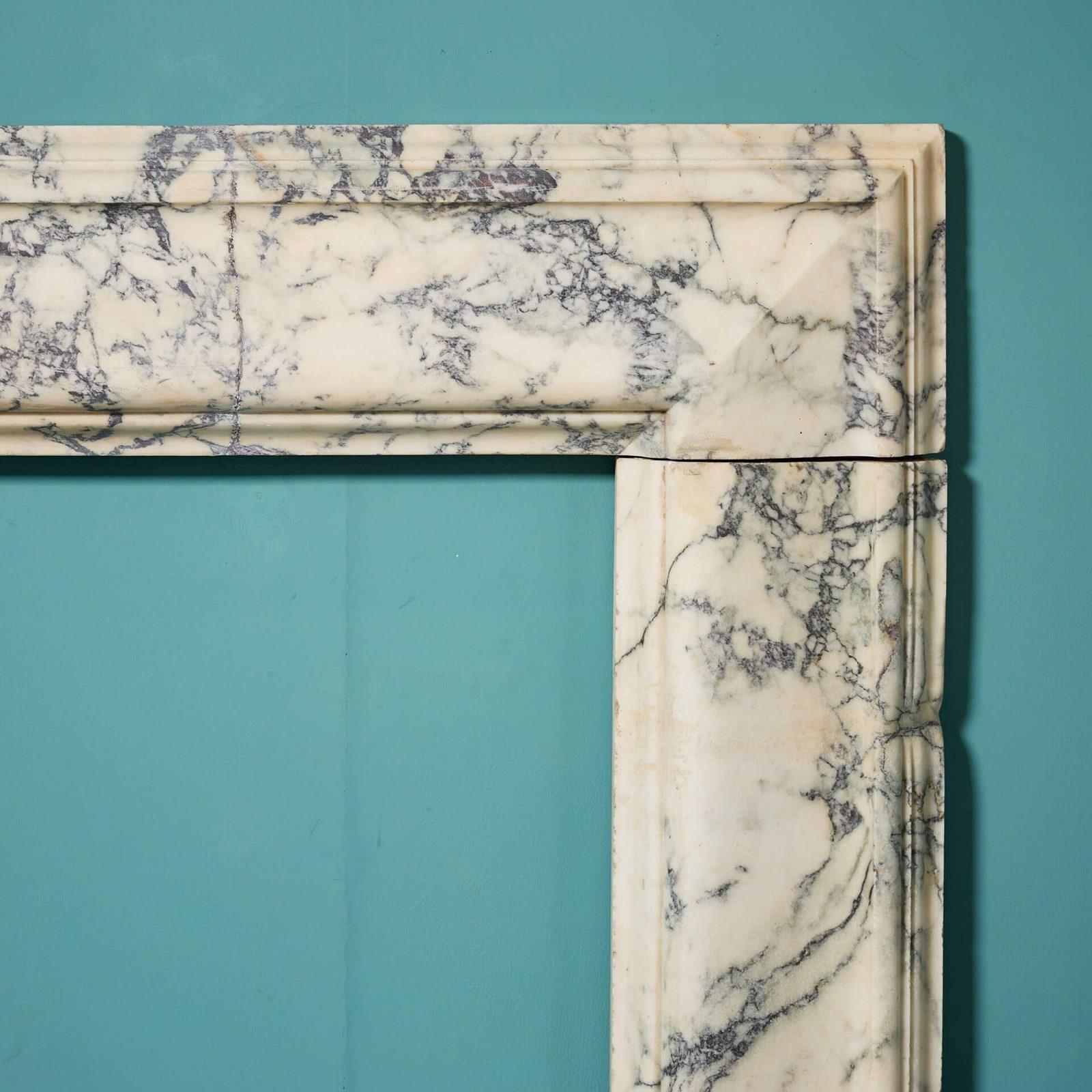 A Breche Violette marble fireplace surround in the bolection style, dating from the late 18th century. Its large size indicates that it was likely once used in a main room, perhaps as a decorative marble fireplace surround in the drawing room of a large property. Sourced from a country house in Shropshire, this antique marble fireplace is creamy white in colour outlined with veins in purple shades, making for a striking design. Though this marble bolection fireplace has lived for more than 200 years and has a slightly discoloured, time-worn appearance and discreet historical repair to the top, it is in good condition. The marble showcases a beautiful patina, decorated with a moulded frieze and jambs. This design is simply timeless bringing elegance to both modern and traditional settings alike.