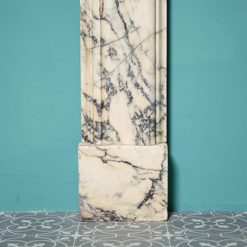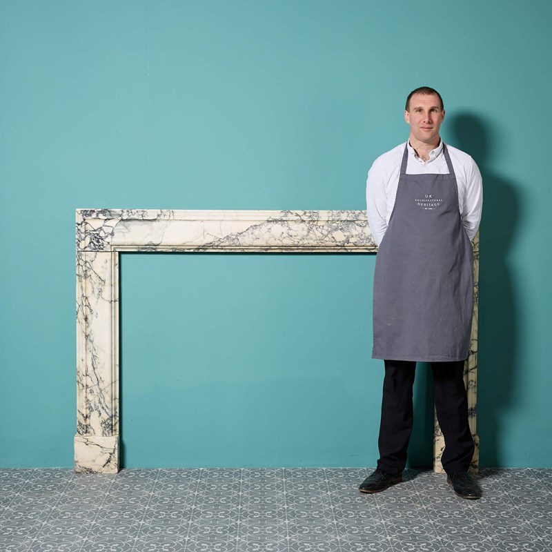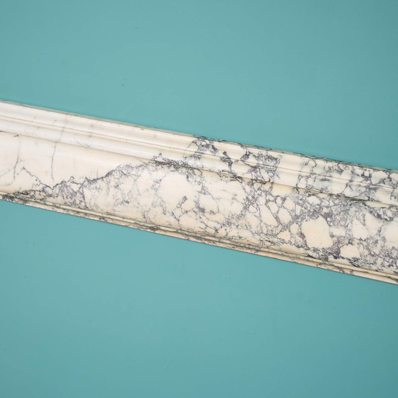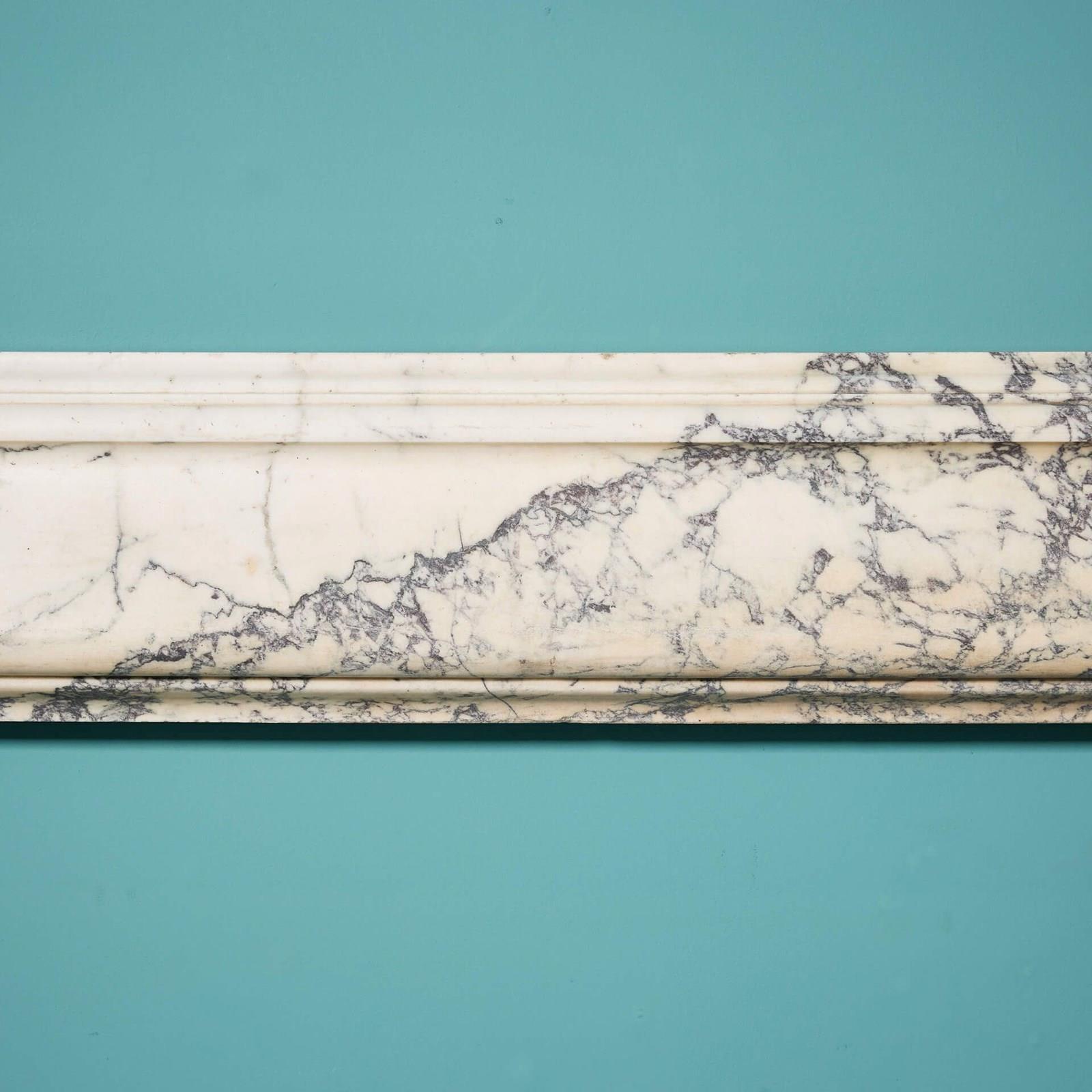 A Breche Violette marble fireplace surround in the bolection style, dating from the late 18th century. Its large size indicates that it was likely once used in a main room, perhaps as a decorative marble fireplace surround in the drawing room of a large property. Sourced from a country house in Shropshire, this antique marble fireplace is creamy white in colour outlined with veins in purple shades, making for a striking design. Though this marble bolection fireplace has lived for more than 200 years and has a slightly discoloured, time-worn appearance and discreet historical repair to the top, it is in good condition. The marble showcases a beautiful patina, decorated with a moulded frieze and jambs. This design is simply timeless bringing elegance to both modern and traditional settings alike.