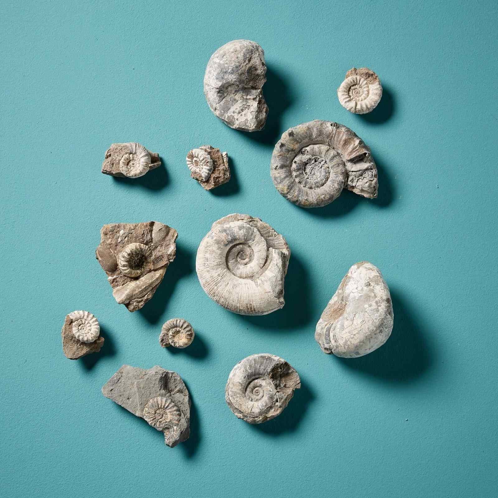 An interesting collection of twelve natural, prehistoric English ammonite fossil specimens of varying shapes and sizes – ranging from 9.5 cm (3.74 in) wide to 2.5cm wide (0.98 in). Ex. private collection of David Thomas Turner (1945-2023).