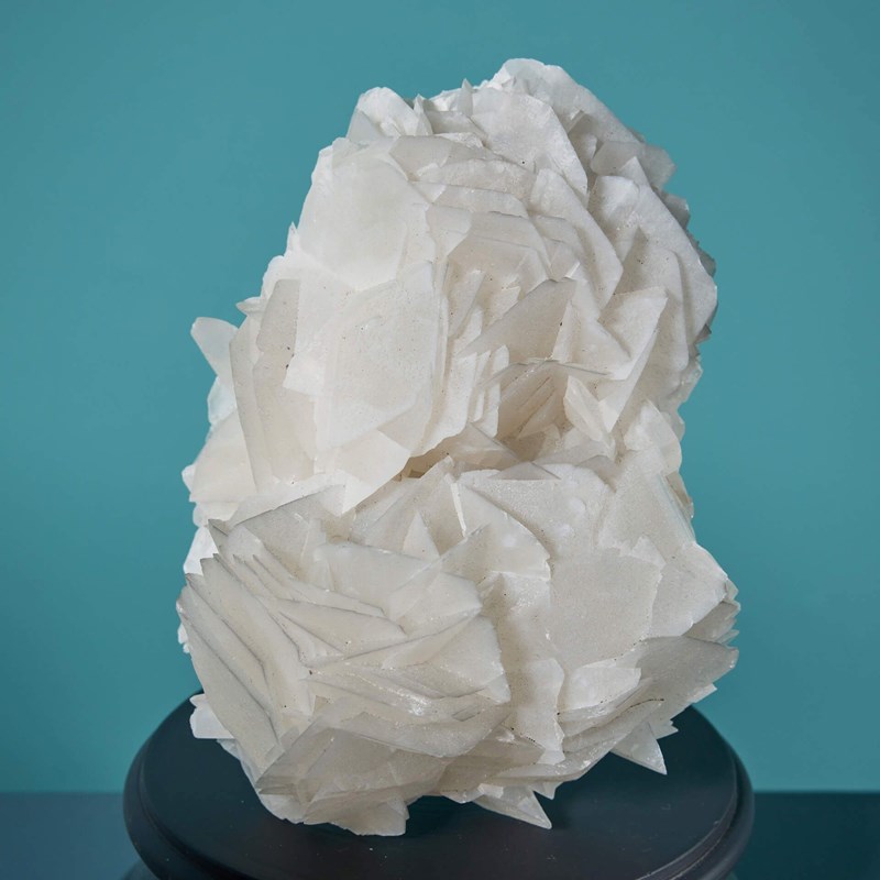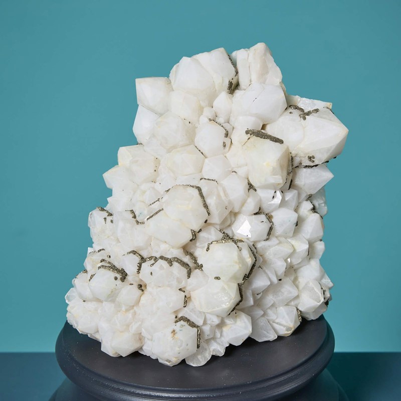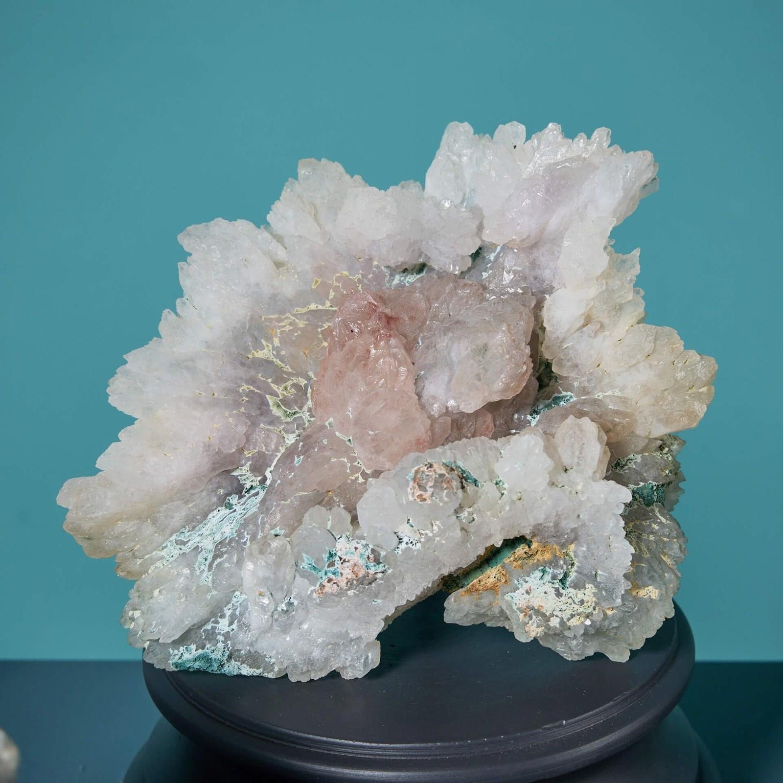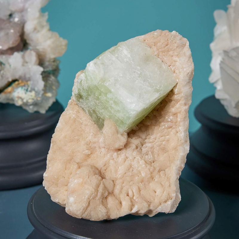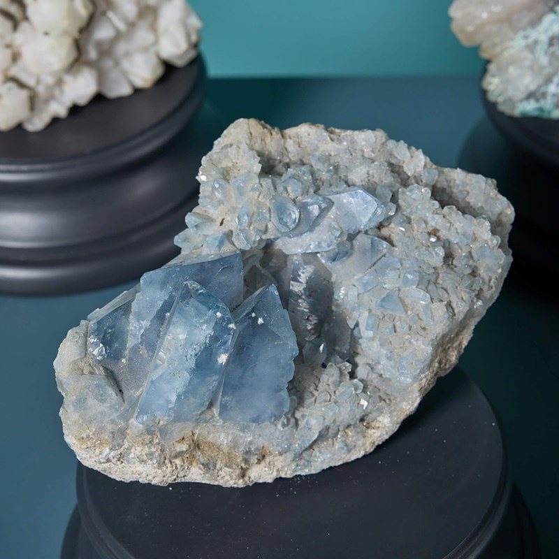 Highlights from this group of large cabinet specimens include a celestite, recognisable by its pale sky-blue colour; a quartz crystal with pyrite inclusions sourced from Cornwall; a green apophyllite on a peach stilbite matrix; a white calcite with interlocking blade clusters of Chinese origin, and a further unidentified mineral.