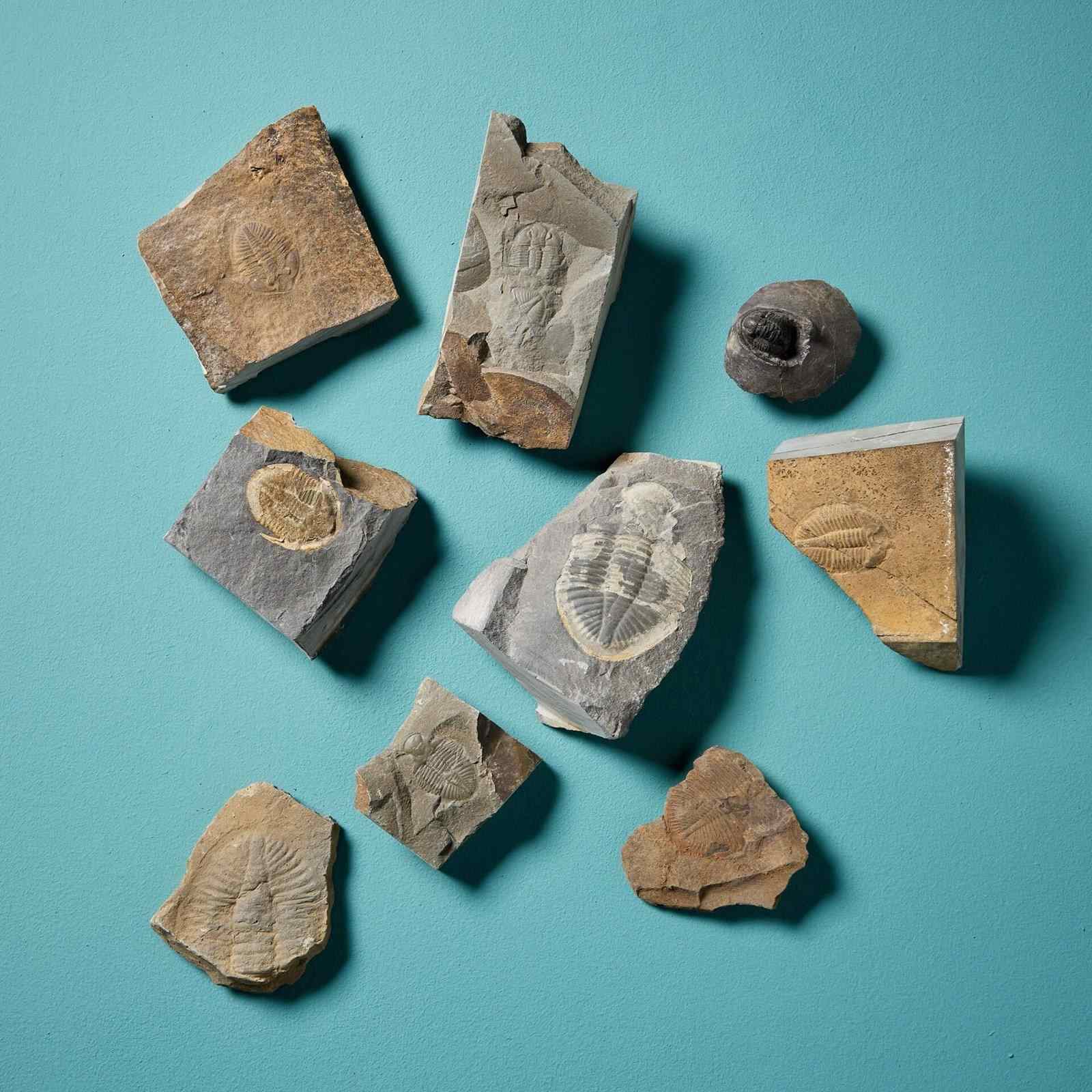 A fascinating collection of nine natural, prehistoric fossilised Welsh trilobite specimens of varying shapes and sizes – ranging from 12 cm (2.72 in) to 5 cm (1.97 in). Ex. private collection of David Thomas Turner (1945-2023).