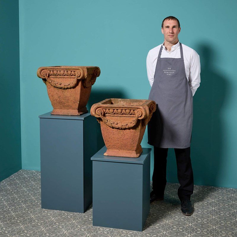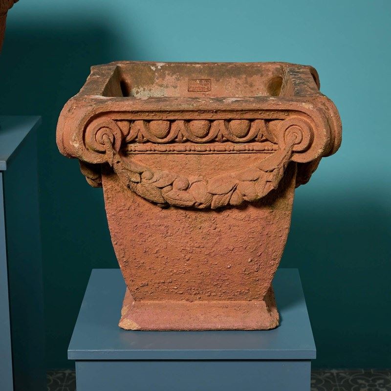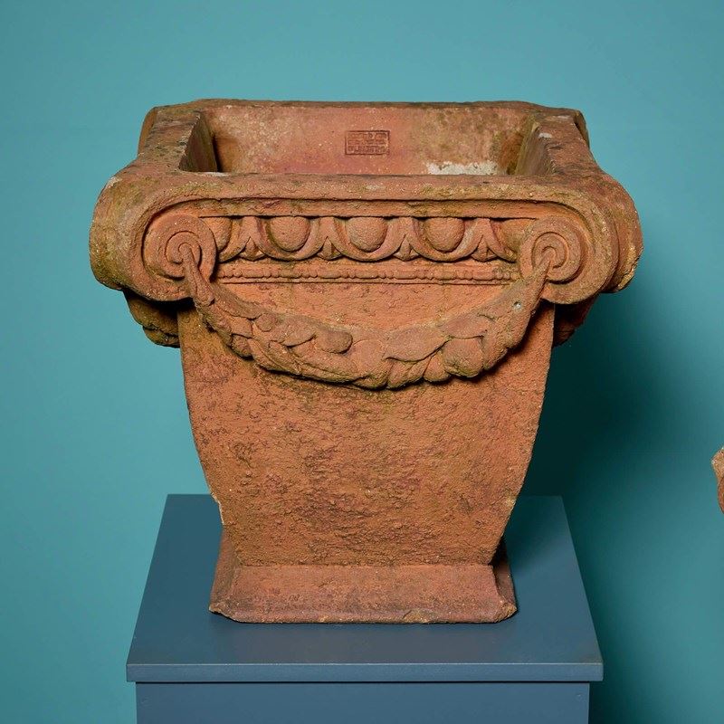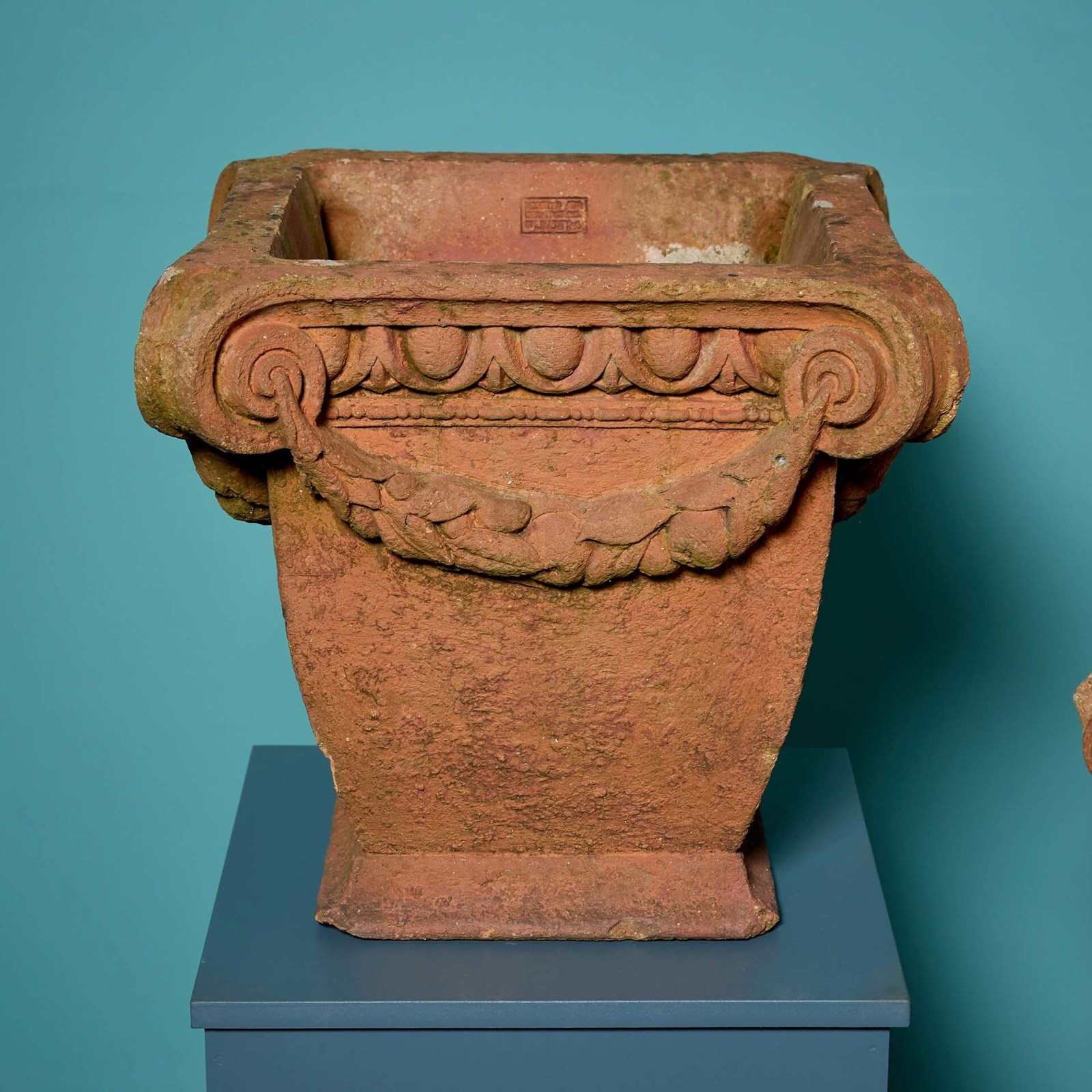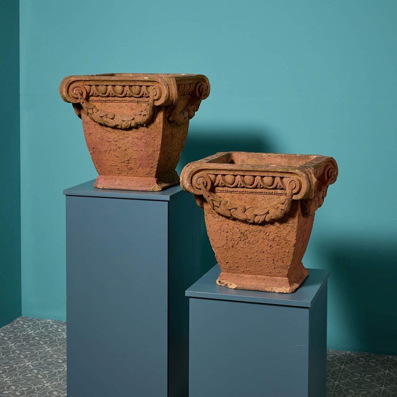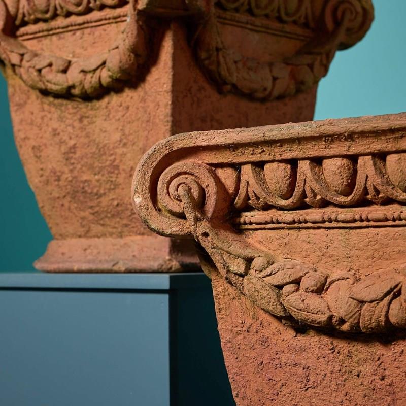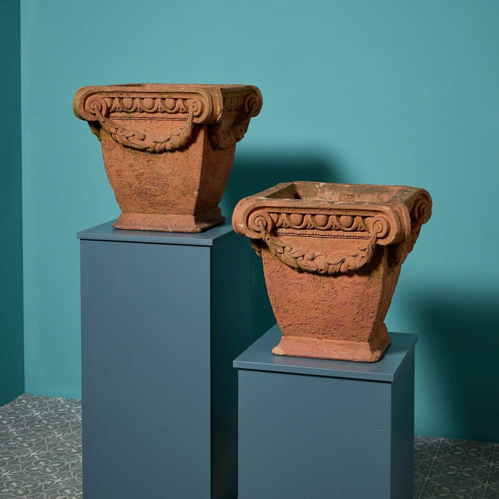 Dating from the early 20th century, these reclaimed terracotta planters are handcrafted to a matching neoclassical style design, with scrolling ionic column style corners, an egg and dart trim and foliage swags to all four sides.