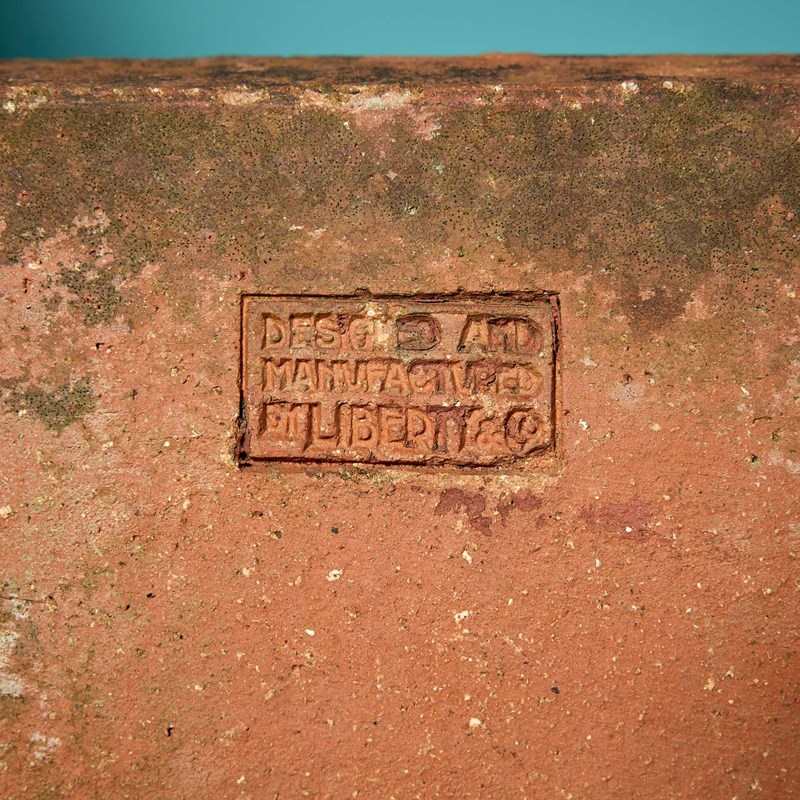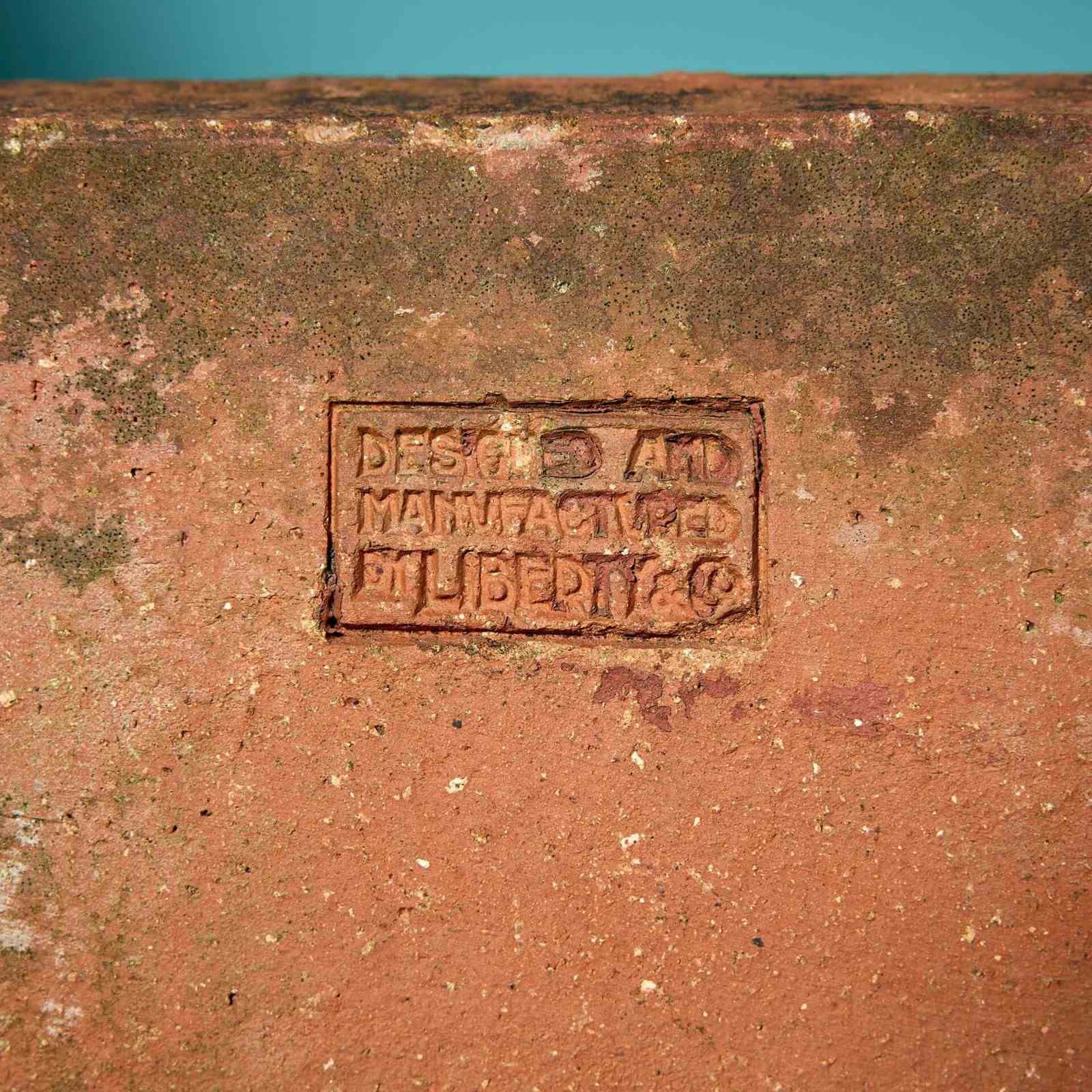 A matching pair of antique neoclassical style terracotta pots, stamped Liberty & Co and attributed to Compton Pottery.