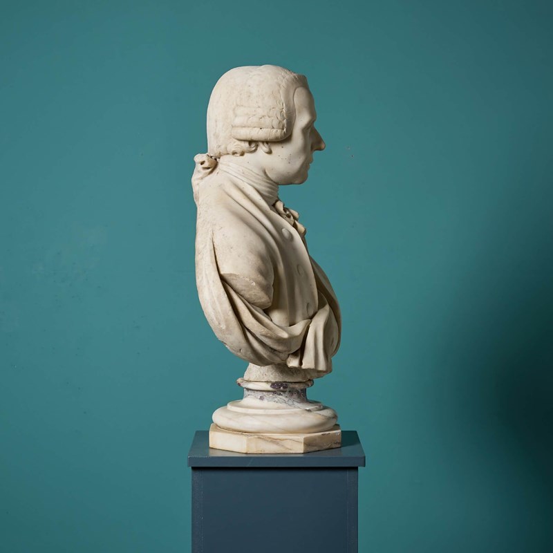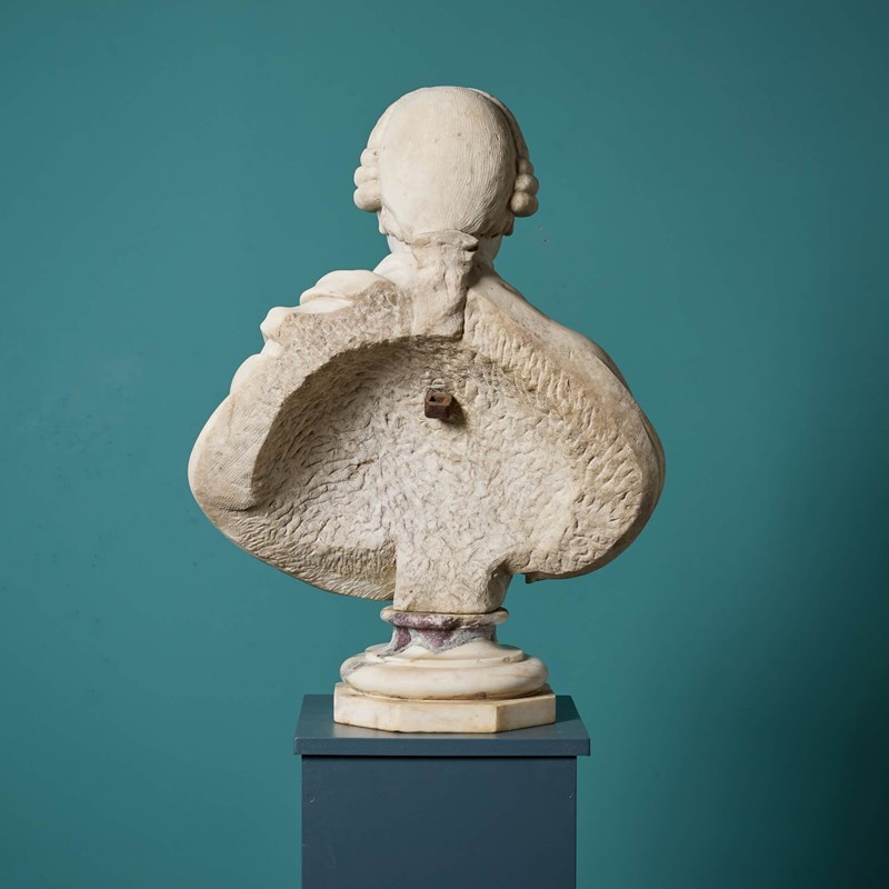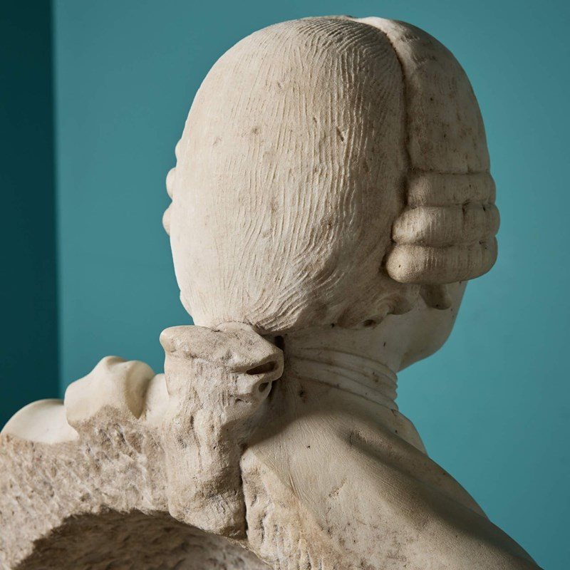 Exceptionally carved, the gentleman has a scholarly presence about him, wearing a wig atop his head, a waistcoat to his chest and a jacket around his shoulders. While the name of the subject is unknown, one would assume from his attire that the bust takes the likeness of an 18th century person of note such as a lawyer, barrister or MP.