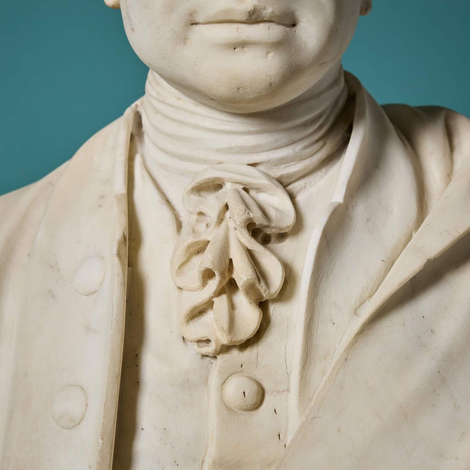 Over 230 years old, this antique marble bust has stood the test of time with details of the gentleman's face and clothing still clear and distinctive after more than two centuries. Steeped in history, you can just imagine this large bust once stood upon a pedestal in the grand hallway of a period Georgian townhouse.