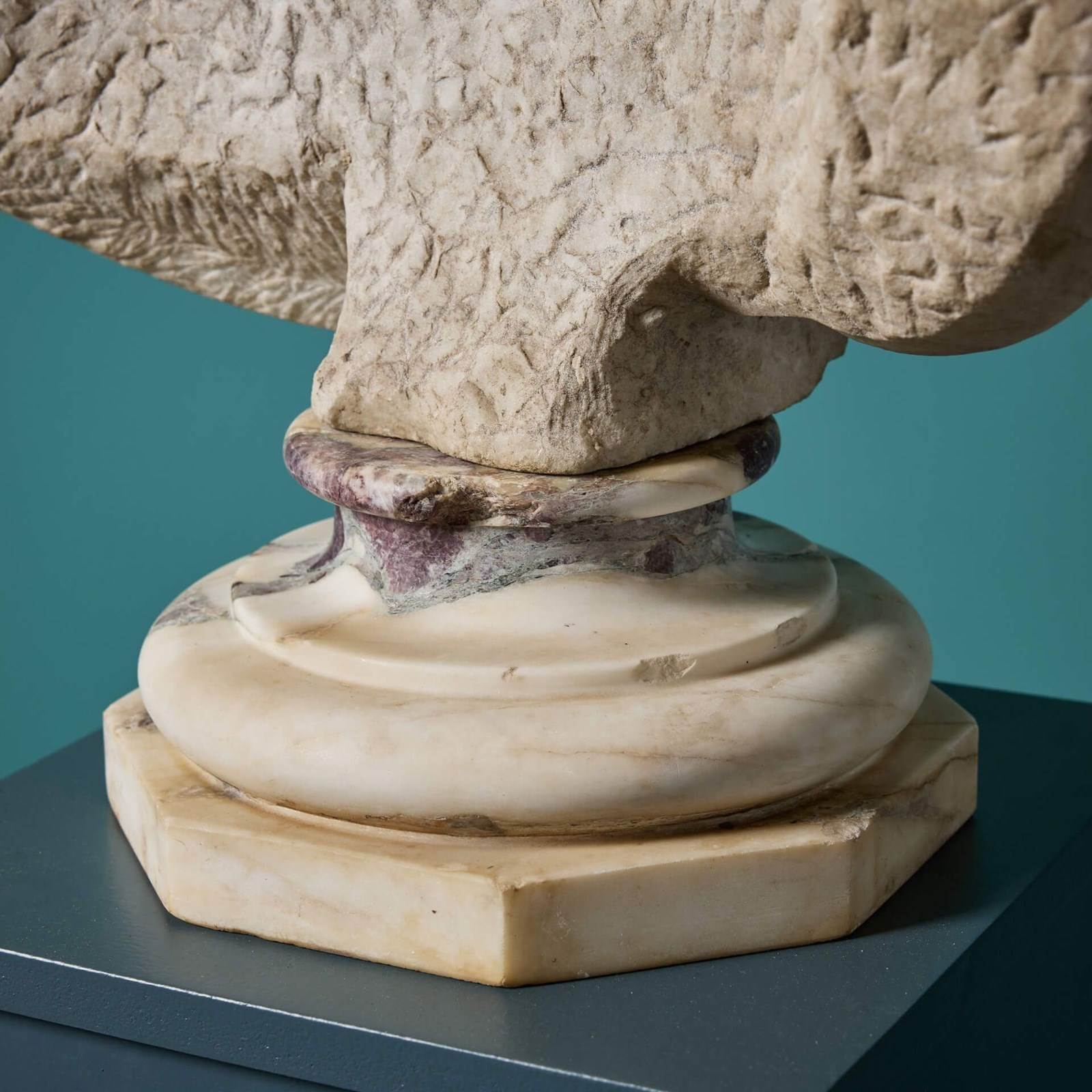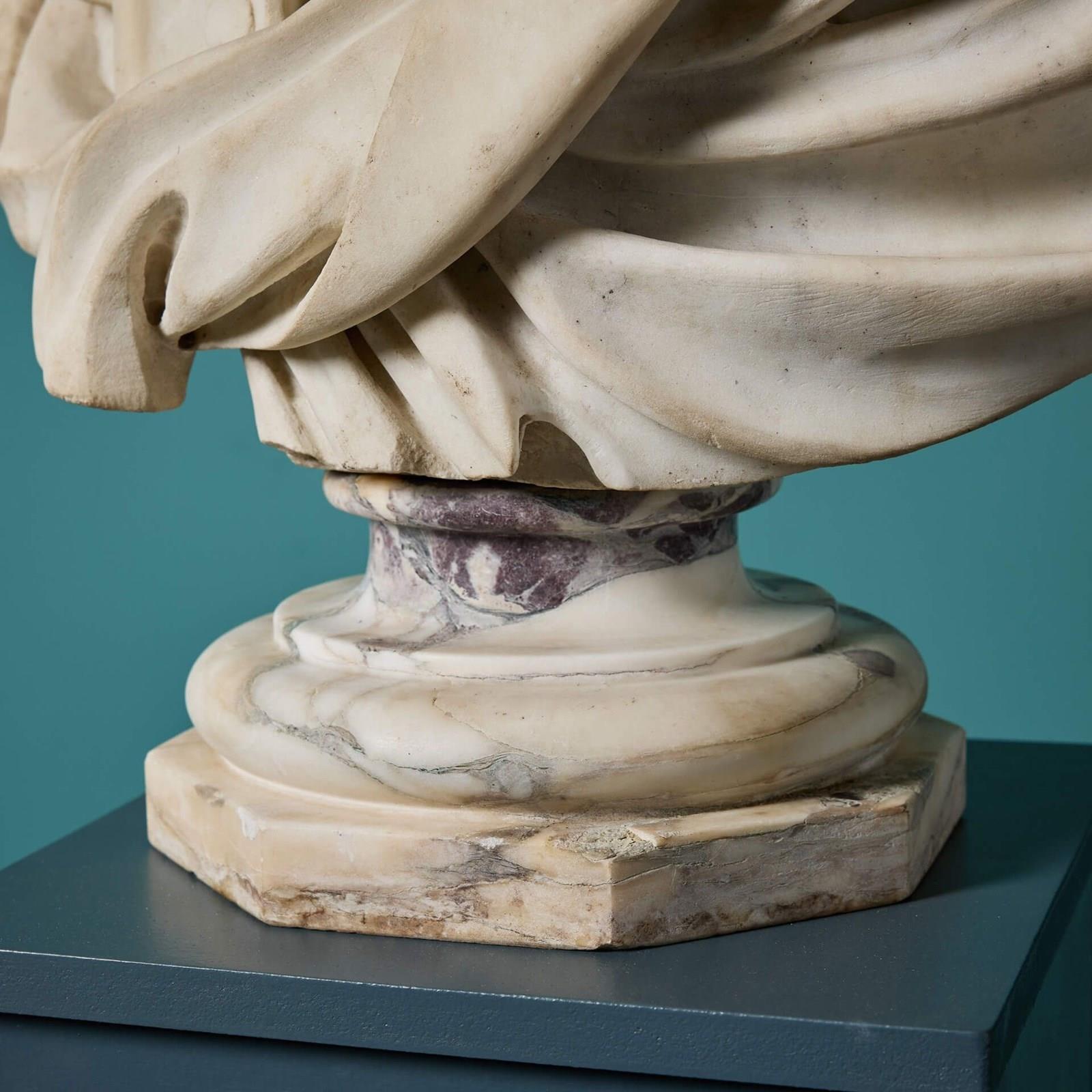 Good structural condition. Associated period socle. Lightly tarnished/stained surface finish. Several small chips to folds of the cloak. Some minor pitting to the face; these are natural flaws in the marble. Unsigned. Comes as 2 pieces: bust and socle.