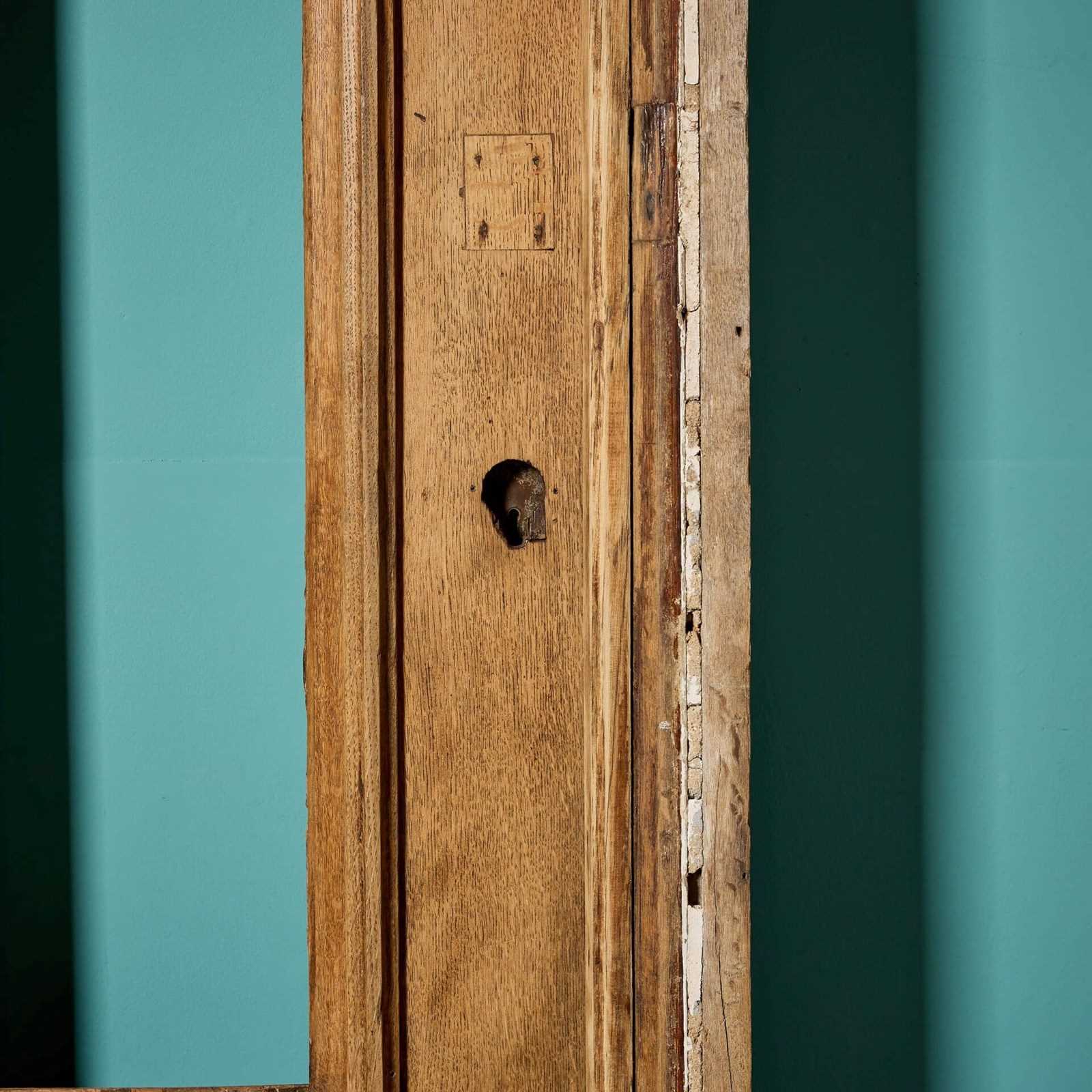 Good structural condition. No glass. Stripped finish. Small losses and wear as expected from age and use. Historic repairs and alterations. Replacement oak sill. On one side of the opening, there is a piece of stained plywood which forms the top of the arch.
