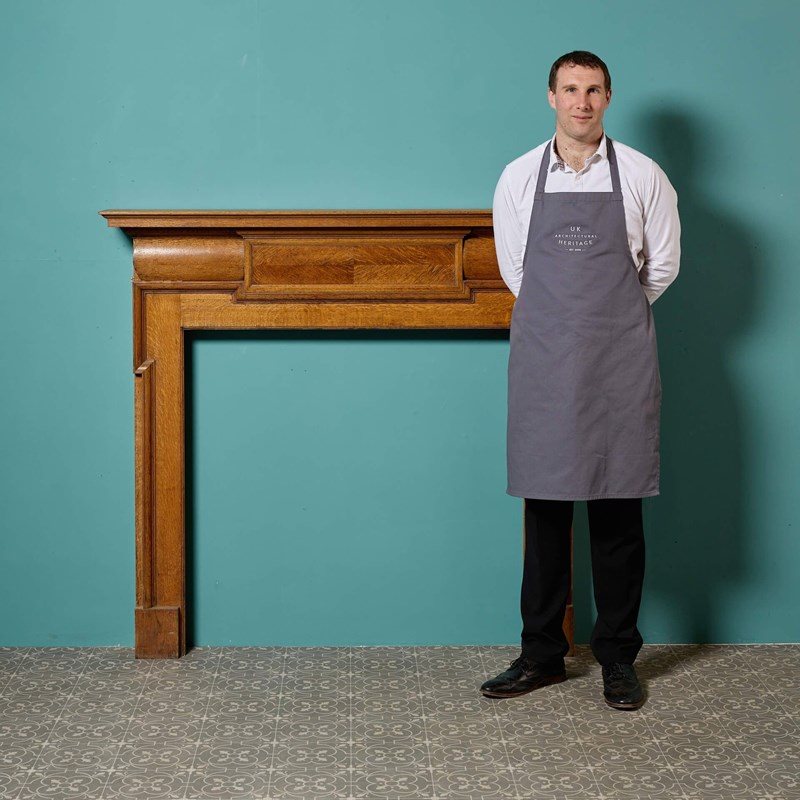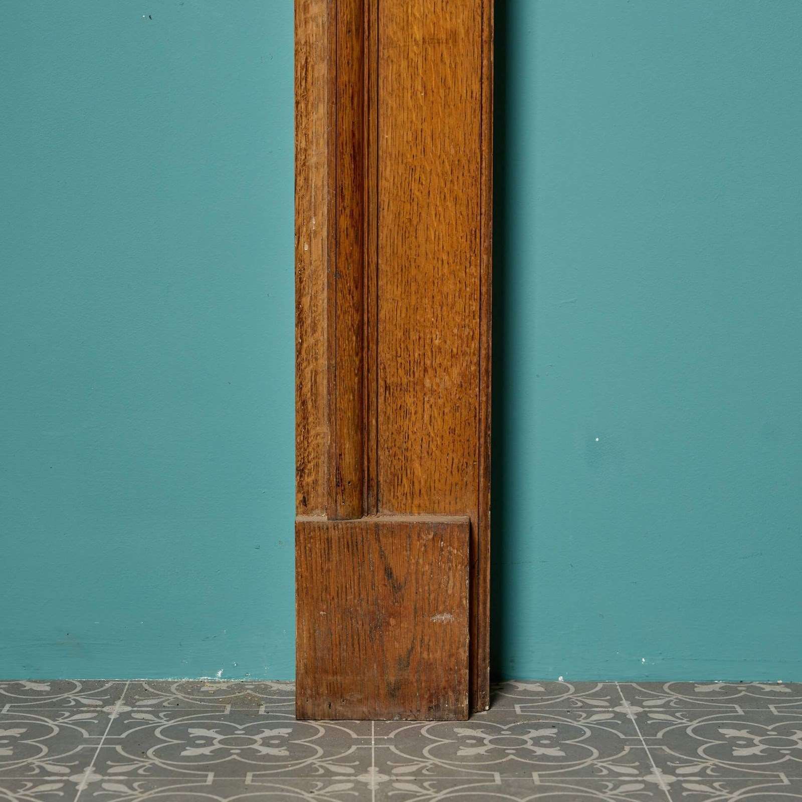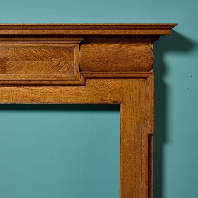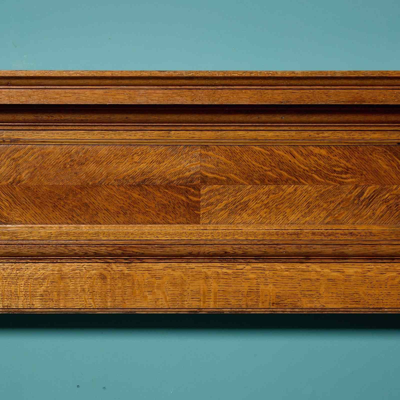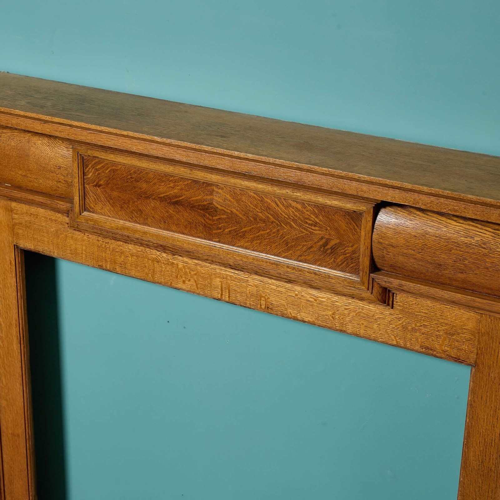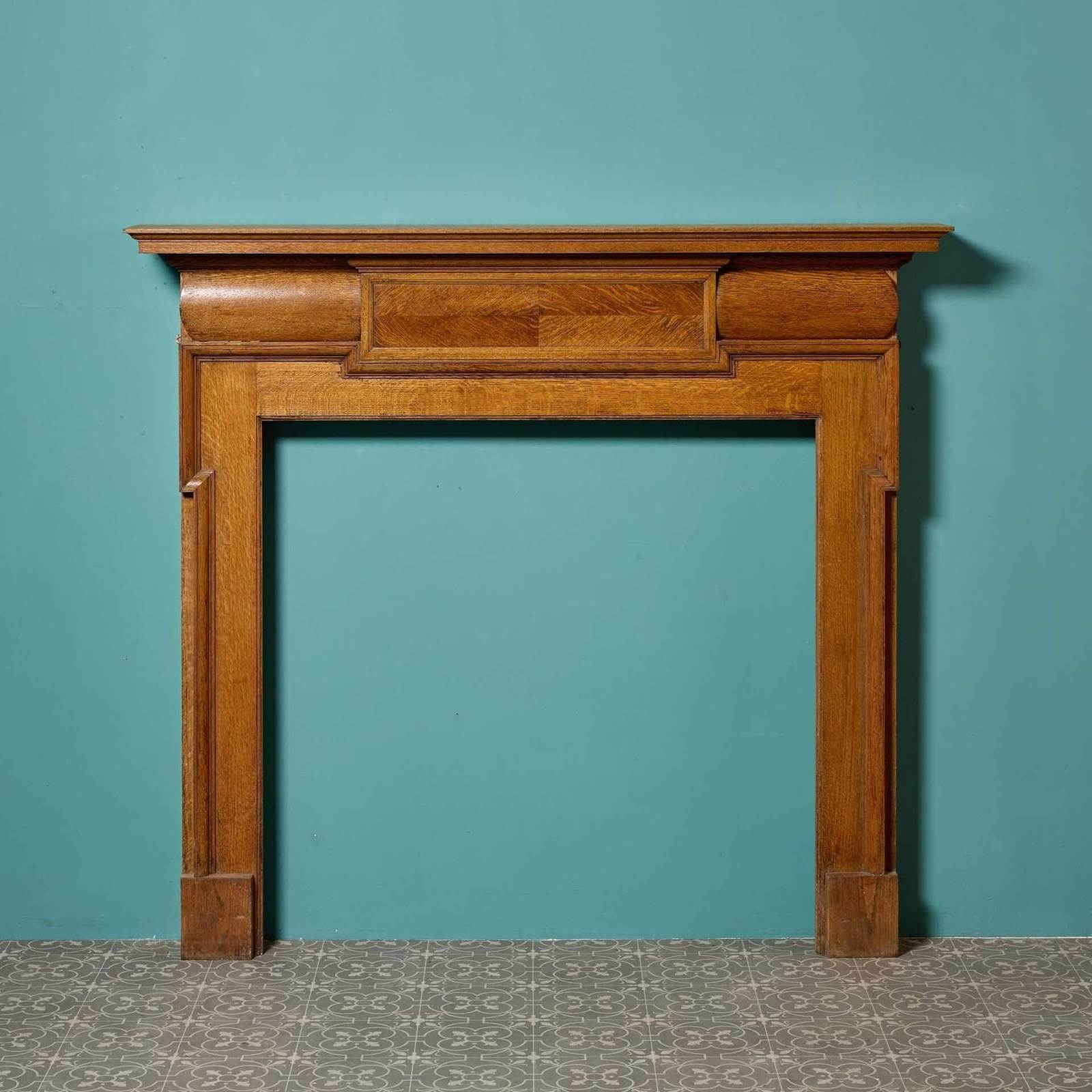 Dating from the early 1900s, this striking antique English solid oak fire surround is of beautiful quality and craftsmanship, having stood the test of time for over 120 years. At its centre sits a rectangular frieze with an unusual bookmatched veneer pattern above moulded jambs in the dog leg style. Crafted in solid oak, it is a handsome antique fireplace for an Edwardian townhouse or Victorian style property.