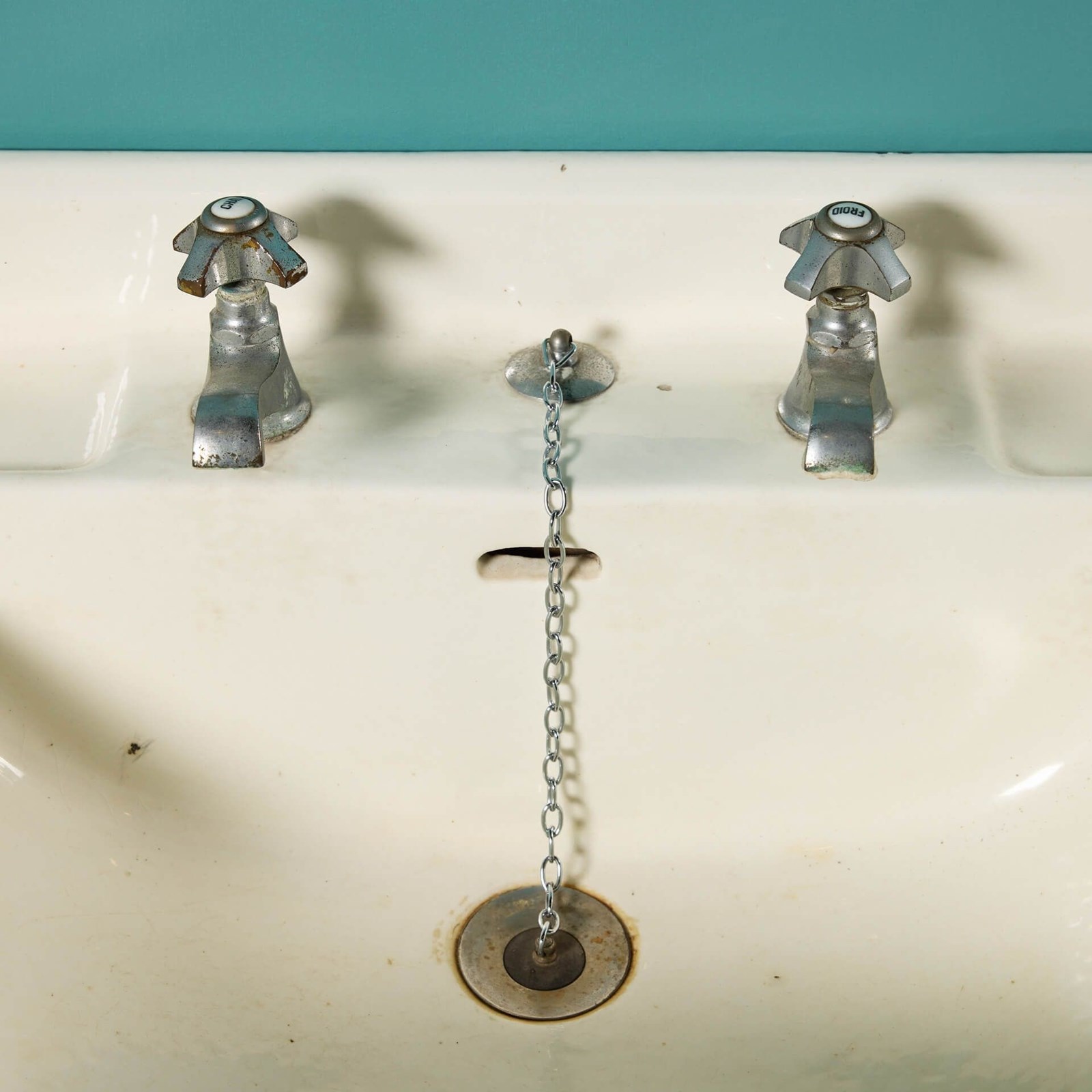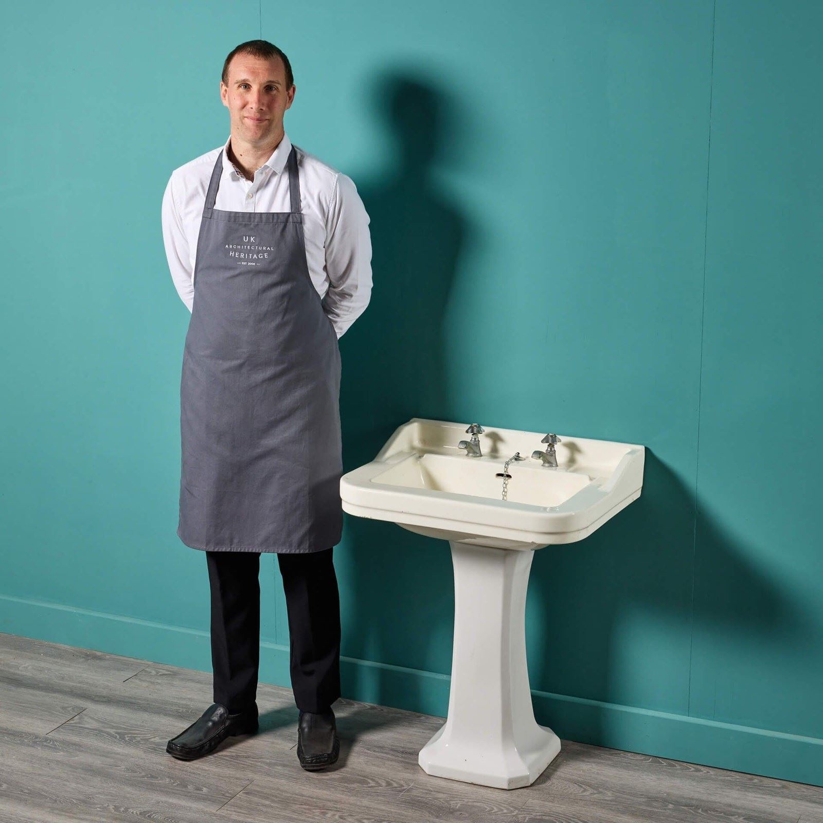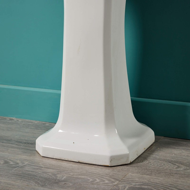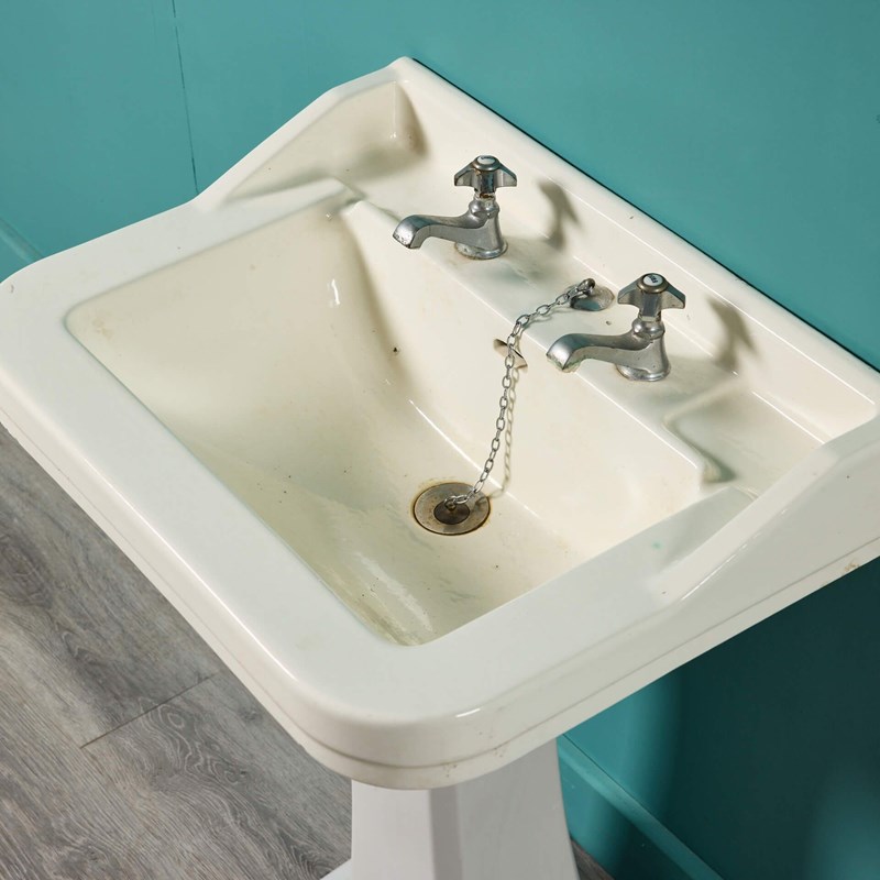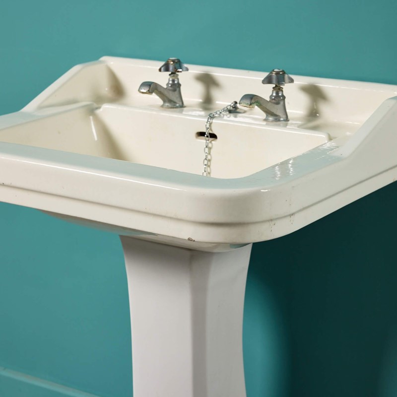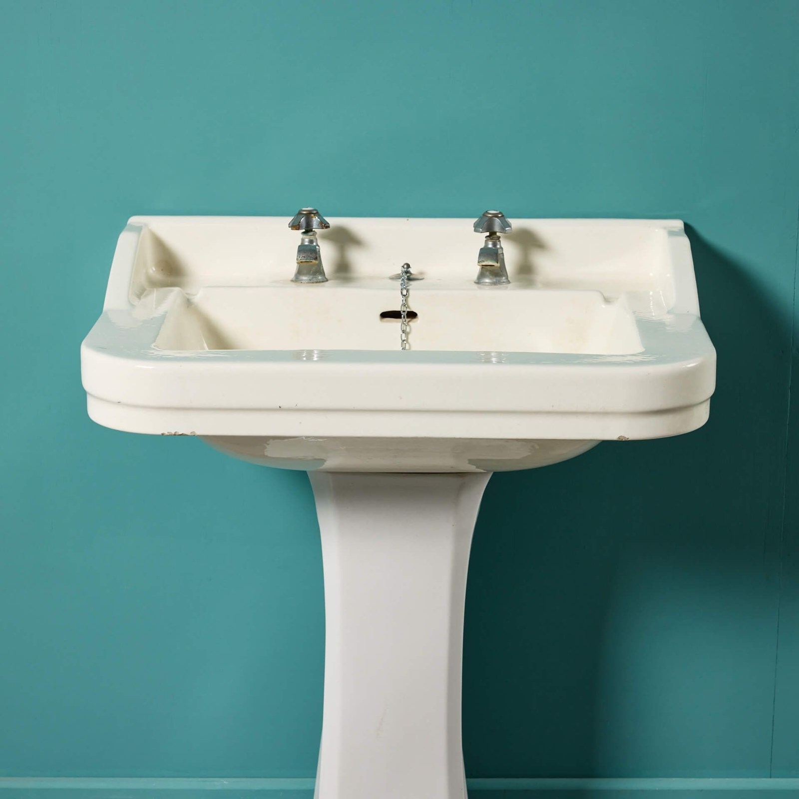 A reclaimed Edwardian style pedestal sink originating from early 20th century France with a sweeping pedestal, raised splashback and original fittings. This elegant French sink will make a smart addition to a traditional bathroom or vintage inspired ensuite, pairing the smart elegance of Edwardian styling with the flair of French craftsmanship.