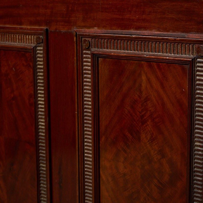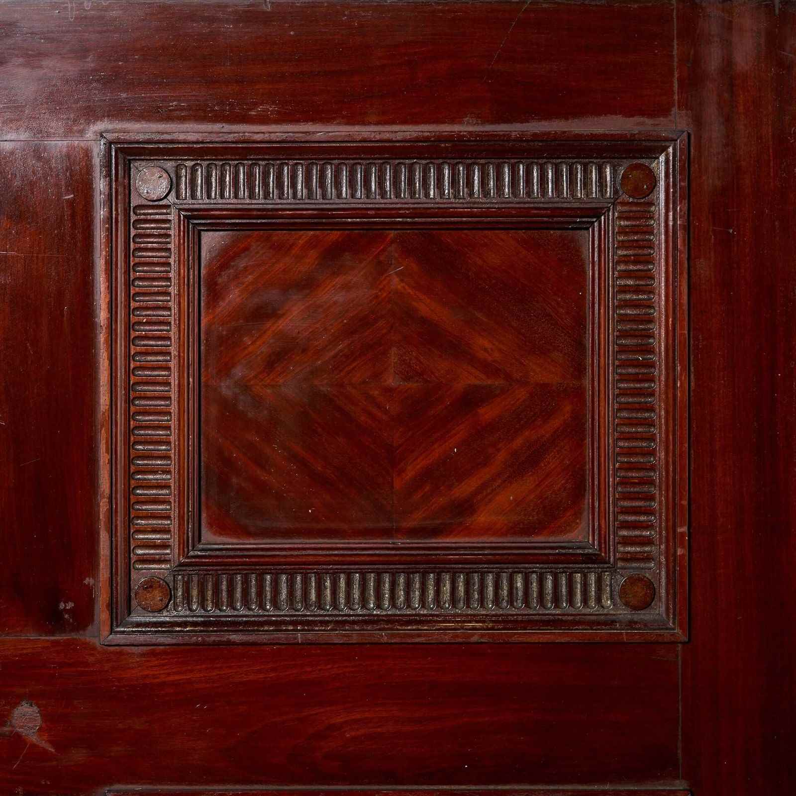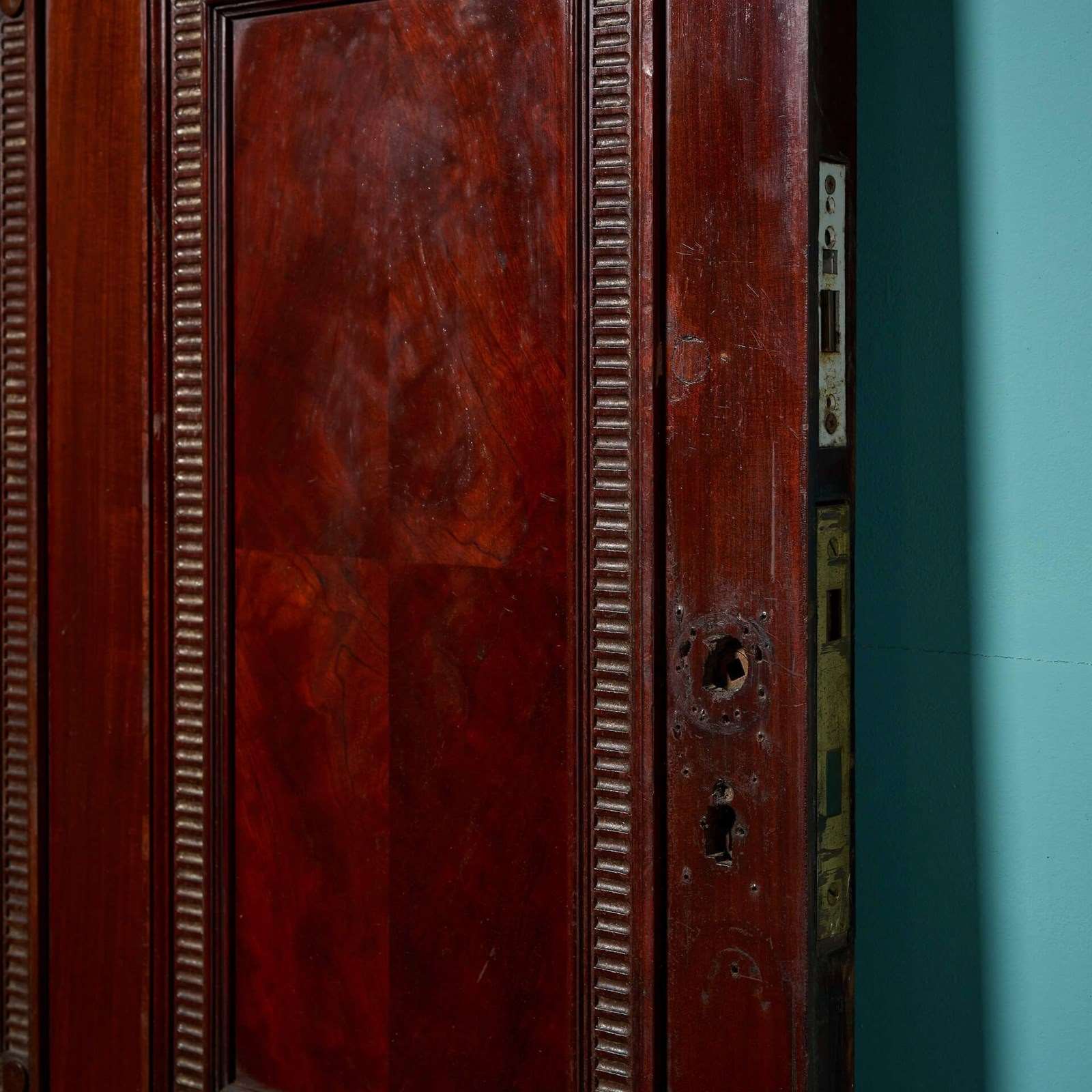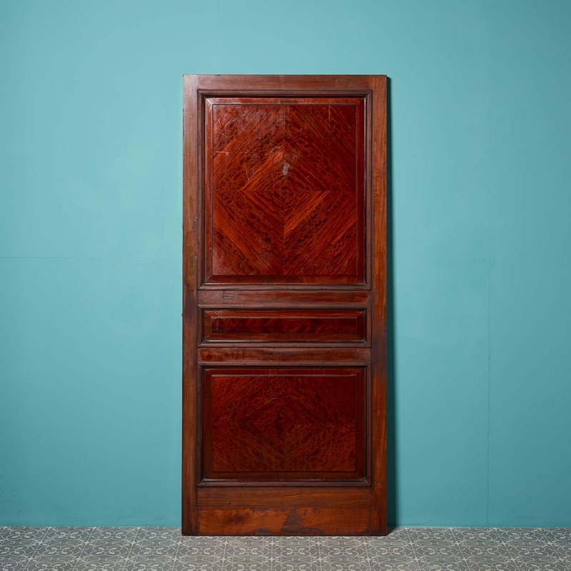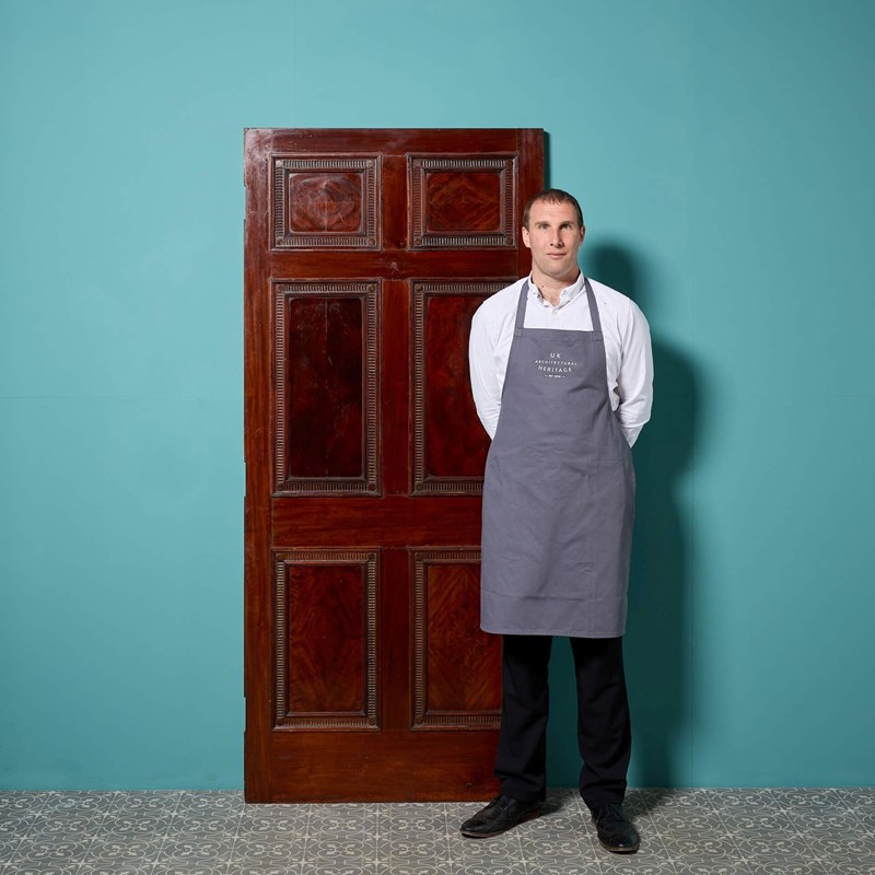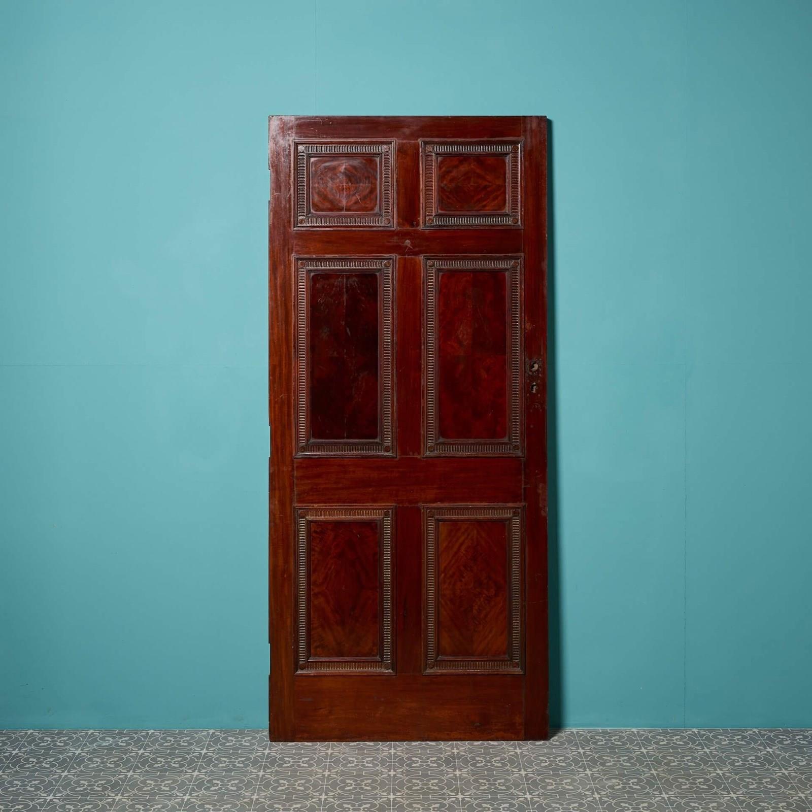 An antique six panel Georgian style mahogany internal door. This striking door is quarter veneered with six panels to the front and three horizontal panels to the reverse. At over 100 years old this stylish door incorporates a range of different styles, including Georgian, Regency, Neoclassical, and Victorian, making it an elegant addition to any period property or country home. CONDITION REPORT Good structural condition. 6 panels to one side; 3 panels to the other. Historic repairs and alterations.