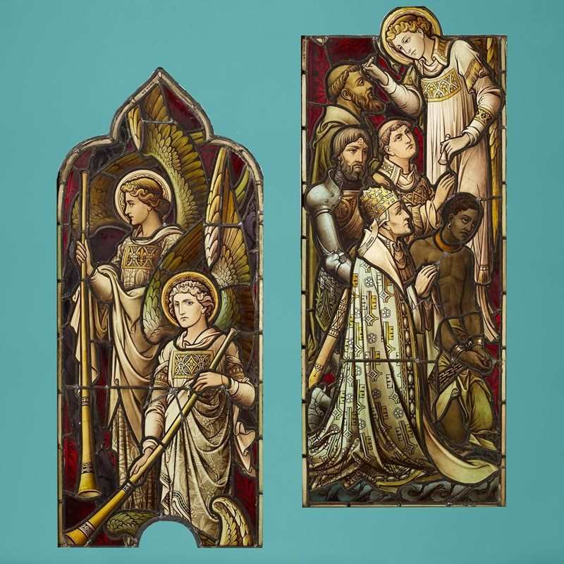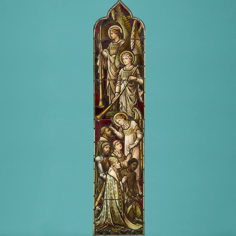 The vivid colours of this panel would look striking flooded with daylight as a stunning and detailed interior feature in a traditional home, a sympathetically decorated converted chapel or ecclesiastical building.