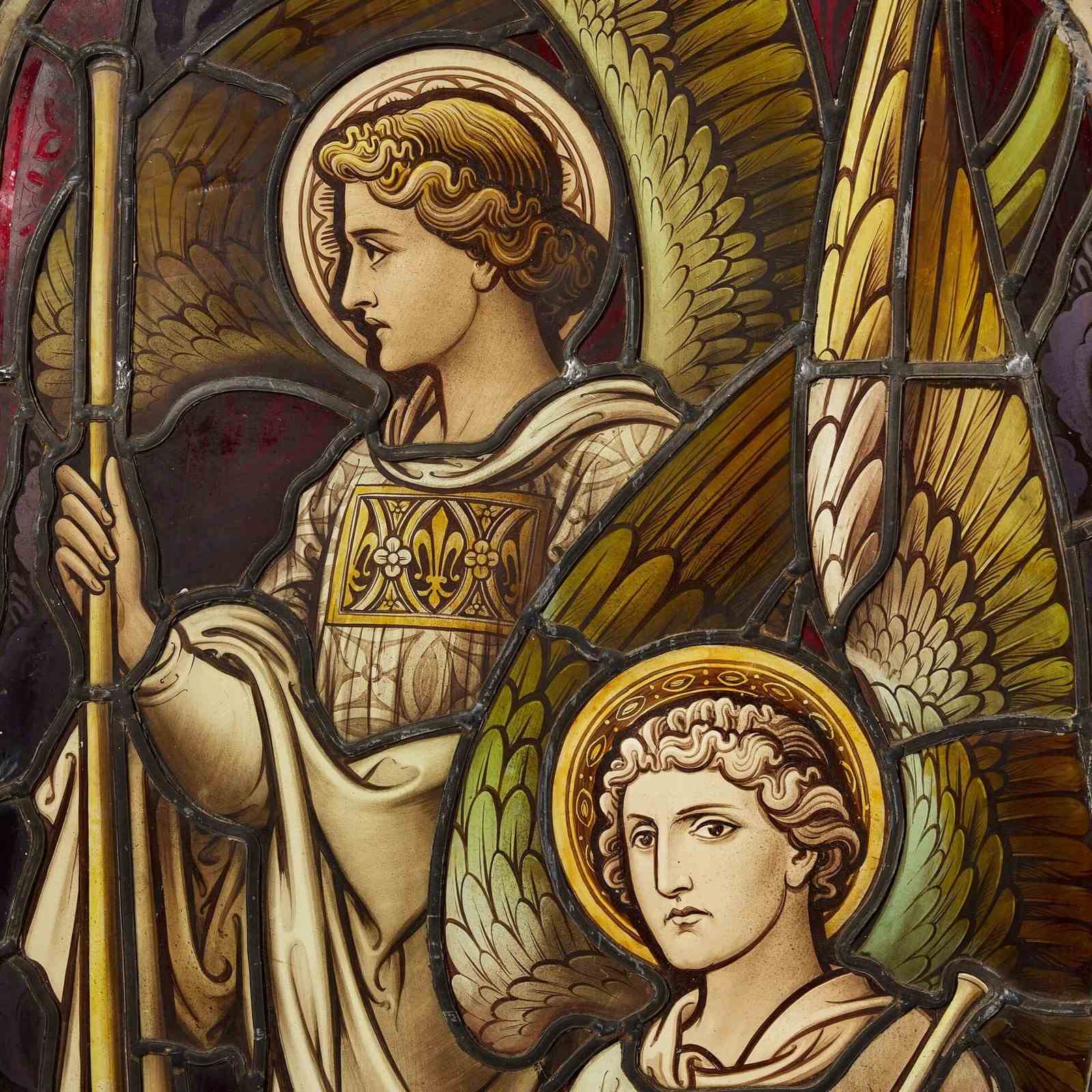 An Hardman & Co 19th century stained glass panel of a religious scene depicting an angel marking the foreheads of their followers.