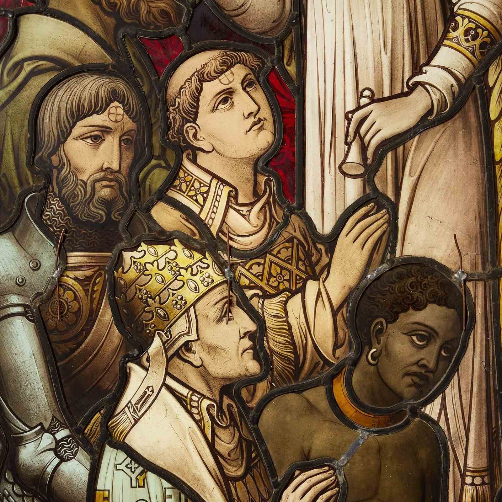 Competently painted, this dramatic stained glass window dates to 1889, once a part of an impressive larger window named ‘the Tree of Jesse Window’ reclaimed from the north transept of All Saints Emscote church, Warwick.