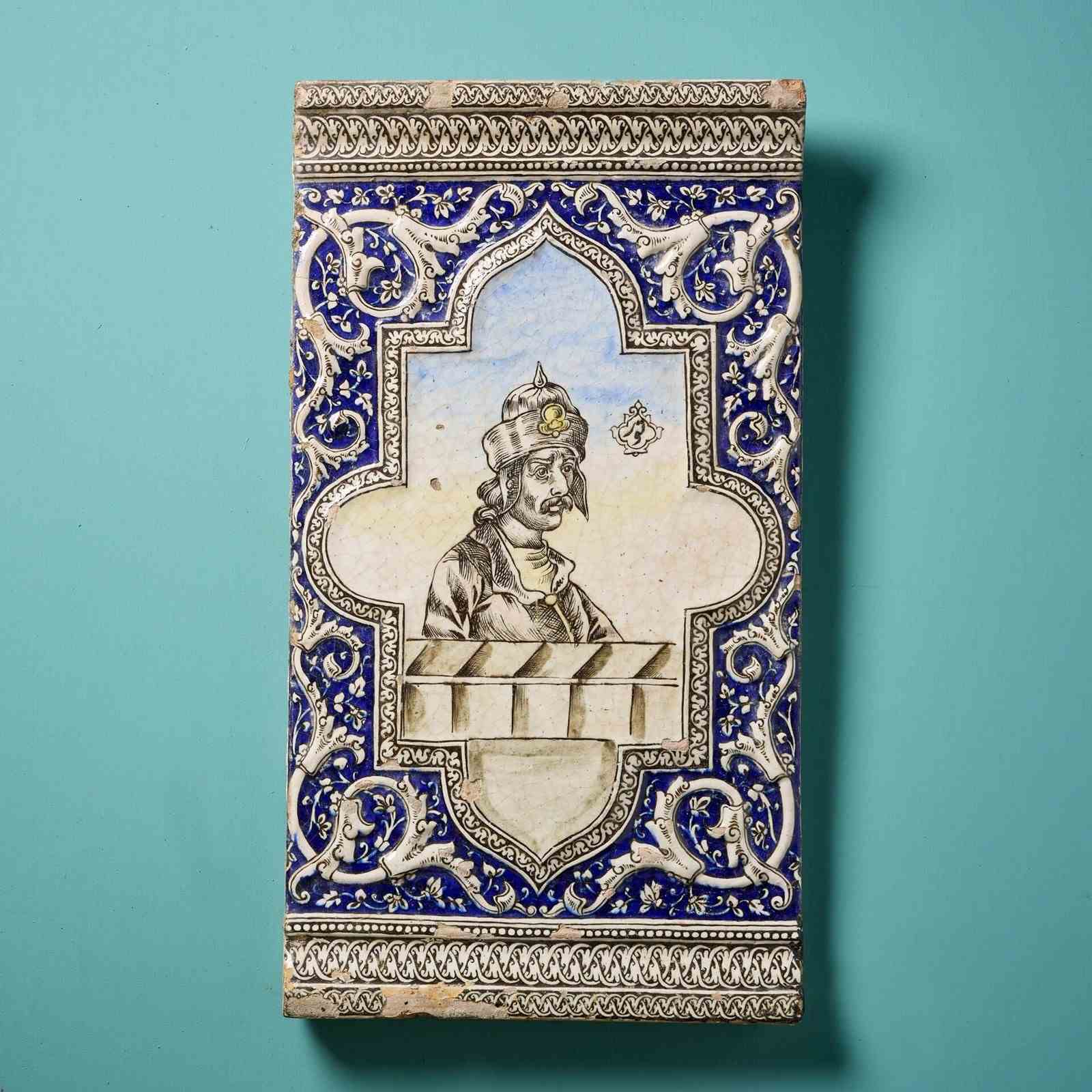In a large scale painted with a depiction of a Persian prince within a shaped cartouche flanked by scrolling foliage and vines.