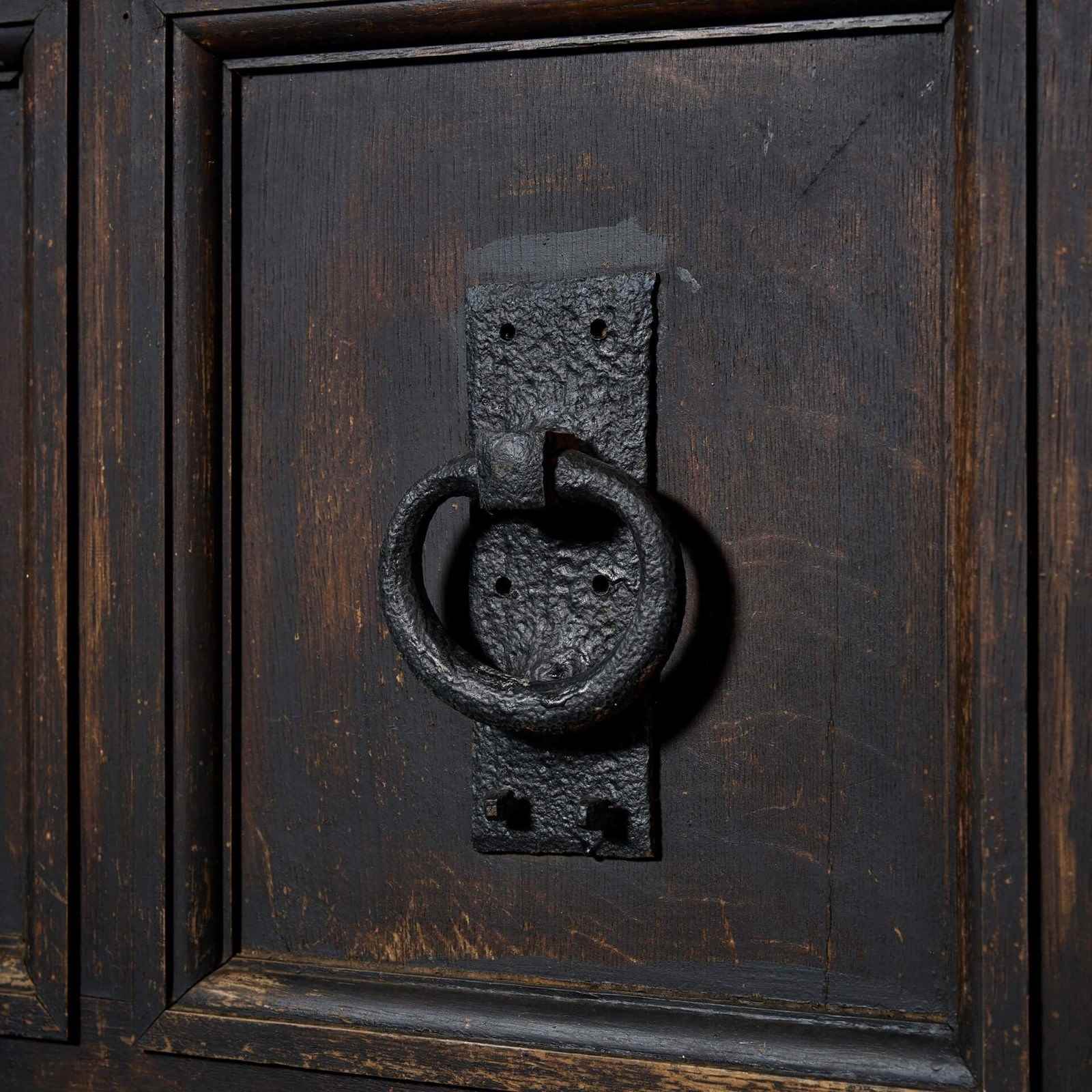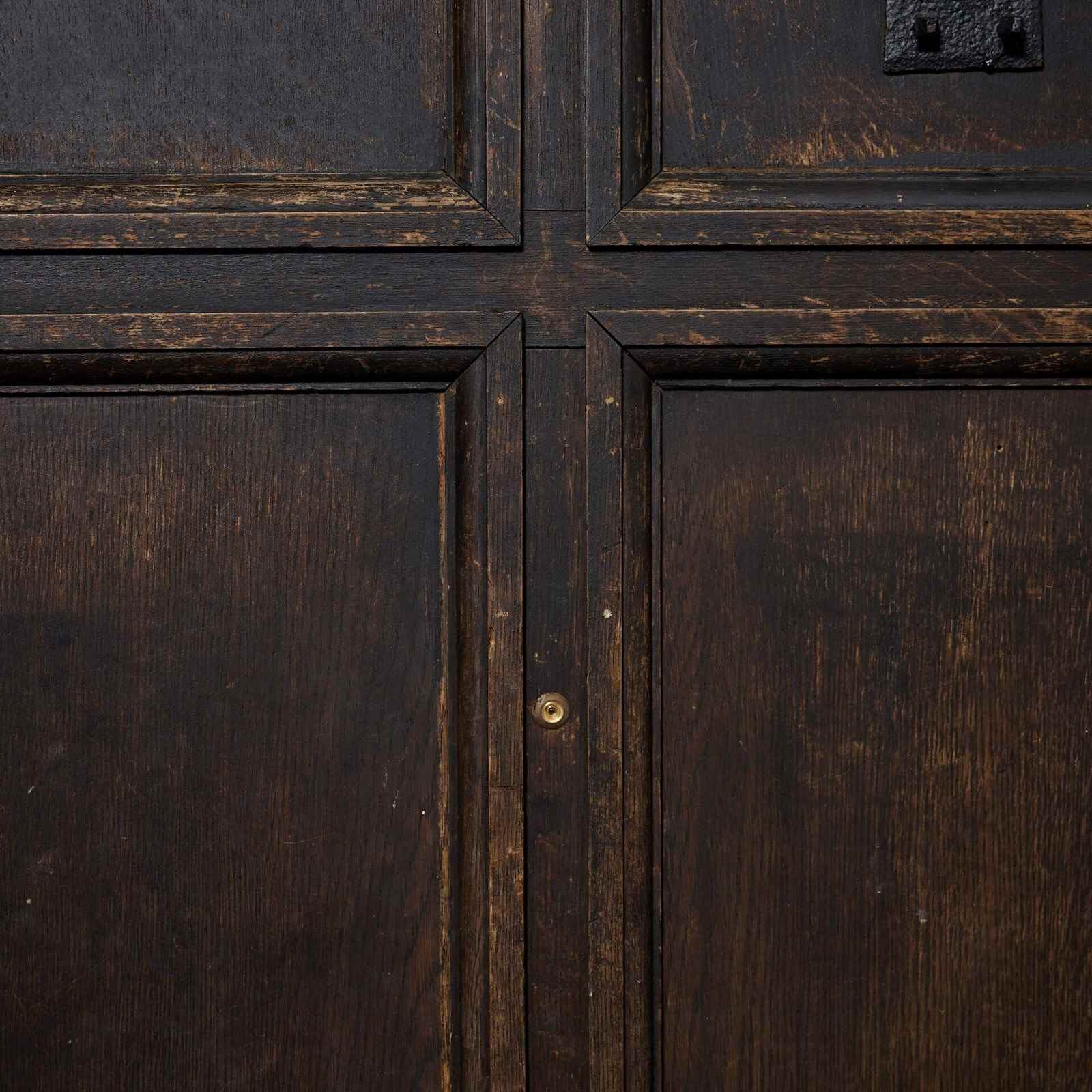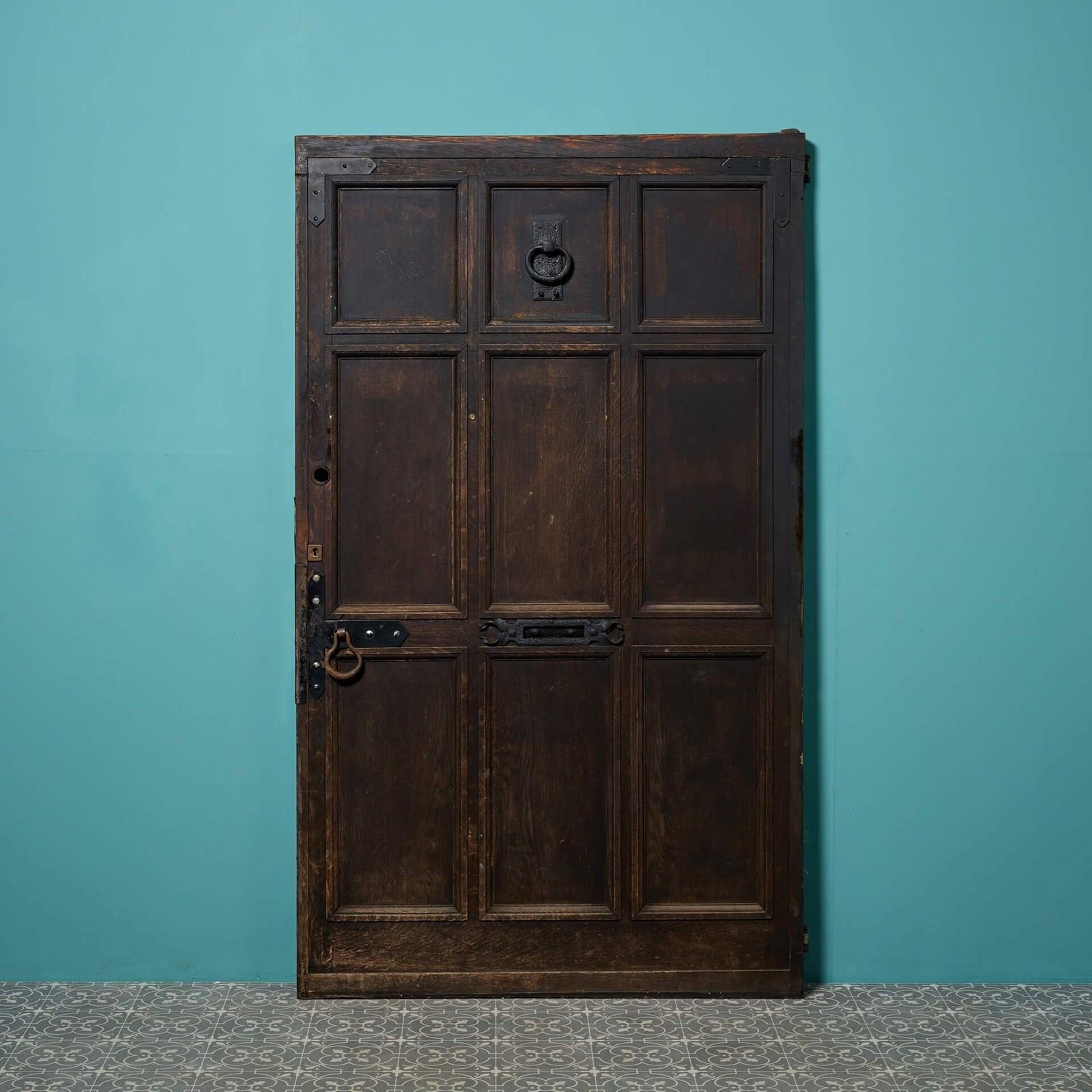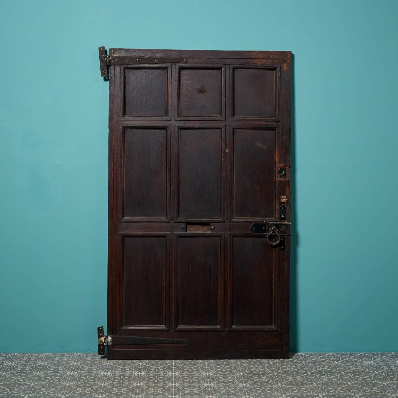 A large 9 panel antique oak front door reclaimed from an old English cottage. Dating from the mid-19th century, this antique exterior door is steeped in history, fitted with a letterbox, handle and original hinges. It’s smart 9-panel construction and dark oak colour will not look out of place in any setting, making a heritage feature of a country cottage as well as a more contemporary properties.
