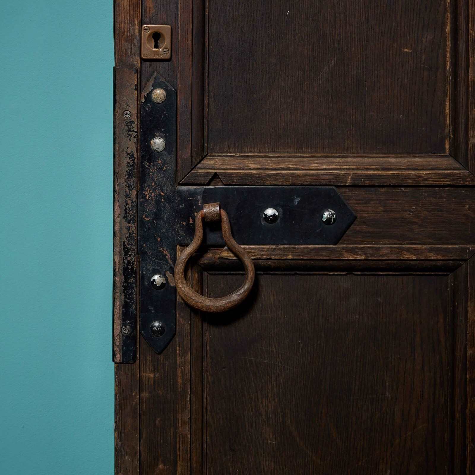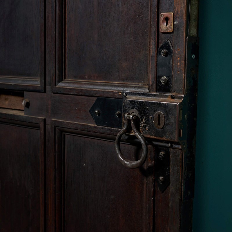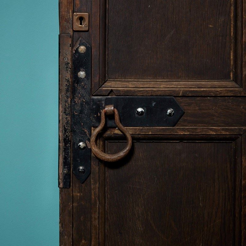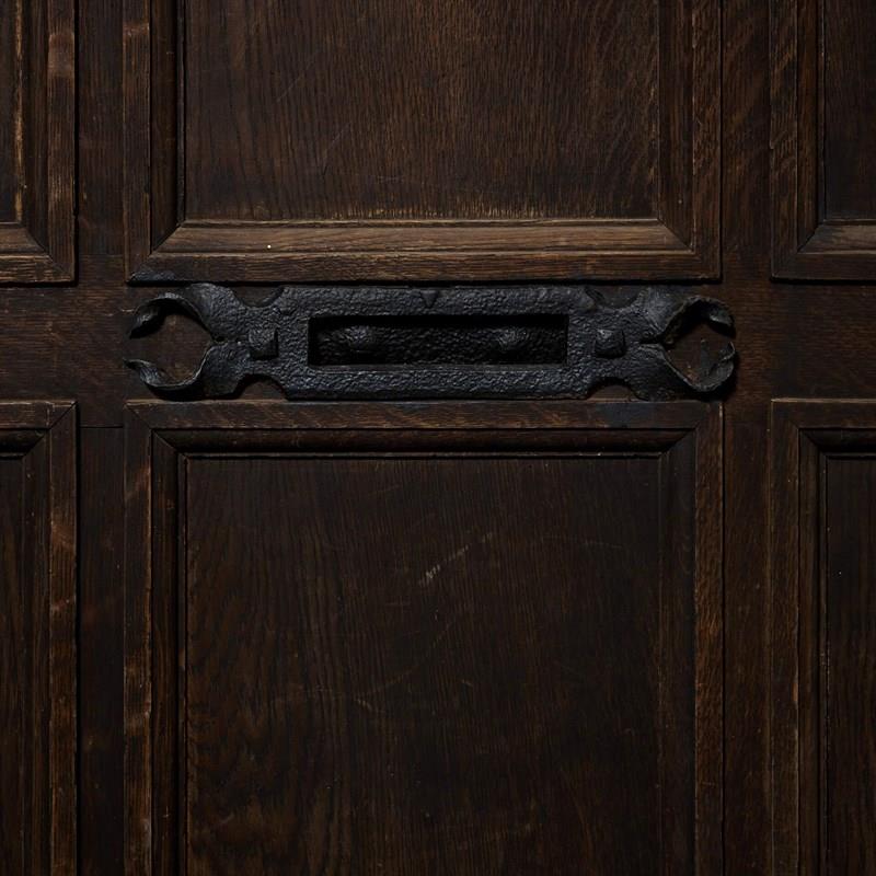 Good structural condition. Original hinges. Fitted with letterbox and knocker. Handle for the lock present (no keys); likely needs replacement. Previously fitted with Yale lock (not present). Reinforcement around lock area. Additional strengthening braces to top corners.