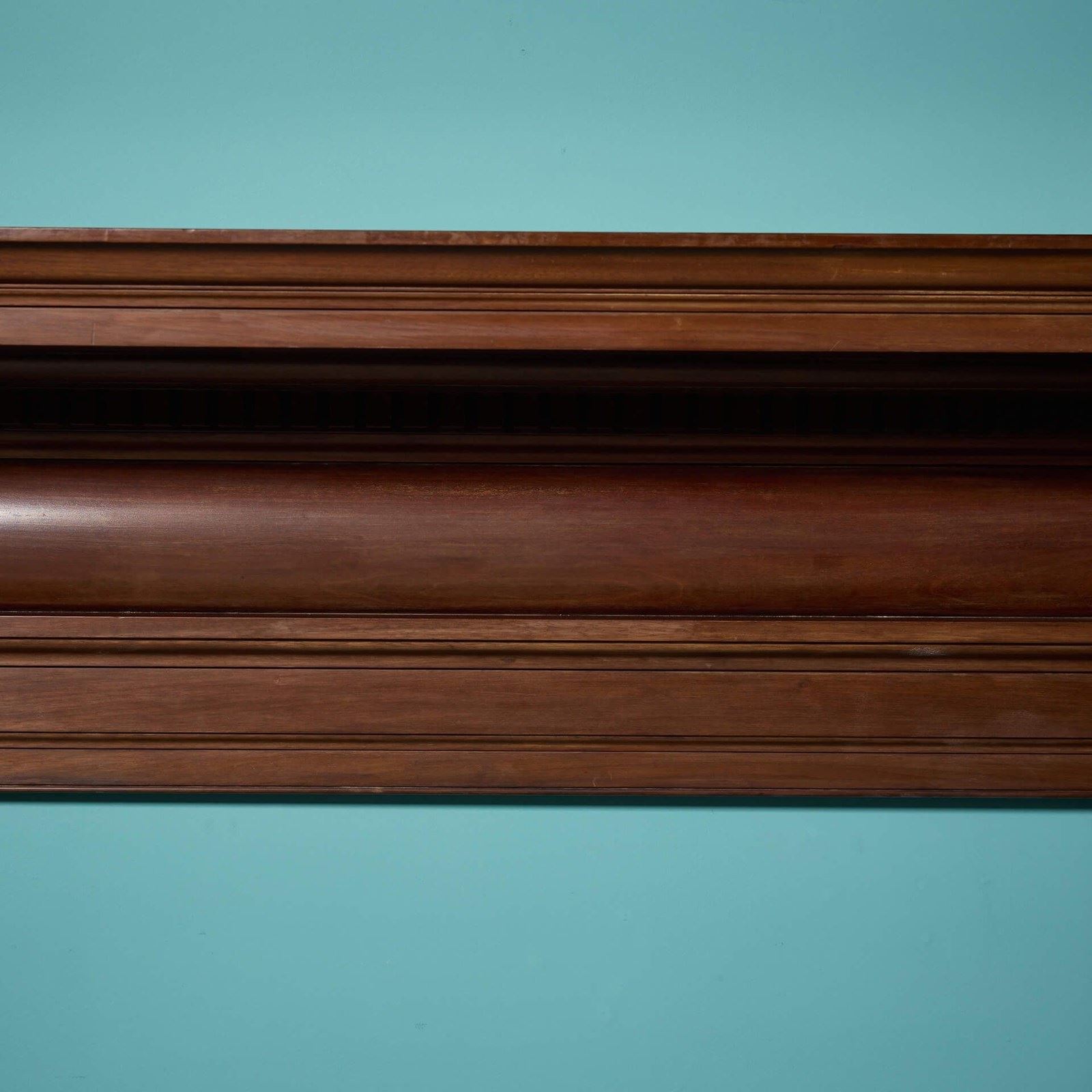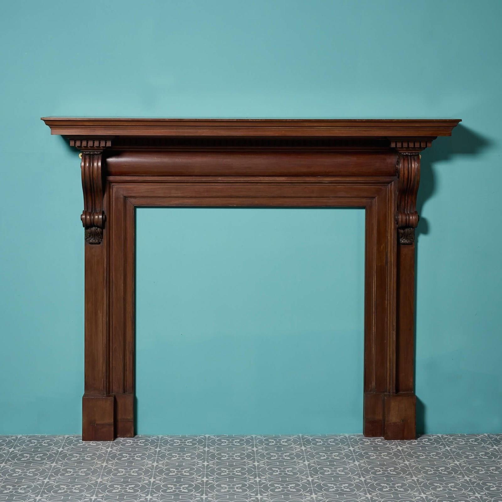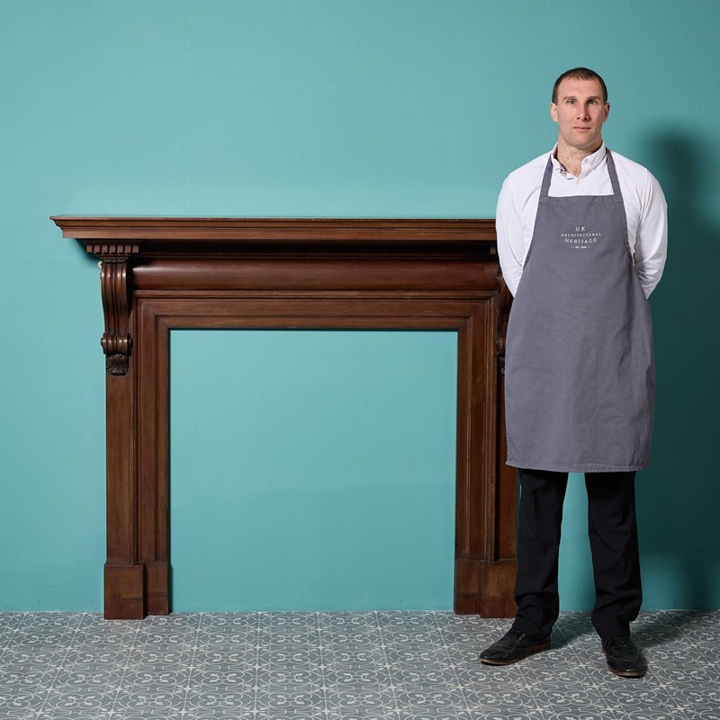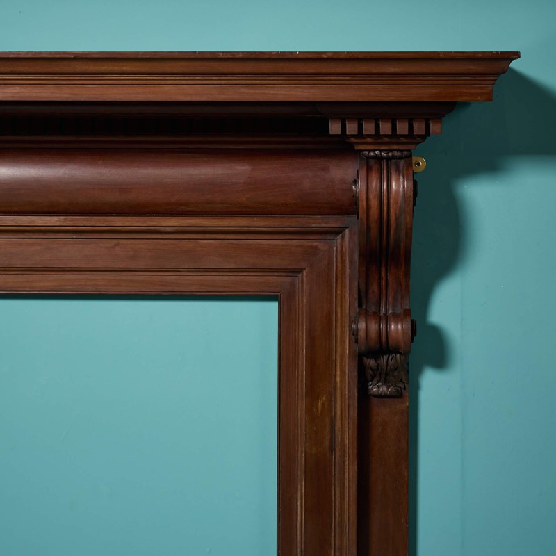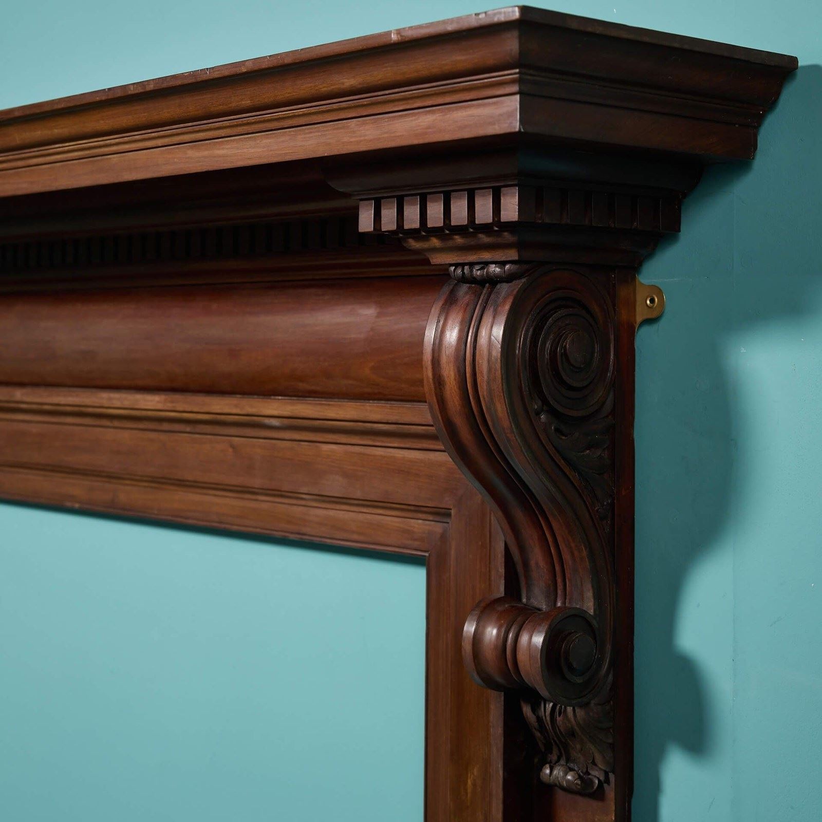 A large antique English carved mahogany fire surround dating to the late 19th century.