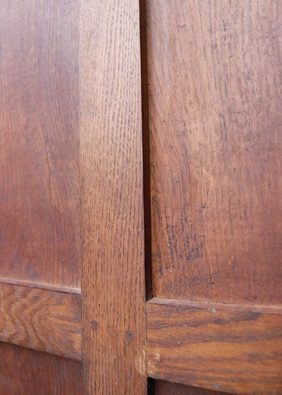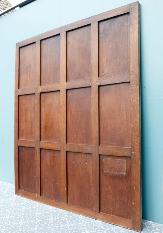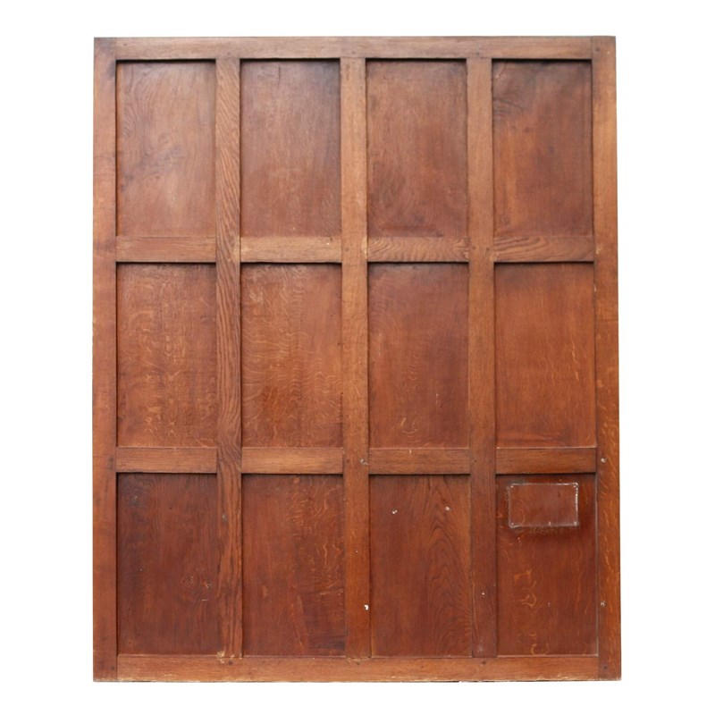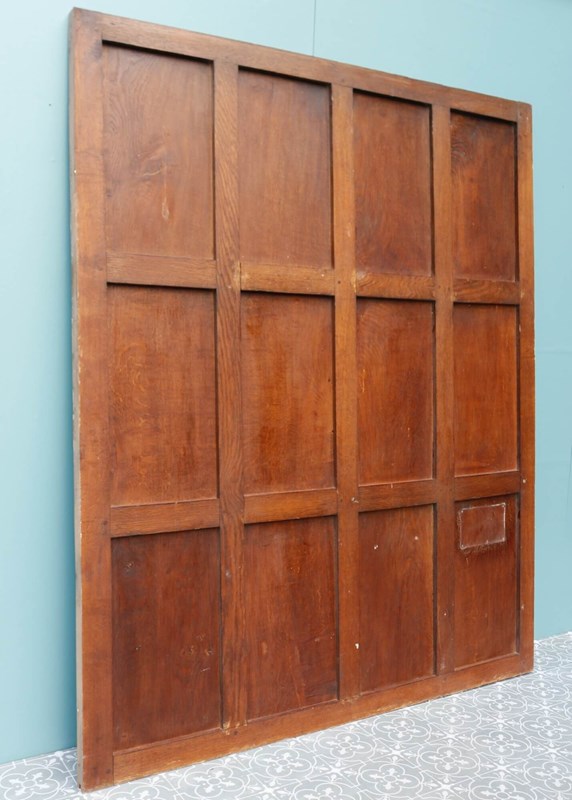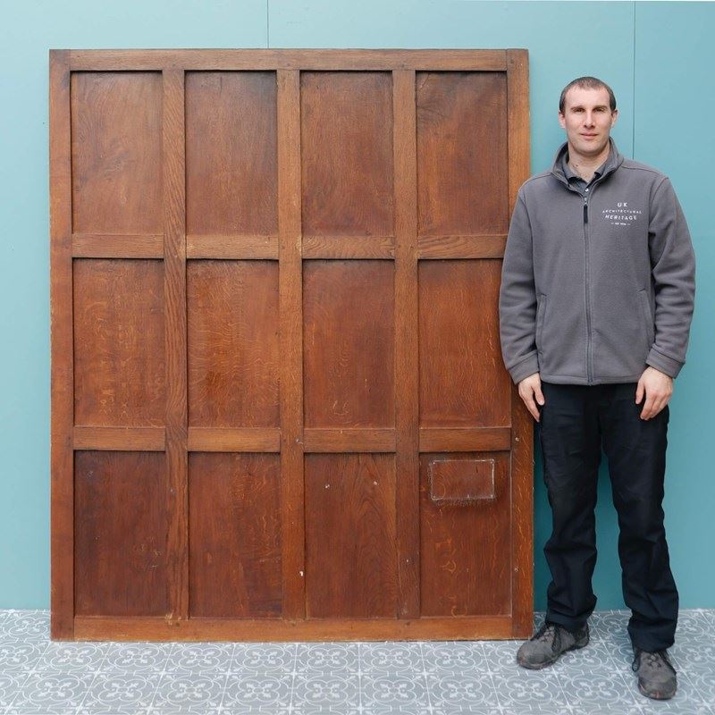 A single large antique oak wall panel salvaged from a British church. It dates from the early 1900s during the Victorian era and features solid oak construction with a rich warm wood colour. It is double sided with panels to both the front and back, though the reverse is not as clean as the front. In keeping with the style and colours of a period property, this large wall panel could be used alone as a statement piece or cut to create short, dado style panelling.