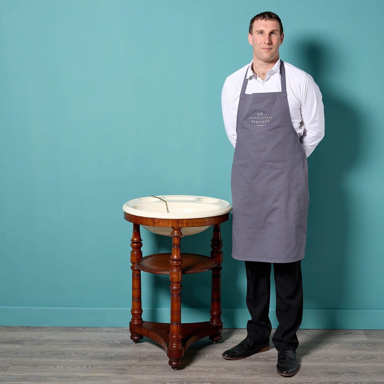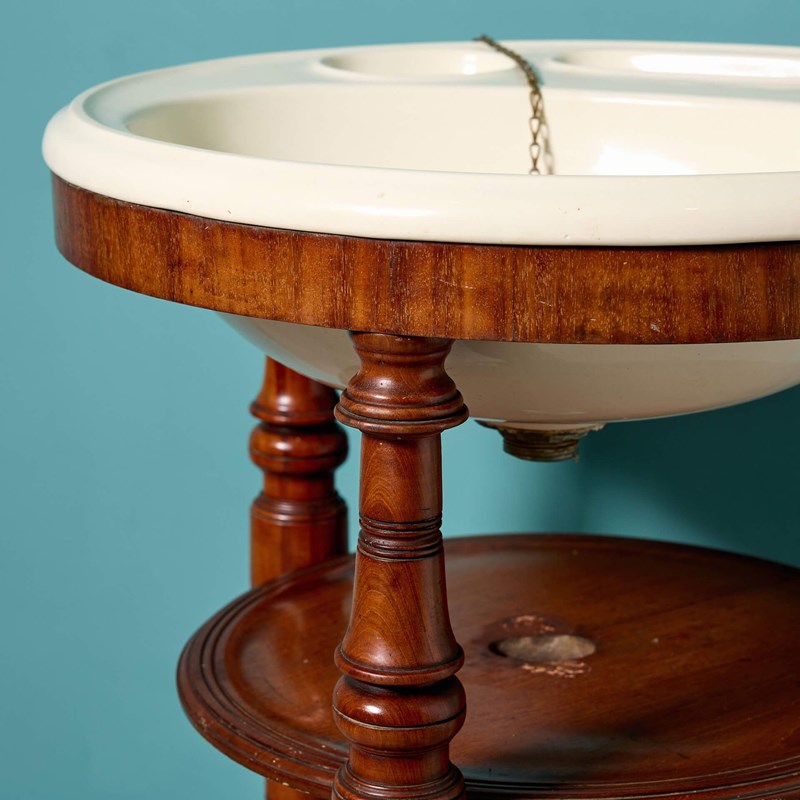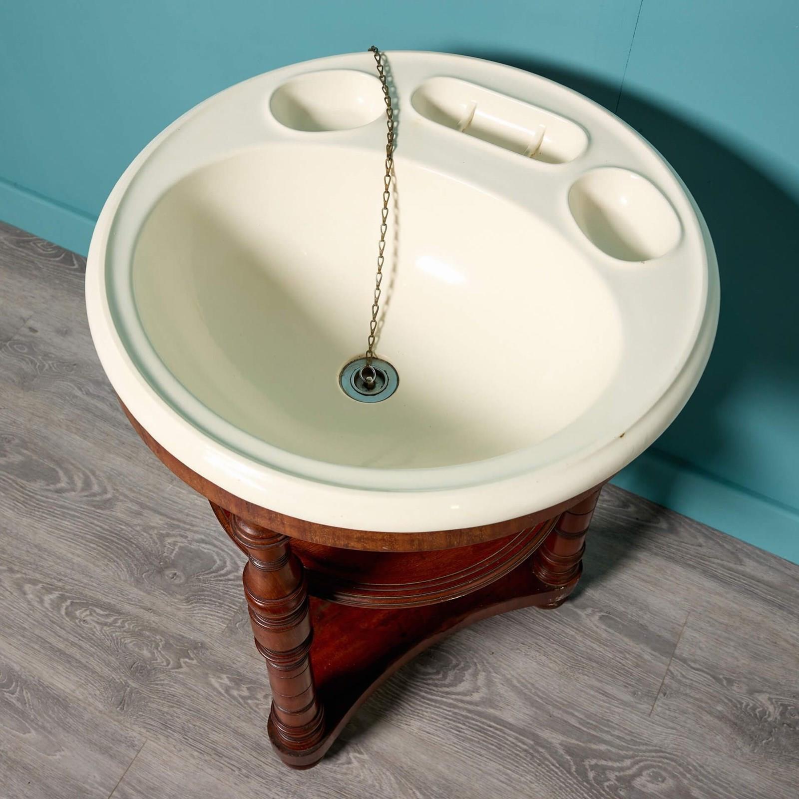 A large antique round basin with a triform stand. This large sink has a simple yet elegant porcelain basin finished in a cream coloured glaze, held on a striking mahogany triform base with original fittings and castors. A wonderful addition for a vintage style bathroom in period and modern properties alike.
