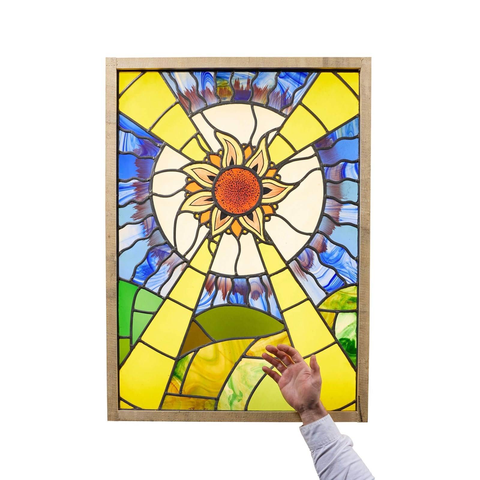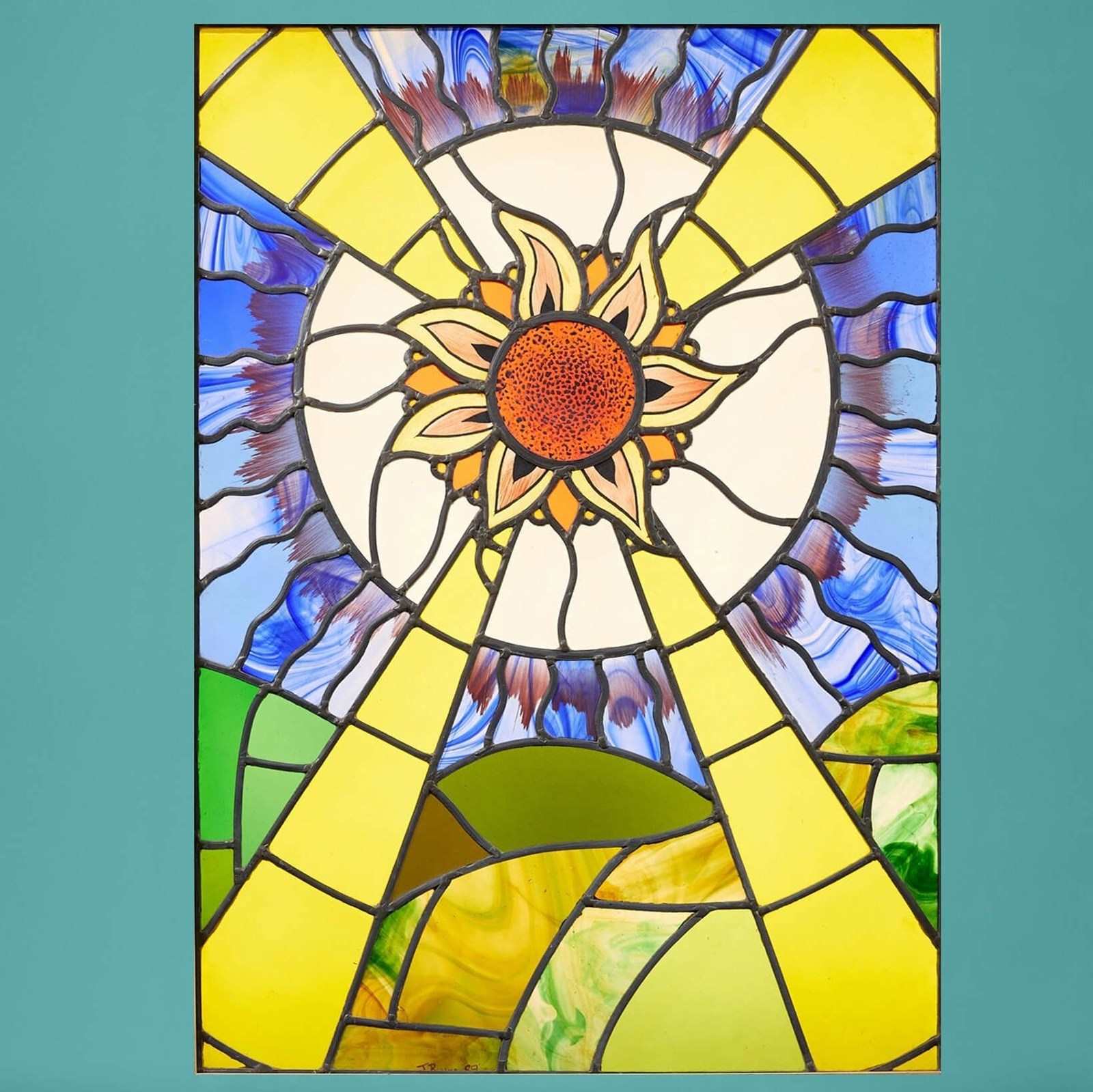 A large Art Deco style leaded stained glass panel, depicting a sun rise over a rolling mountainous landscape and vivid blue sky.