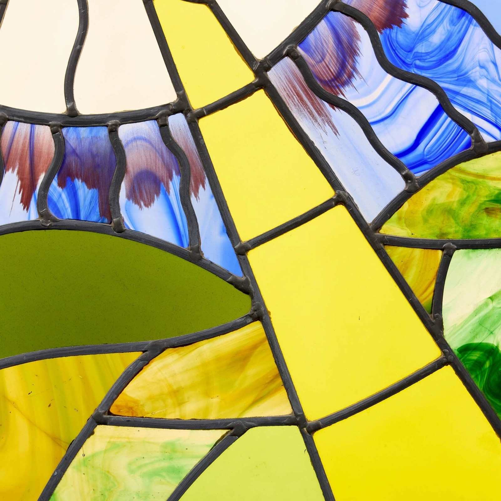 This is an abstract contemporary stained glass window with an unusual design, blending together a range of vibrant colours on an appealing scene with an uplifting bright, cheerful tone.