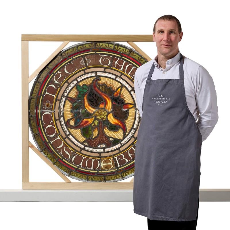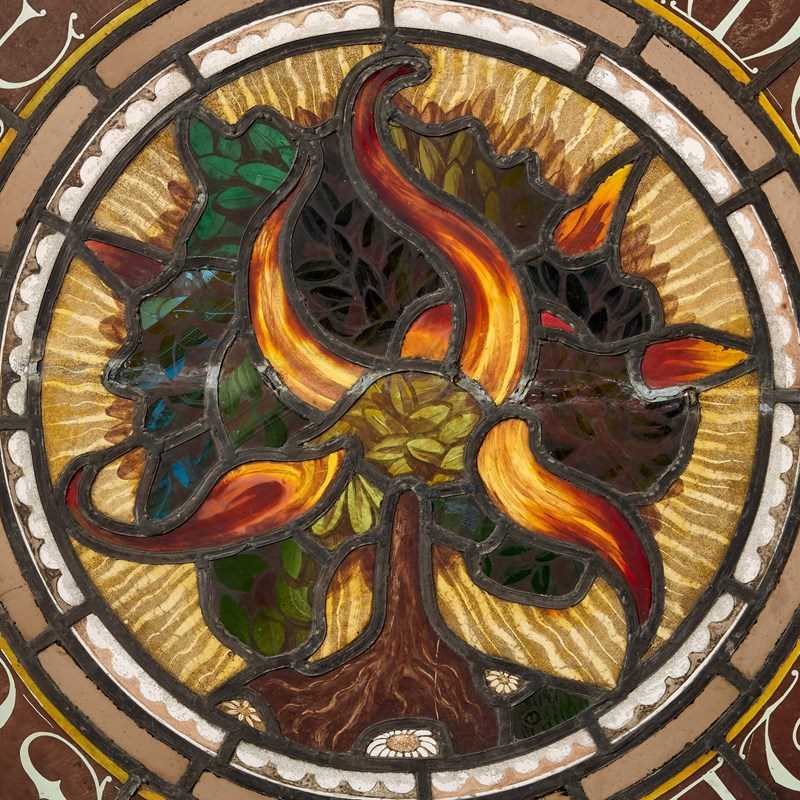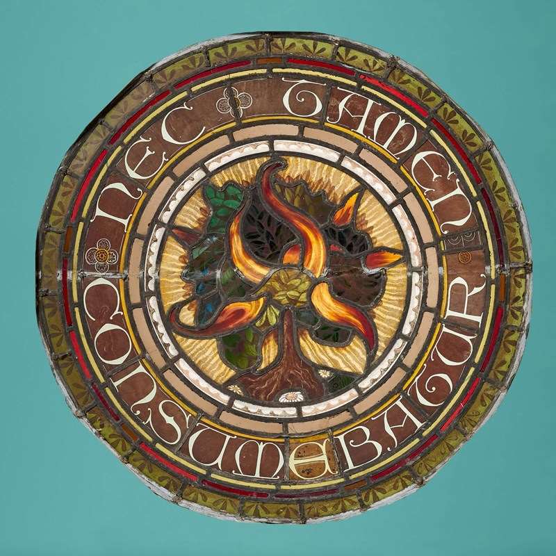An unrestored large ecclesiastical Scottish stained glass roundel depicting the burning bush. It is handpainted around the perimeter with ‘nec tamen consumebatur’, Latin for ‘yet it was not consumed’; a phrase and symbol famously associated with the Church of Scotland.