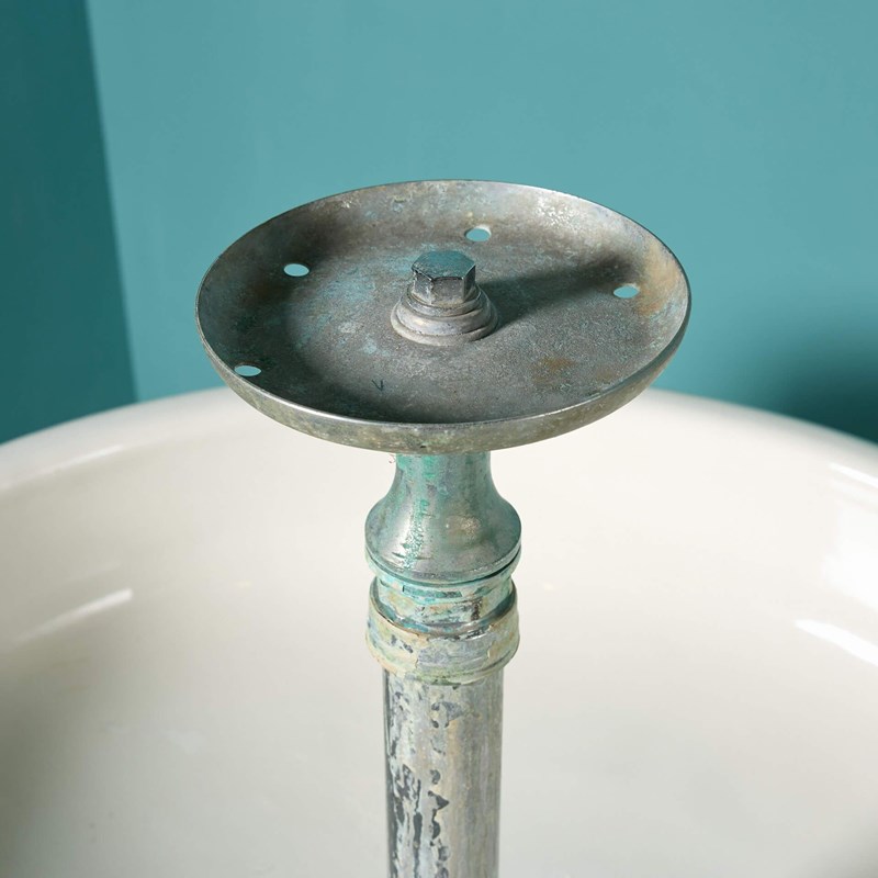 It is made from glazed stoneware and has a nickel-plated brass riser to the centre, the water designed to drain away at the base of the riser. Freestanding, the large round basin sits upon a pedestal base with two uncovered openings for access.