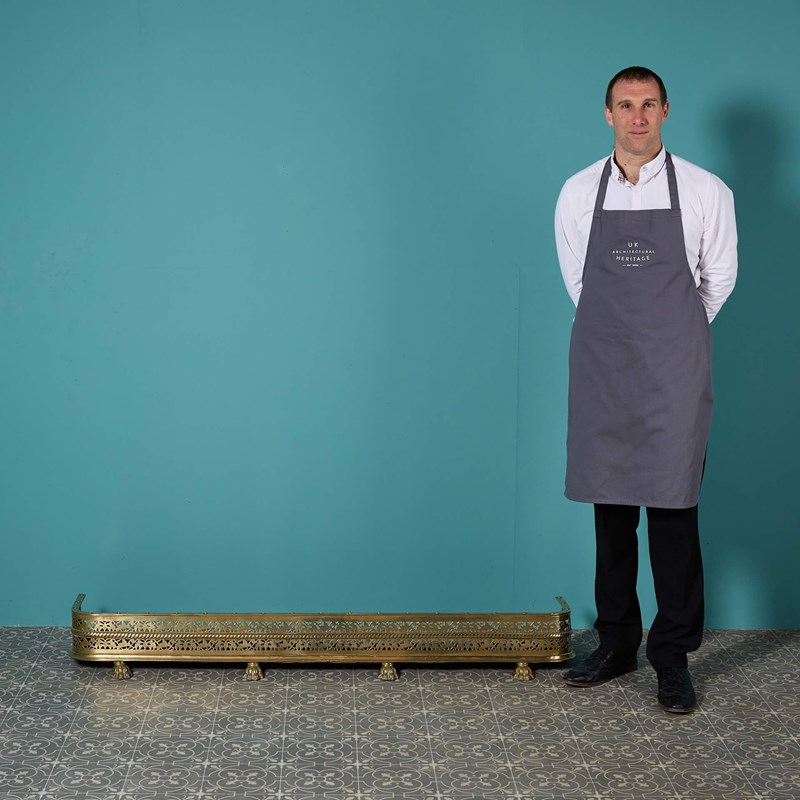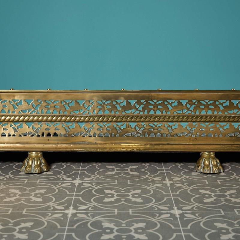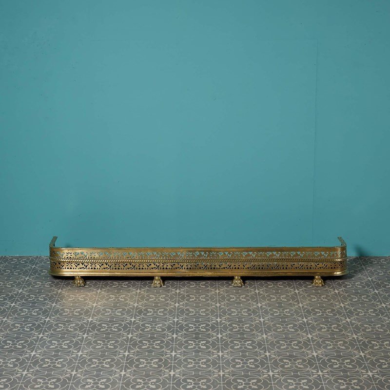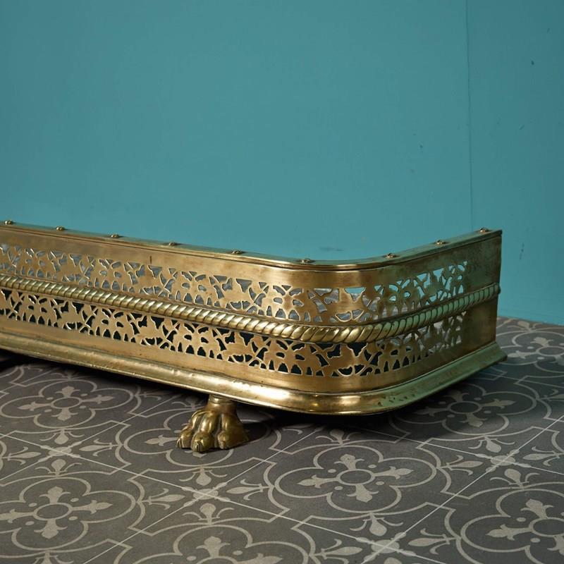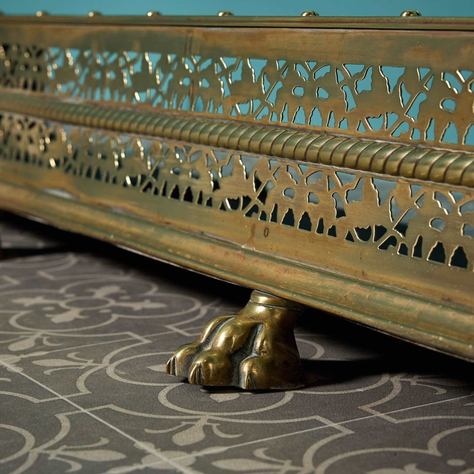 A large Victorian brass and steel fire fender with lion claw feet and pierced fret, circa 1850. With its large proportions and beautiful polished brass finish, this antique fireplace fender will bring instant grandeur to any space.