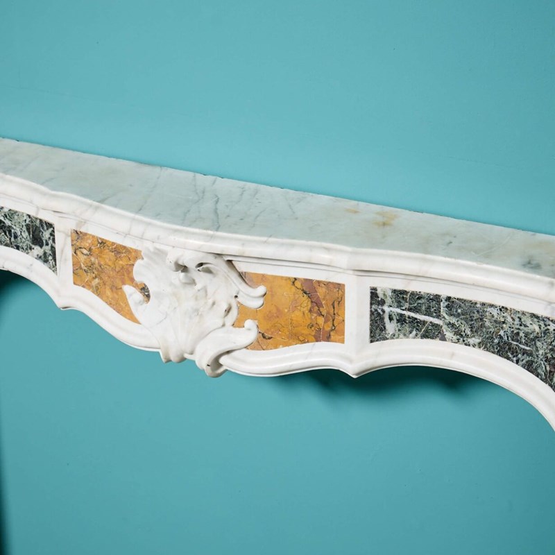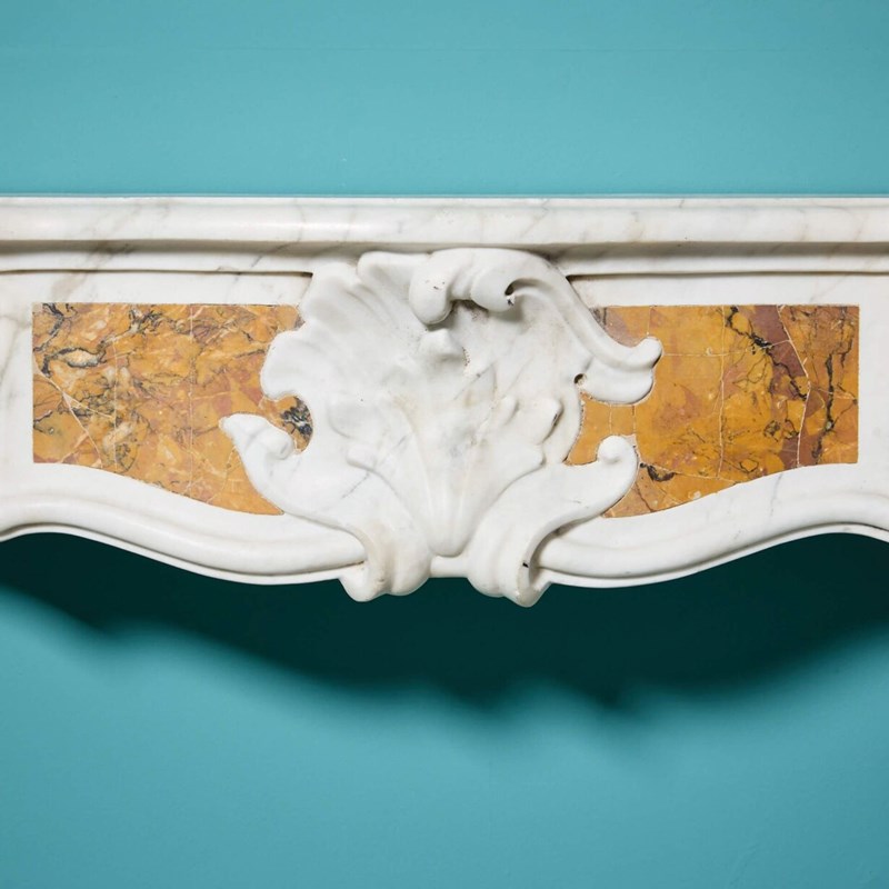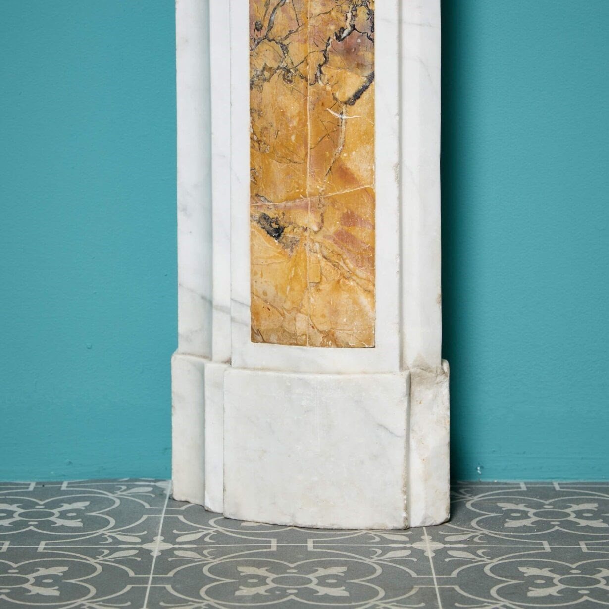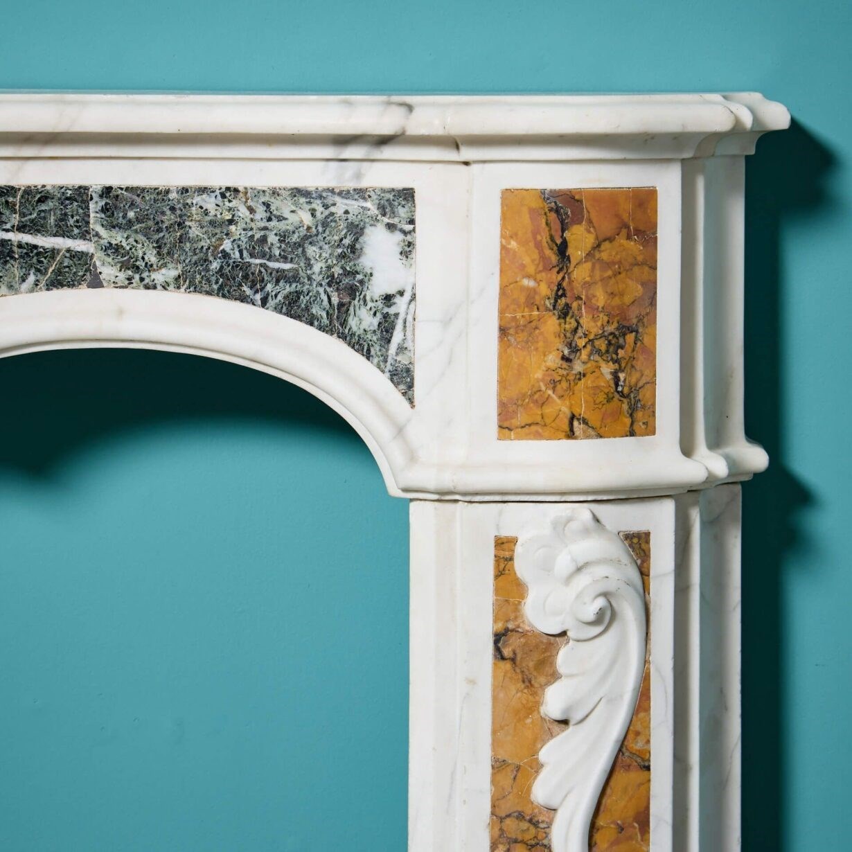 This antique fire surround is expertly crafted with specimen marbles of Brocatelle di Sienna and Maurine Green, inlaid across the jambs and the frieze to create a truly spectacular contrast of natural colour and pattern.