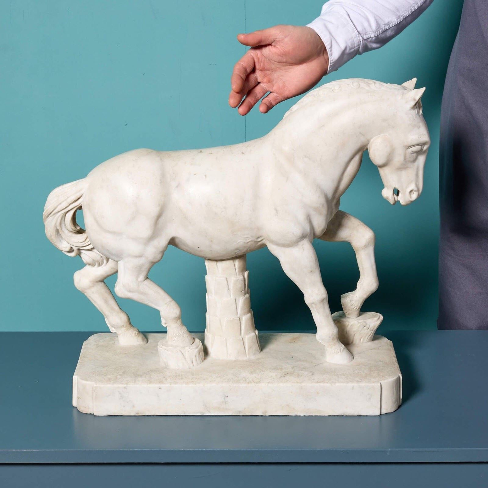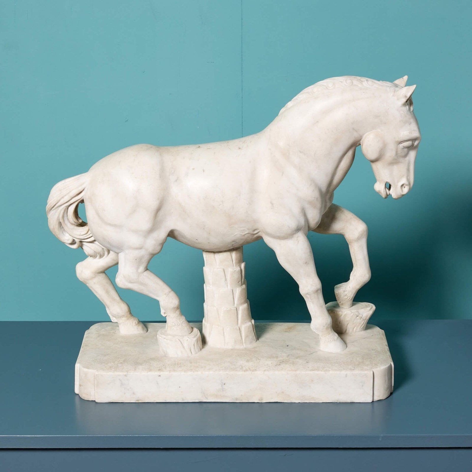 An elegant marble statue of the pacing stallion after the antique by Alceo Doessena. Inspired by the Horses of San Marco in Venice, this beautifully carved stallion is a testament to Dossena’s artistry. In all’antica style, he included a strut and palm tree as supports for the fragile composition of the horse.