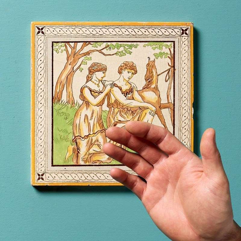 A reclaimed 8-inch clay tile by Minton Hollins & Co. (stamped to reverse) illustrated with a scene from Shakespeare’s 1593 poem ‘Venus and Adonis’.