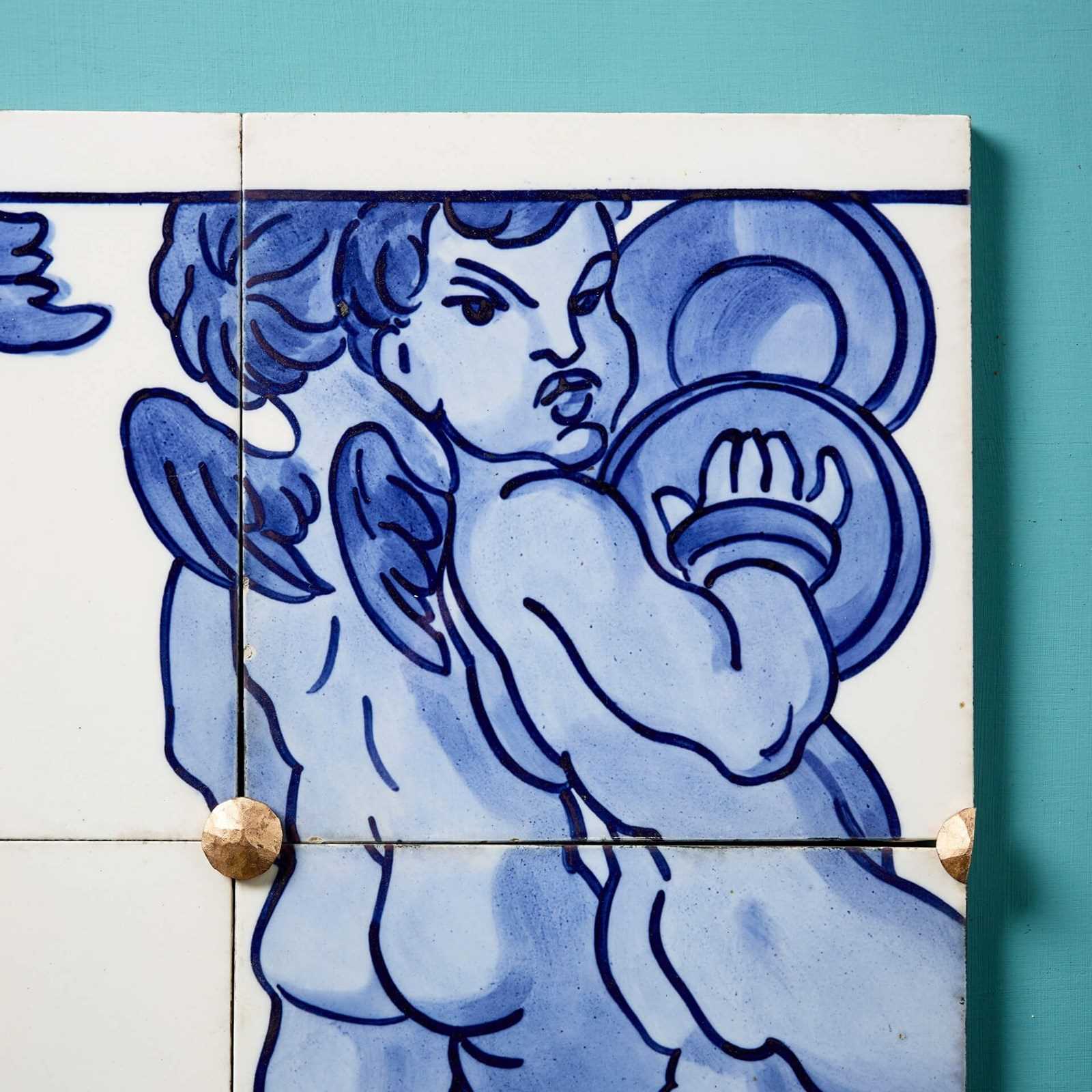 A set of 4 antique dust-pressed ceramic tiles by Minton Hollins (stamped) creating a decorative blue and white glazed frieze panel depicting a pair of neoclassical style winged cherubs playing cymbals.