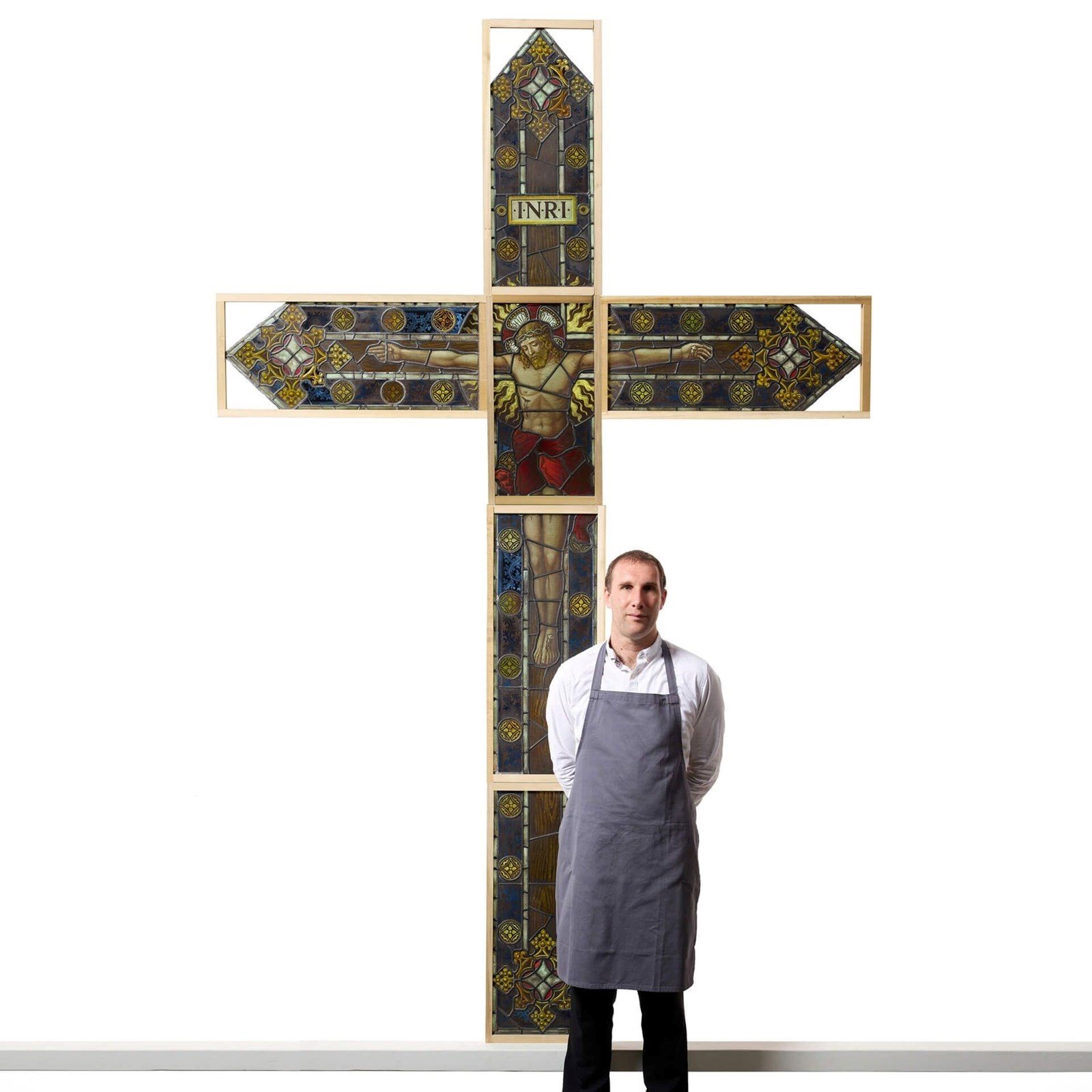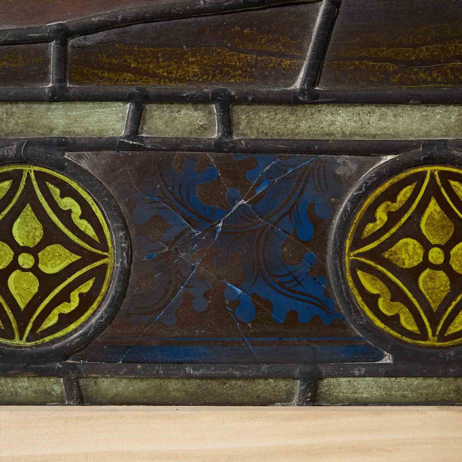 Good structural condition. Unsigned. Transports as 6 pieces, all fitted into temporary pine frames. Top panel bearing 'INRI': conservation repair to text. Left arm panel: conservation repair to lower blue foliate glass. Face panel: small crack to yellow glass in top left. Right arm panel: conservation repair to lower blue glass below hand. Feet panel: conservation repair to left blue glass and another in border to side of right leg. Legs panel: good condition, no visible issues.