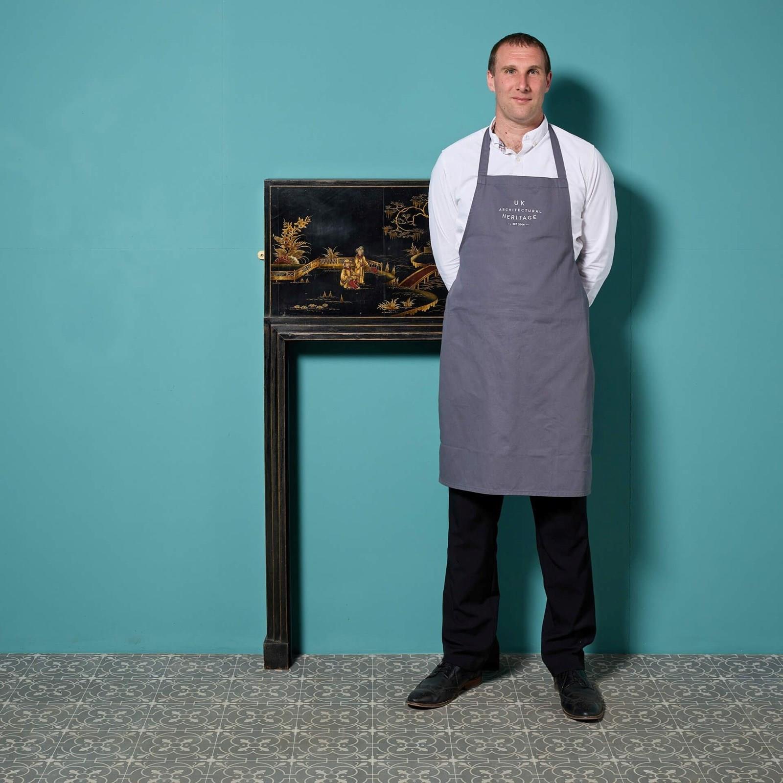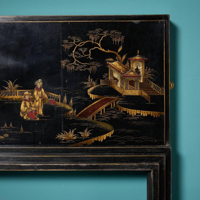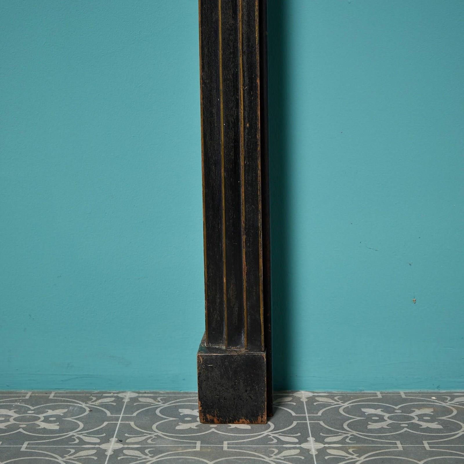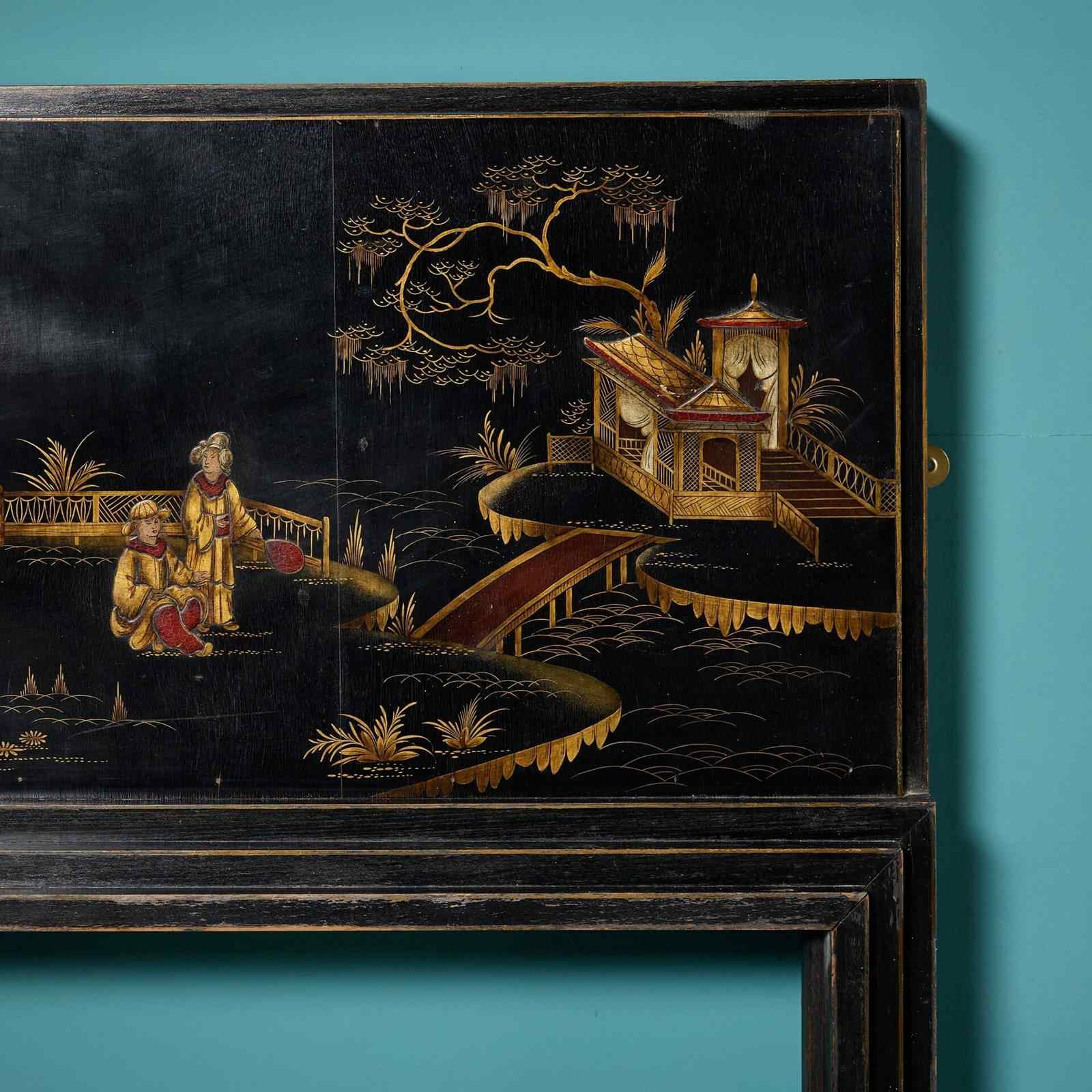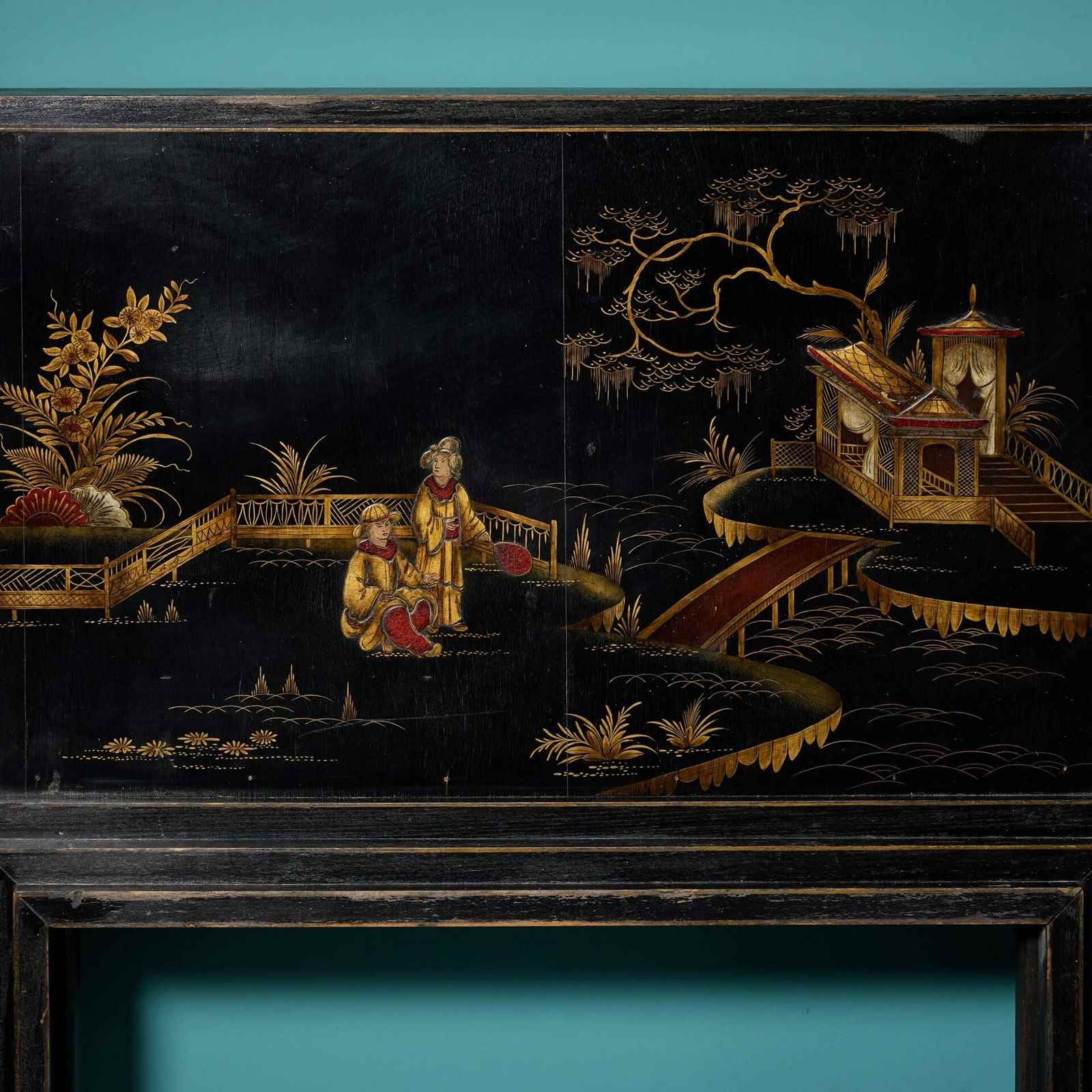 A highly ornate narrow chinoiserie painted fire surround, dating from the 1920s. Streamline in design, this impressive Japanned fireplace will make a stunning feature in interiors of any style or size, the black painted hardwood a striking canvas for the intricate handpainted chinoiserie style embellishments.