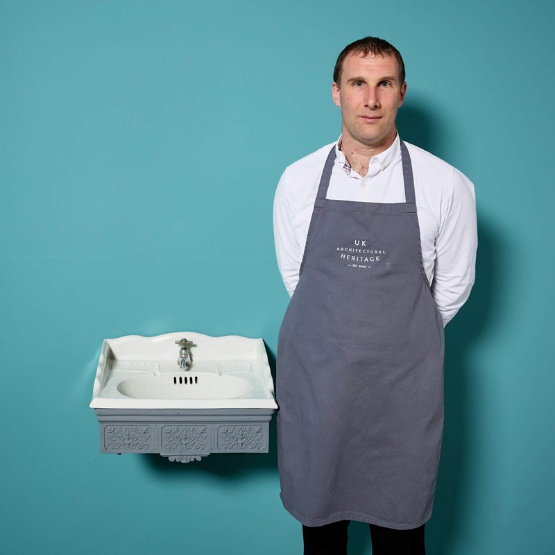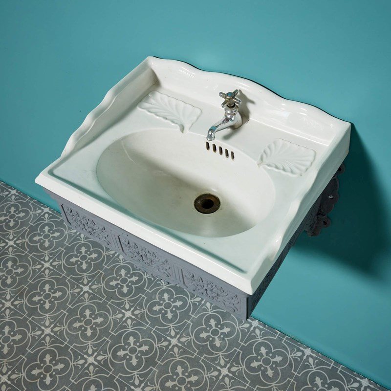 This reclaimed porcelain sink basin is a character feature for any bathroom, unusually fitted with one singular tap hole, which currently features its original tap. Leaf-shaped soap dishes are complemented by statement iron wall bracket, decoratively cast with floral motifs.