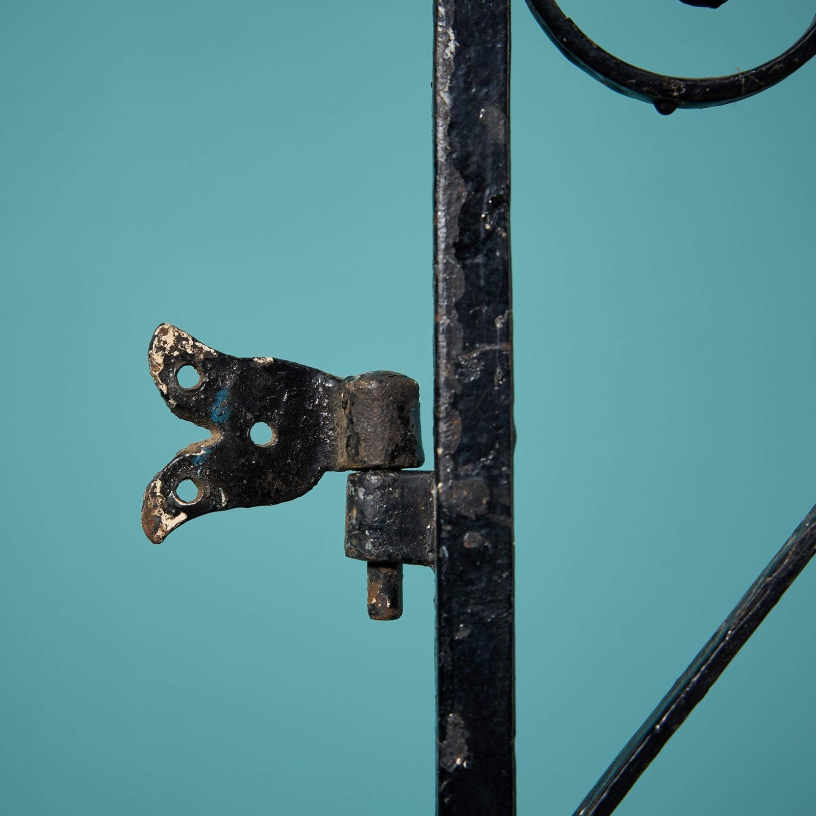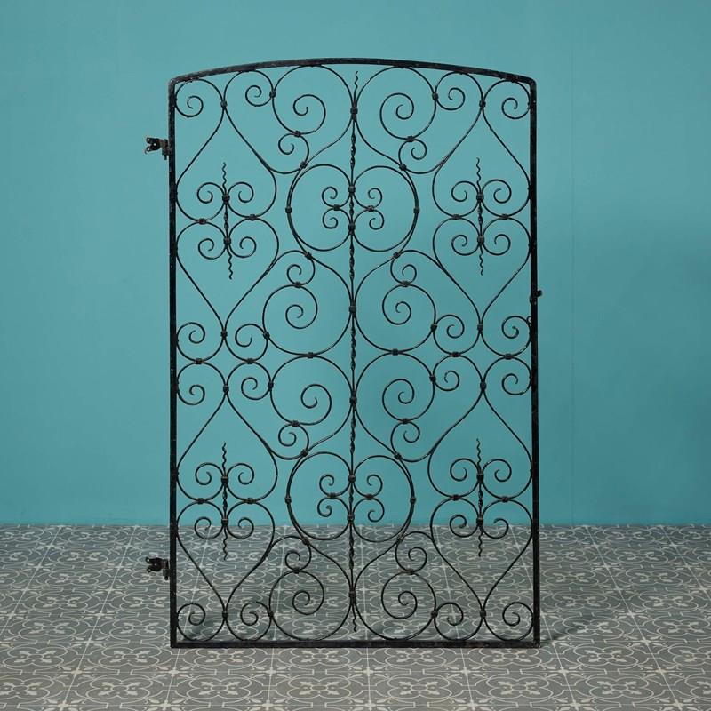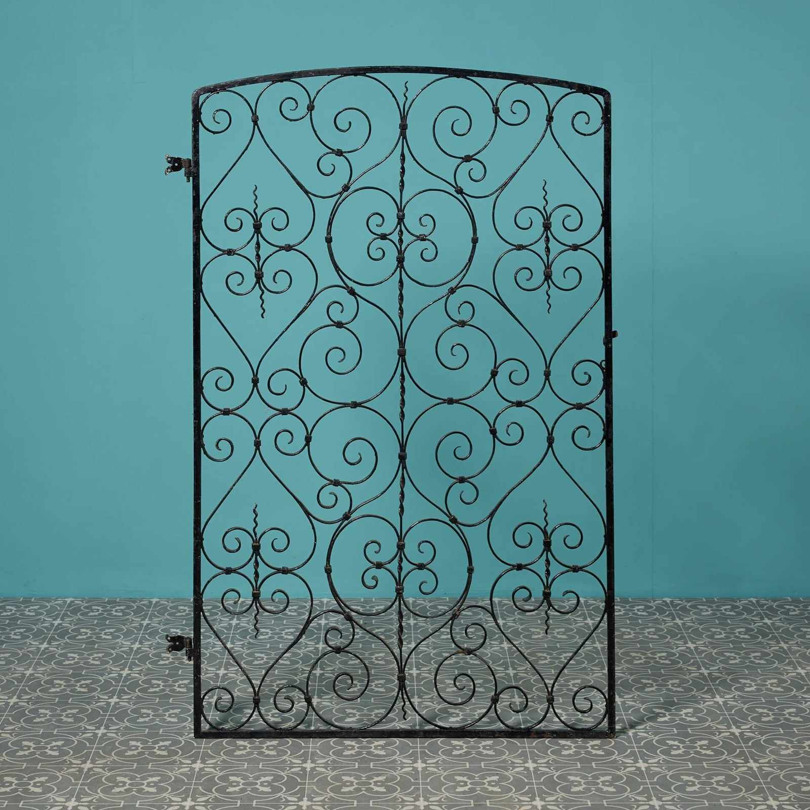 A well-constructed and finely made Victorian wrought iron garden gate, intricately handcrafted with ornate repeating scrollwork. Dating from the early 20th century, this simple side gate is a timeless addition to gardens of any age with its gentle arch and original fixtures.