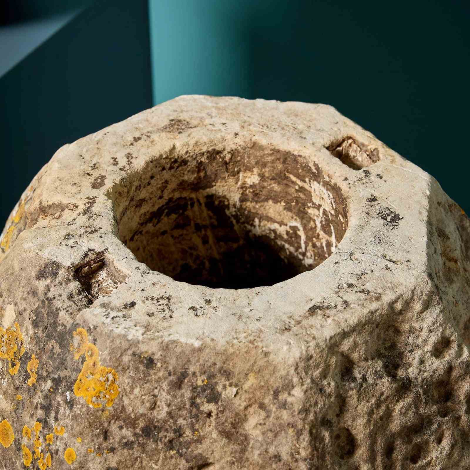 Well weathered, these were possibly formerly used as column sections or gate finials. They feature fine grain limestone, carved with an ornate belt around the middle and hollowed out centres.