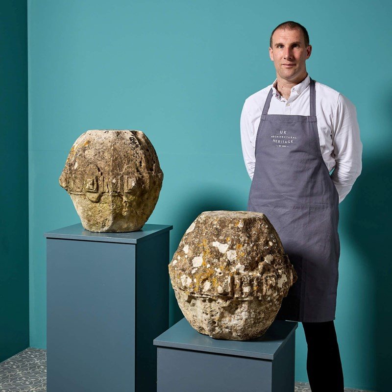 An interesting pair of 17th century limestone gate finials sourced from Canterbury.