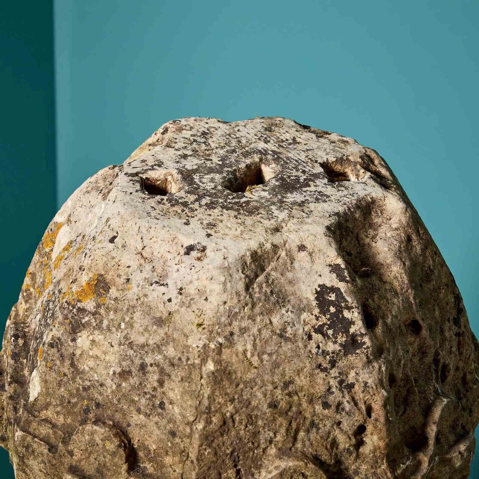 Well weathered, these were possibly formerly used as column sections or pier finials. They feature fine grain limestone, carved with an ornate belt around the middle and solid construction.