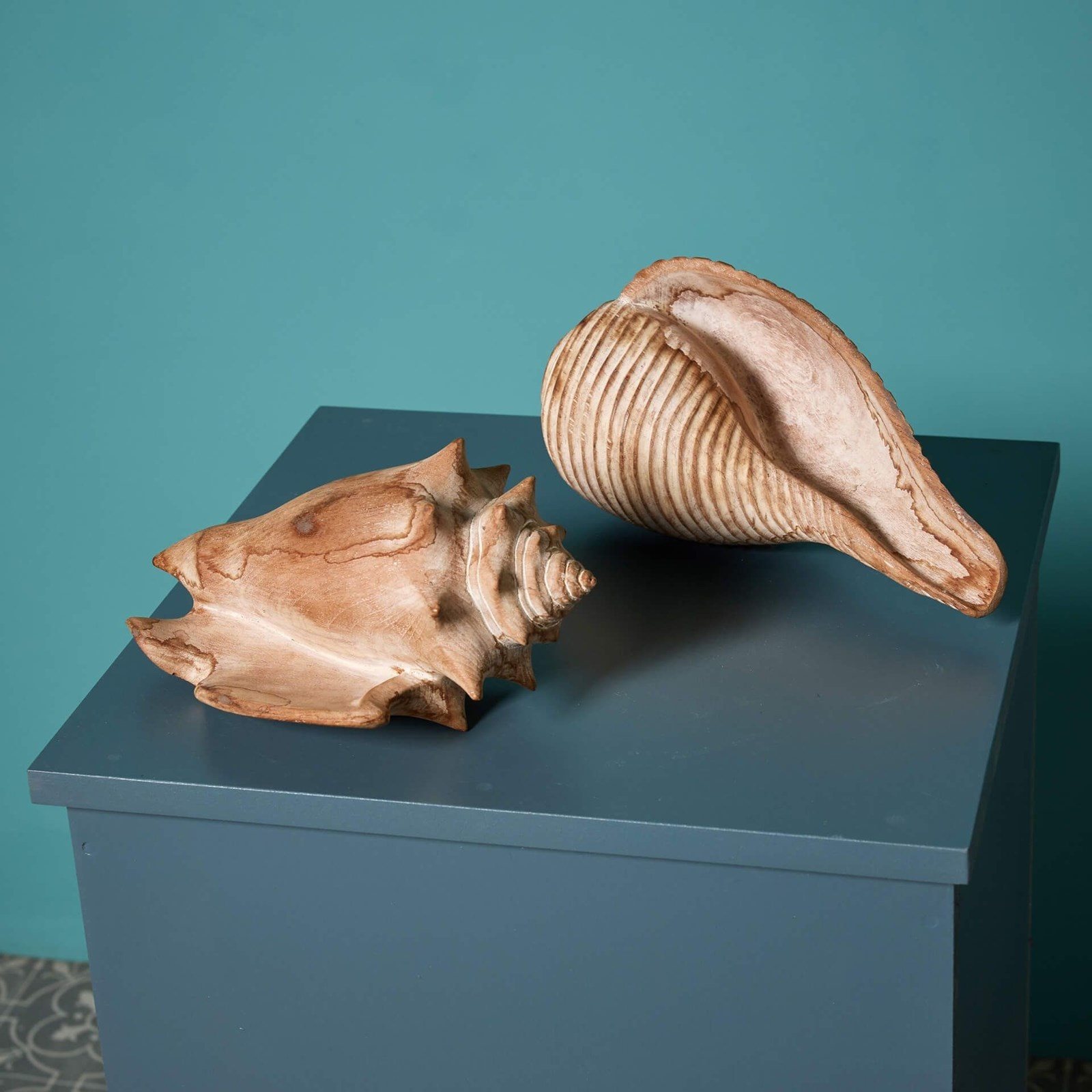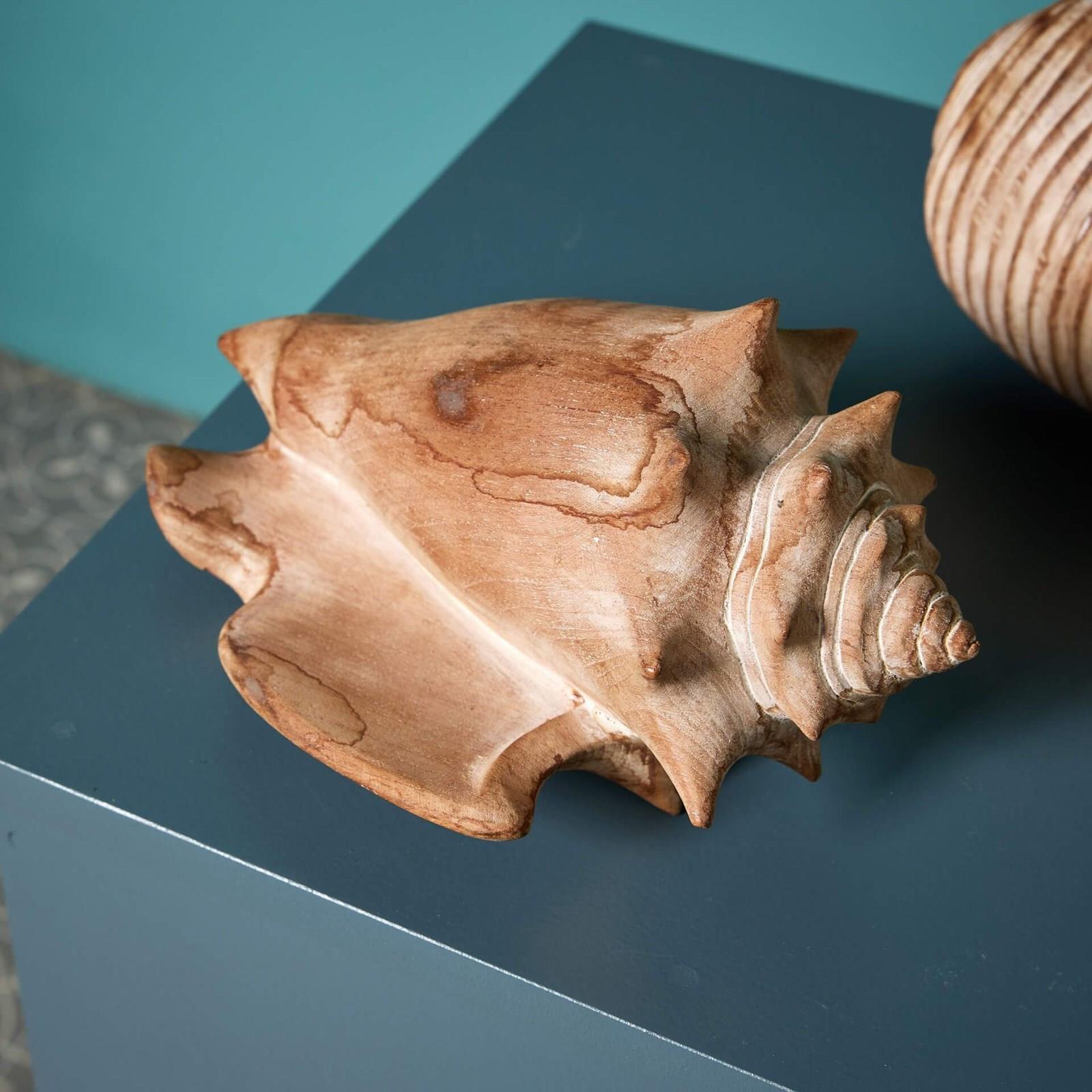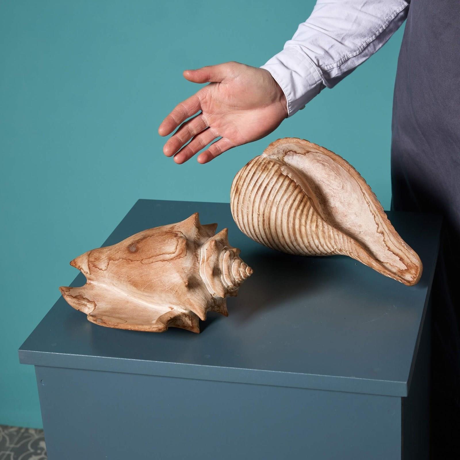 In an impressive scale, these wooden decorative pieces are depictions of a conch (left) and fig shell (right), showcasing details of the original subjects, from the curved pigmented layers to the horned ends.