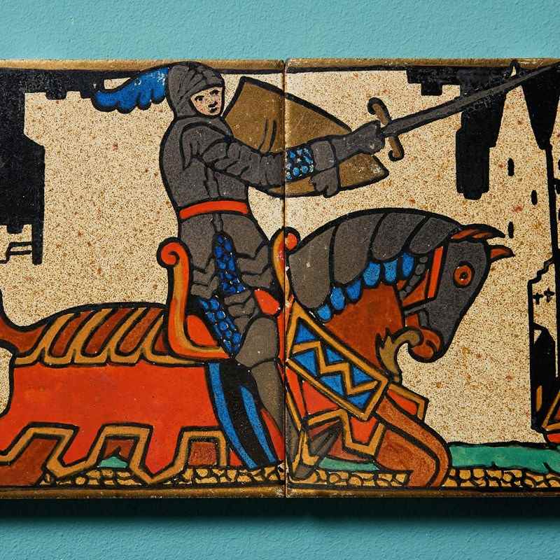 Modelled in relief, these deeply cast 5-inch tiles display a classically dressed jousting knight on horseback in striking colourful glazes, in front of a castle in buff on a deep black background with gold edging. Together the pair create this impressive medieval scene.