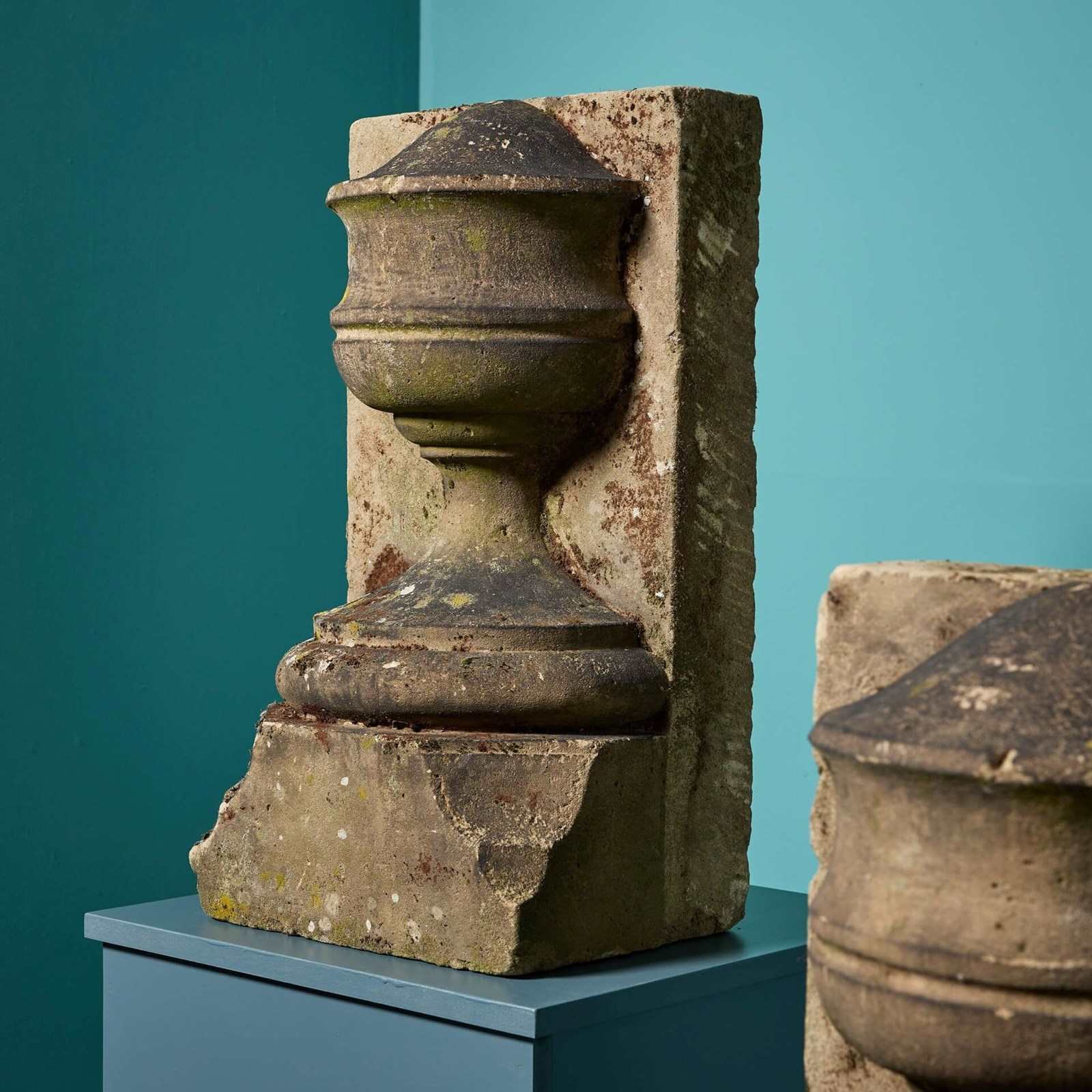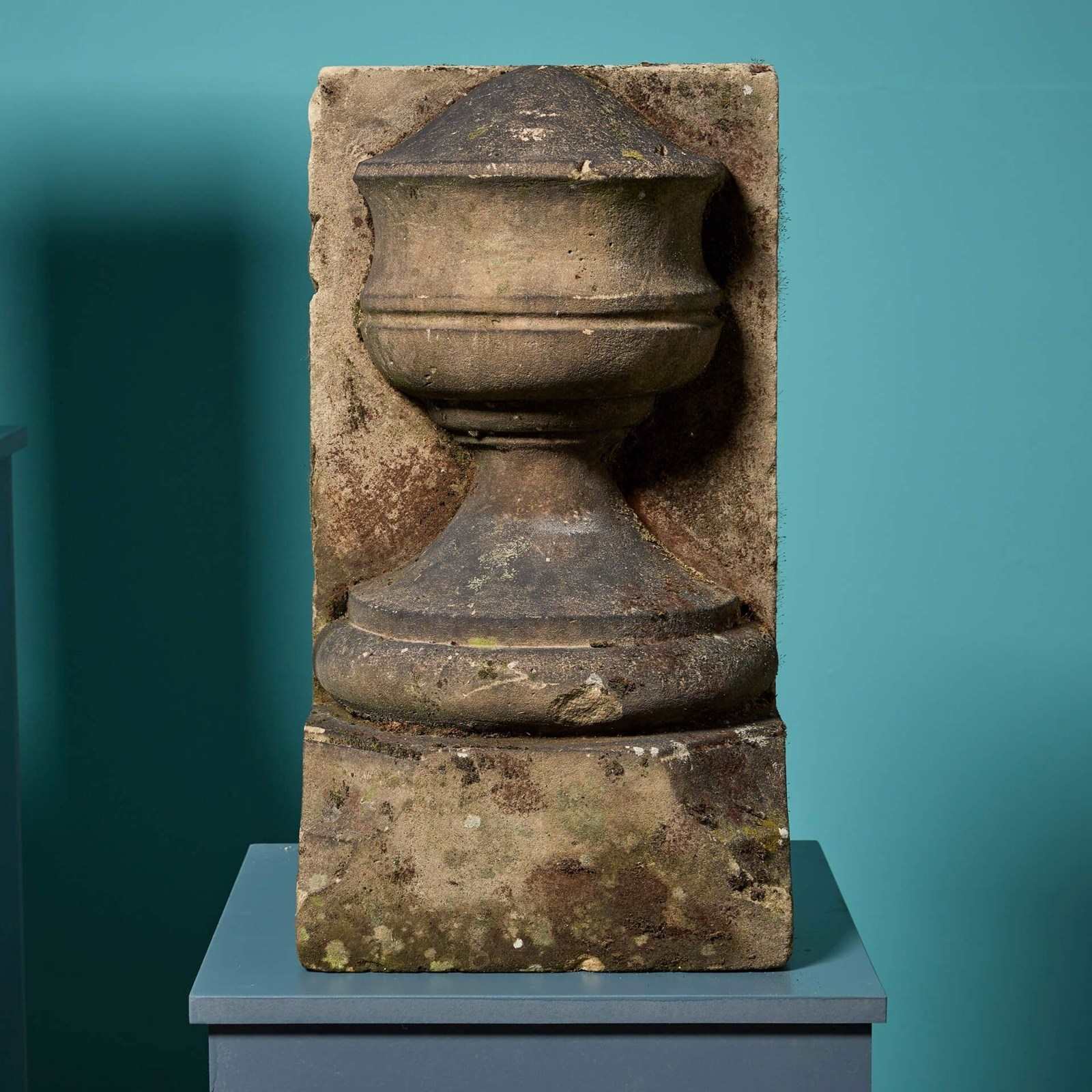 A pair of reclaimed York stone urn stop finials, well-weathered with moss and lichen. Dating back to circa 1800, these ornate antique finials will add an air of grandeur to any property, making striking architectural features of a garden or building facade.