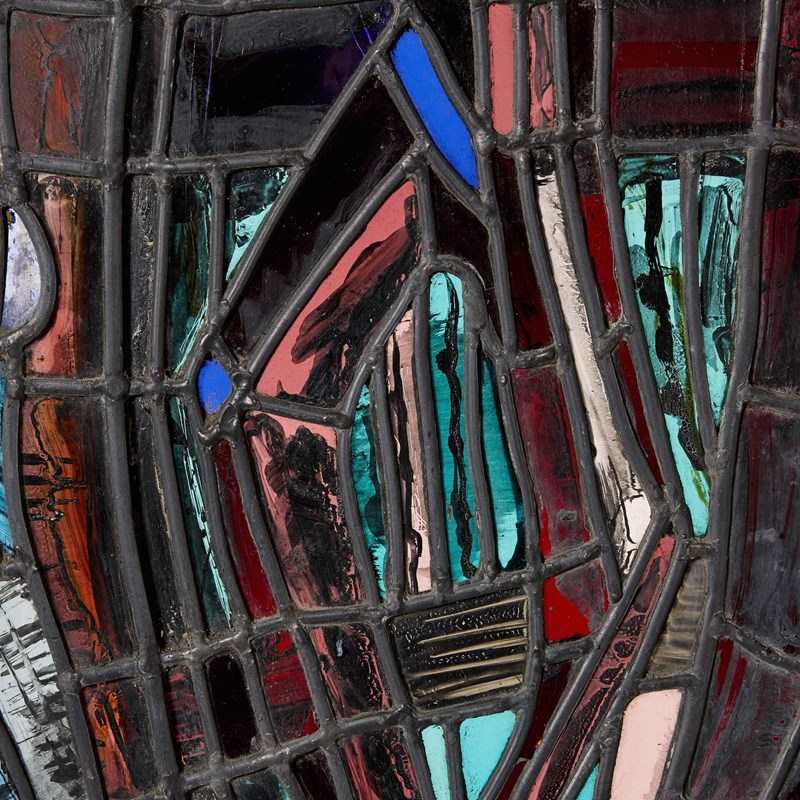 A figurative stained glass window from the studio of Patrick Reyntiens (1925-2021). Attributed to the artist, this stained glass panel depicts an abstract design with hand painted details around what appears to be a central figure. It is one of various stained glass panels we are selling from the studio of the artist.